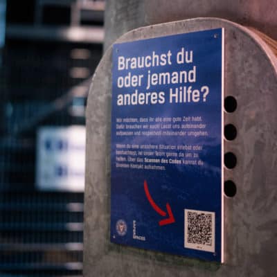 Du kannst das Awareness-Team, erkennbar an den lila Westen, jederzeit im Stadion ansprechen oder über das Einscannen der QR-Codes zu dir rufen. Schilder mit den entsprechenden QR-Codes findest du sowohl im Heim- als auch im Gästebereich, an den Blockaufgängen, Verkaufsständen und Toilettenkabinen.