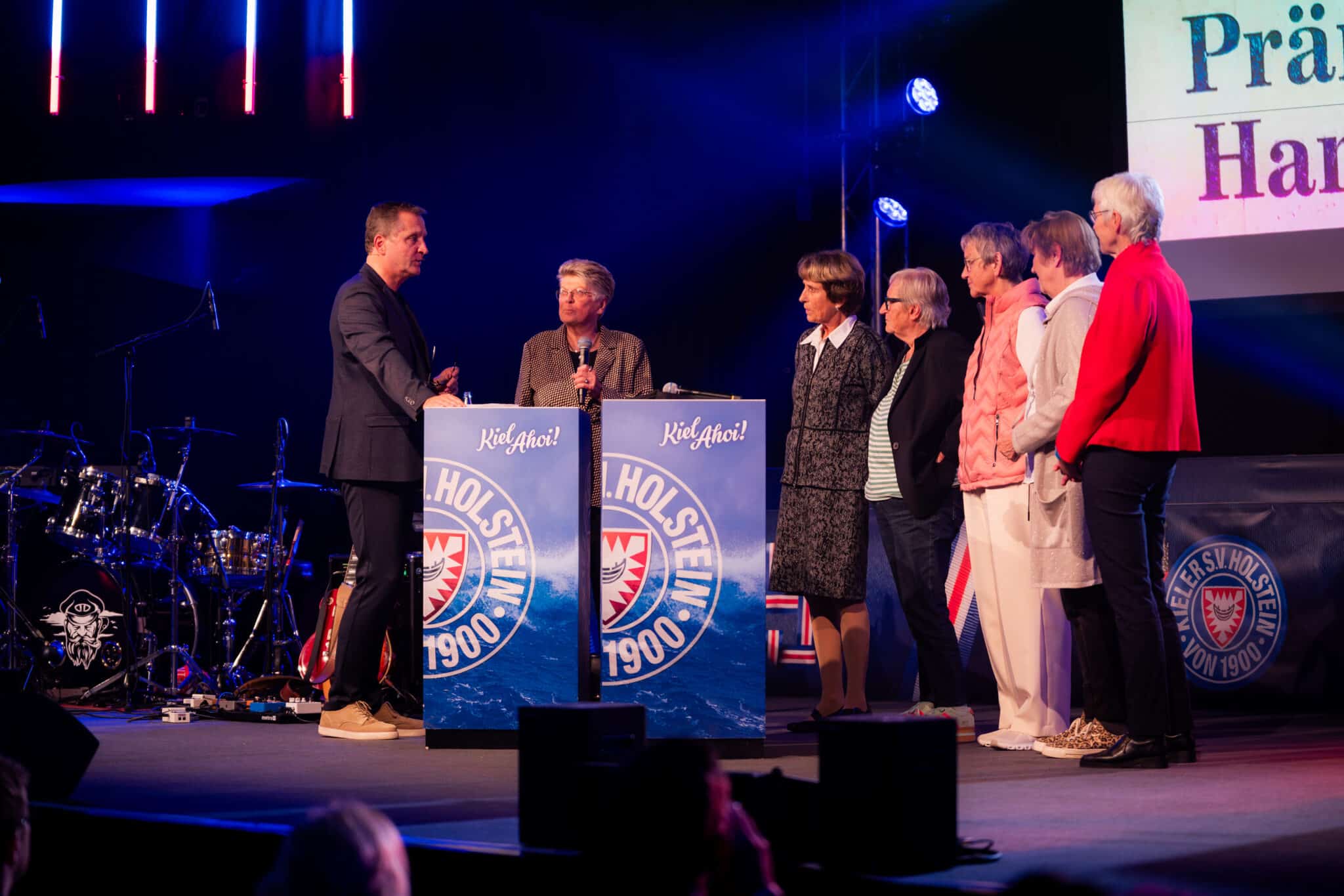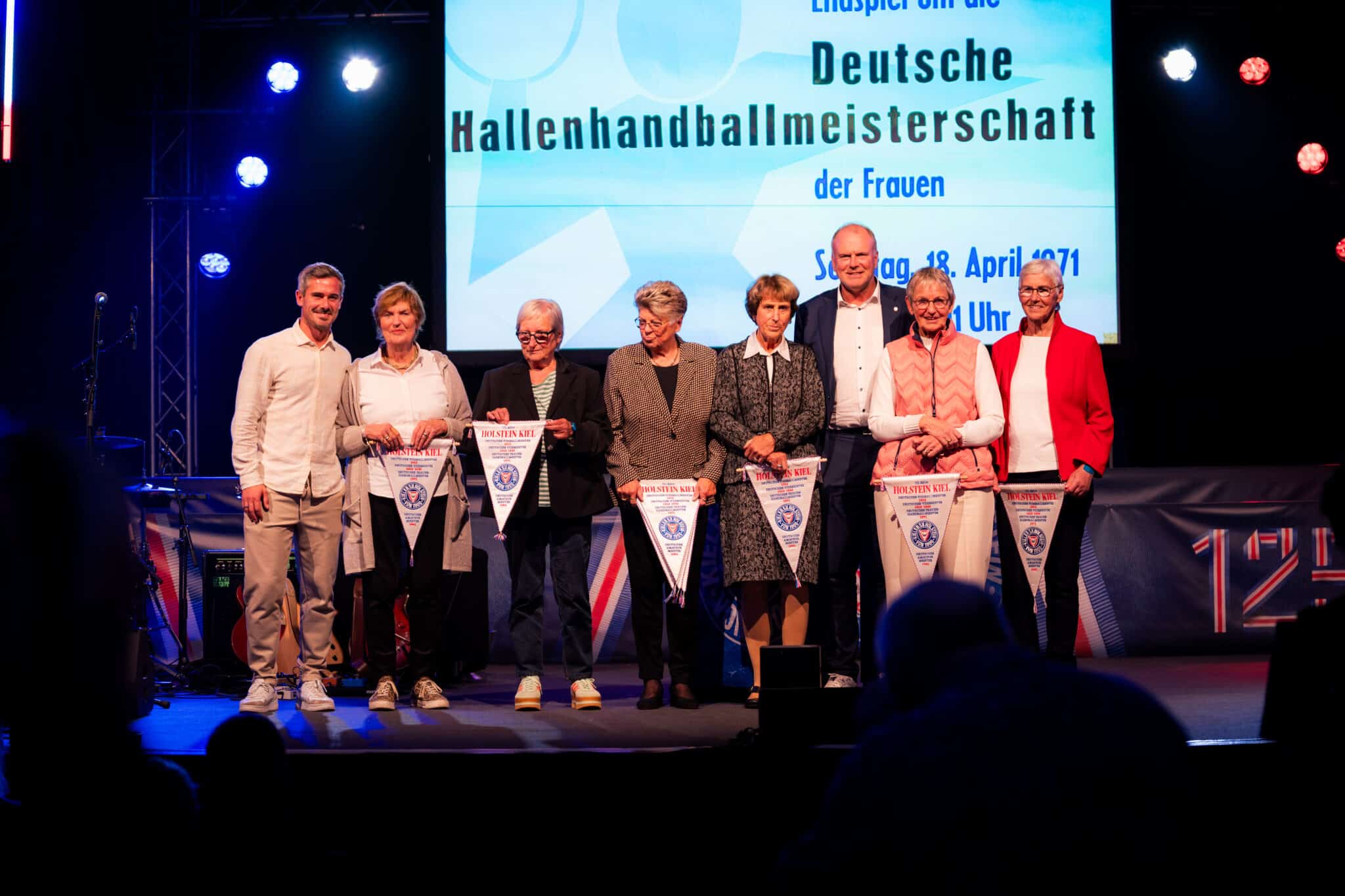 Vor einem halben Jahr wurde den Handballerinnen eine weitere Ehre zuteil. Im Rahmen der Jubiläumsgala in der Hebbelschule überreichten Fin Bartels, Enkel des Trainers, sowie Wolfgang Schwenke, kaufmännischer Geschäftsführer unserer KSV und selbst ehemaliger erfolgreicher Handballer, je einen Wimpel an die deutschen Handballmeisterinnen von 1971.