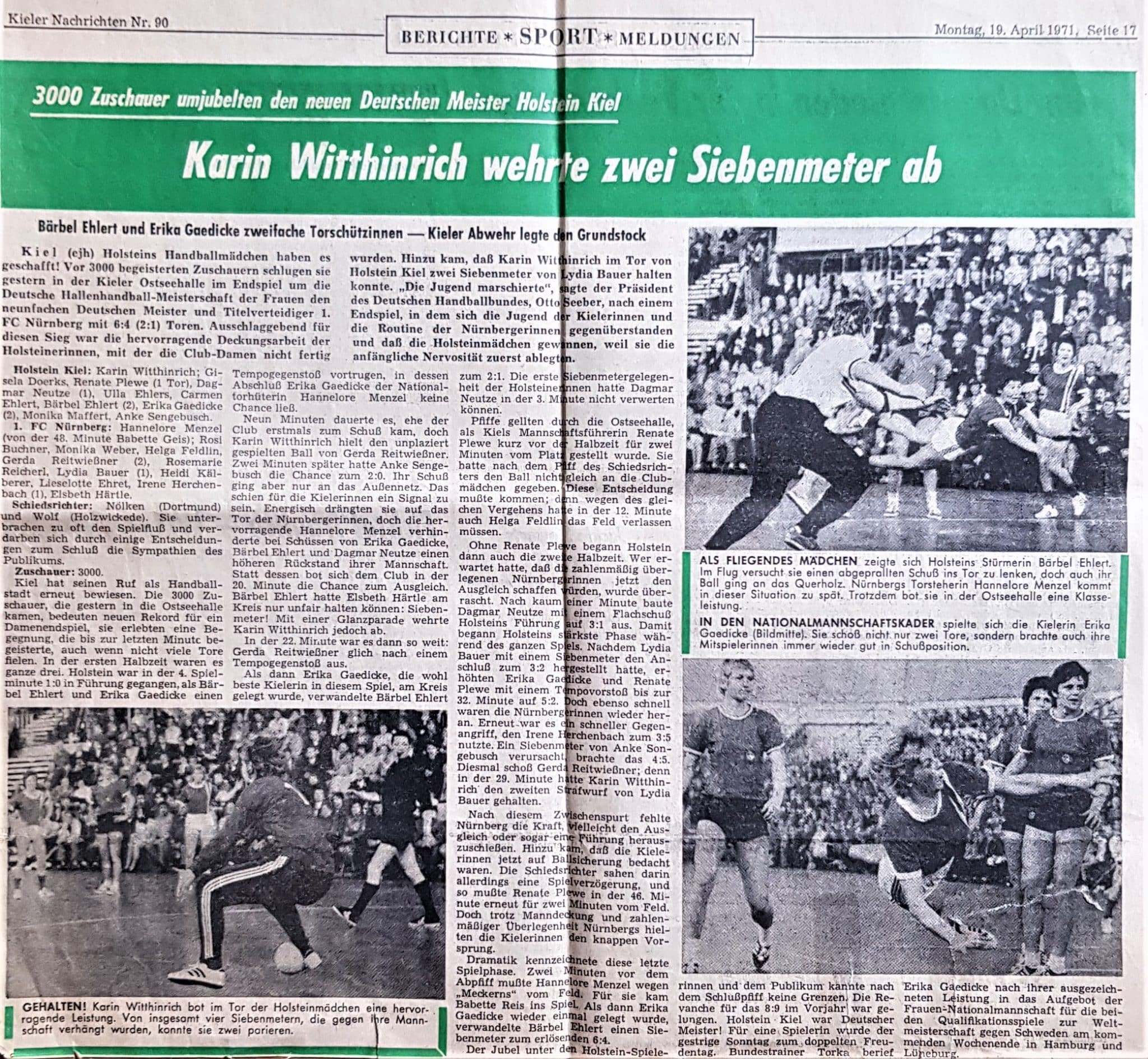 Der Sonntag begann im Zeichen der Aufregung. 3.000 Zuschauer wollten dem Finale beiwohnen. „Wir sind damals zur Ostseehalle gefahren und haben uns gedacht: Das kann doch nicht sein, da stehen so viele Leute, die wollen alle zu unserem Spiel?“, blickte Erika Wohlert (Mädchenname Gaedicke) auf der Jubiläumsfeier zum 125. Geburtstag unserer KSV zurück. Doch die Spielerinnen ließen sich nicht beirren und konnten mit einer knappen Führung in die Schlussphase gehen. Zwei Minuten vor Schluss erzielte Bärbel Ehlert per Siebenmeter das erlösende 6:4 zum Endstand. Der Titel war den Kielerinnen nicht mehr zu nehmen. Für eine nun Deutsche Meisterin wurde der Titel zum doppelten Freudentag. Nach ihrer ausgezeichneten Leistung berief Bundestrainer Helmut Torka Holsteins Doppeltorschützin Erika Wohlert in das Aufgebot der Frauen-Nationalmannschaft für die beiden WM-Qualifikationsspiele gegen Schweden.