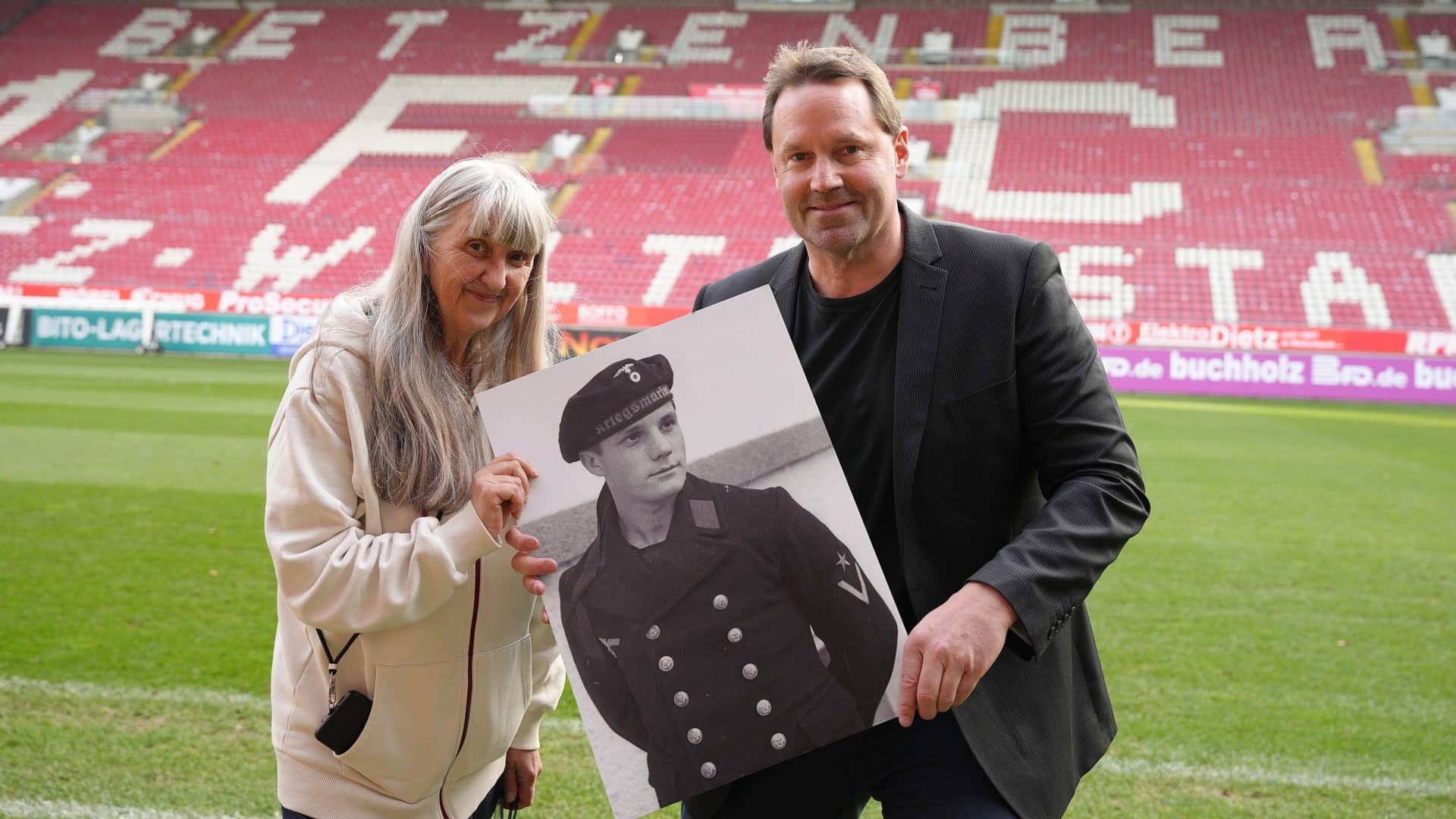 FCK-Museumskuratorin Stefanie Werner und Holsteins Clubhistoriker Patrick Nawe mit einem Porträt von Ottmar Walter von 1943.