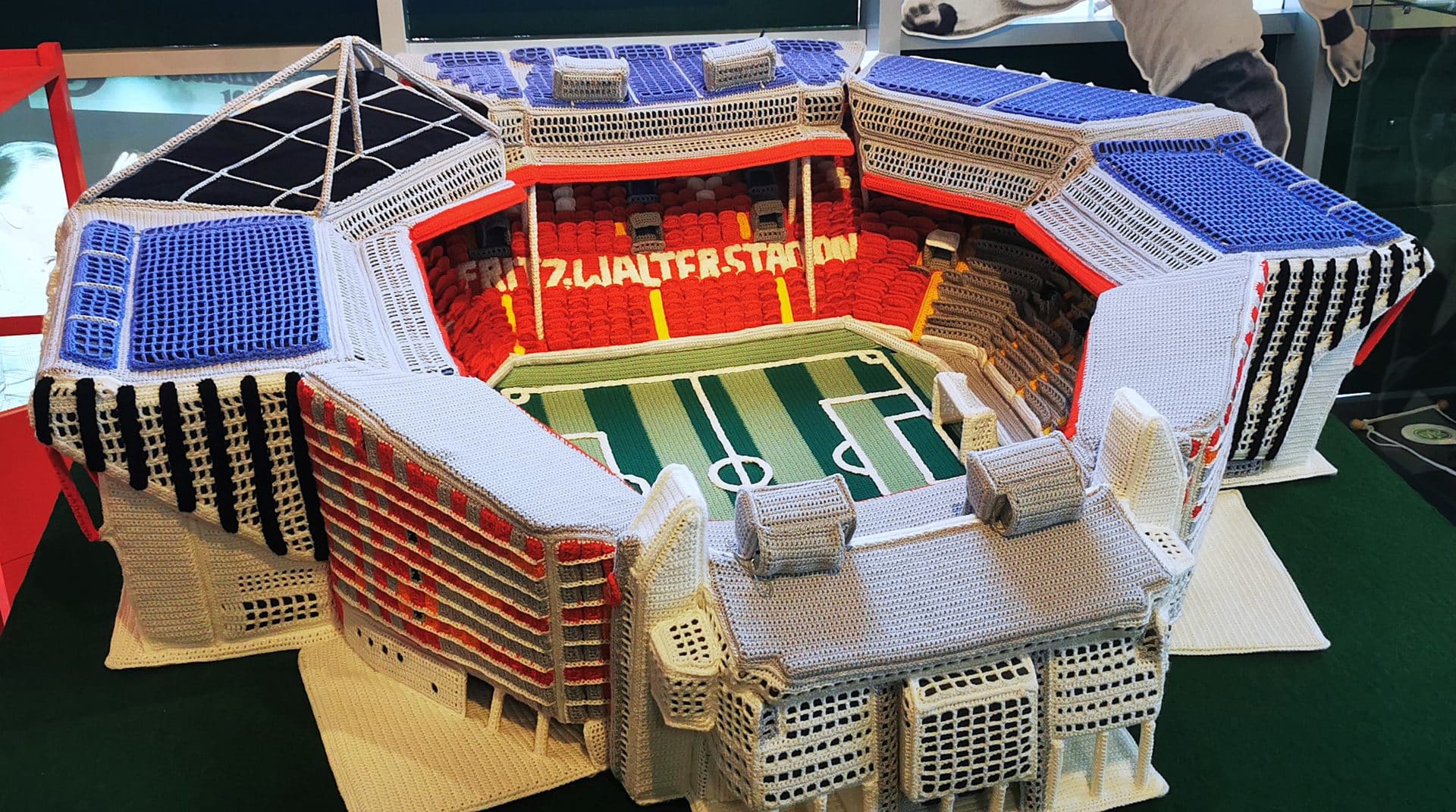 Ein gehäkeltes Fritz-Walter-Stadion im Vereinsmuseum in Kaiserslautern.