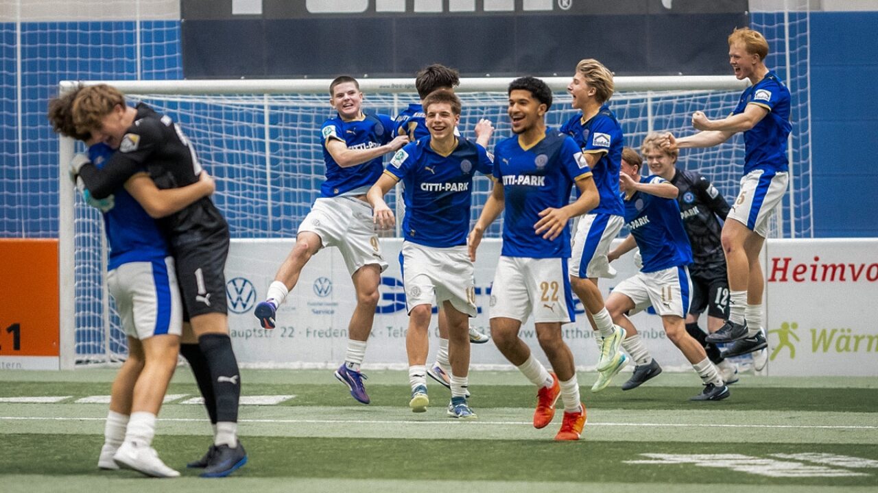 Vor rund 800 Zuschauerinnen und Zuschauern in der Sporthalle in Stade lieferte sich Holsteins U17, die zudem vier Spieler aus der U16 im Kader hatte, bereits in der Gruppenphase spannende Duelle. Die Jungstörche gewannen ihr Auftaktspiel gegen den Eimsbütteler TV mit 3:0, ehe eine umkämpfte und knappe 2:3-Niederlage gegen den F.C. Hansa Rostock folgte. „Wir haben uns etwas schwergetan, richtig reinzukommen. Anfangs waren wir noch zu hektisch und wild in unseren Abläufen. Von Partie zu Partie haben wir es dann aber immer besser gemacht“, berichtete U17-Cheftrainer Maximilian Grobler nach dem Turnier.