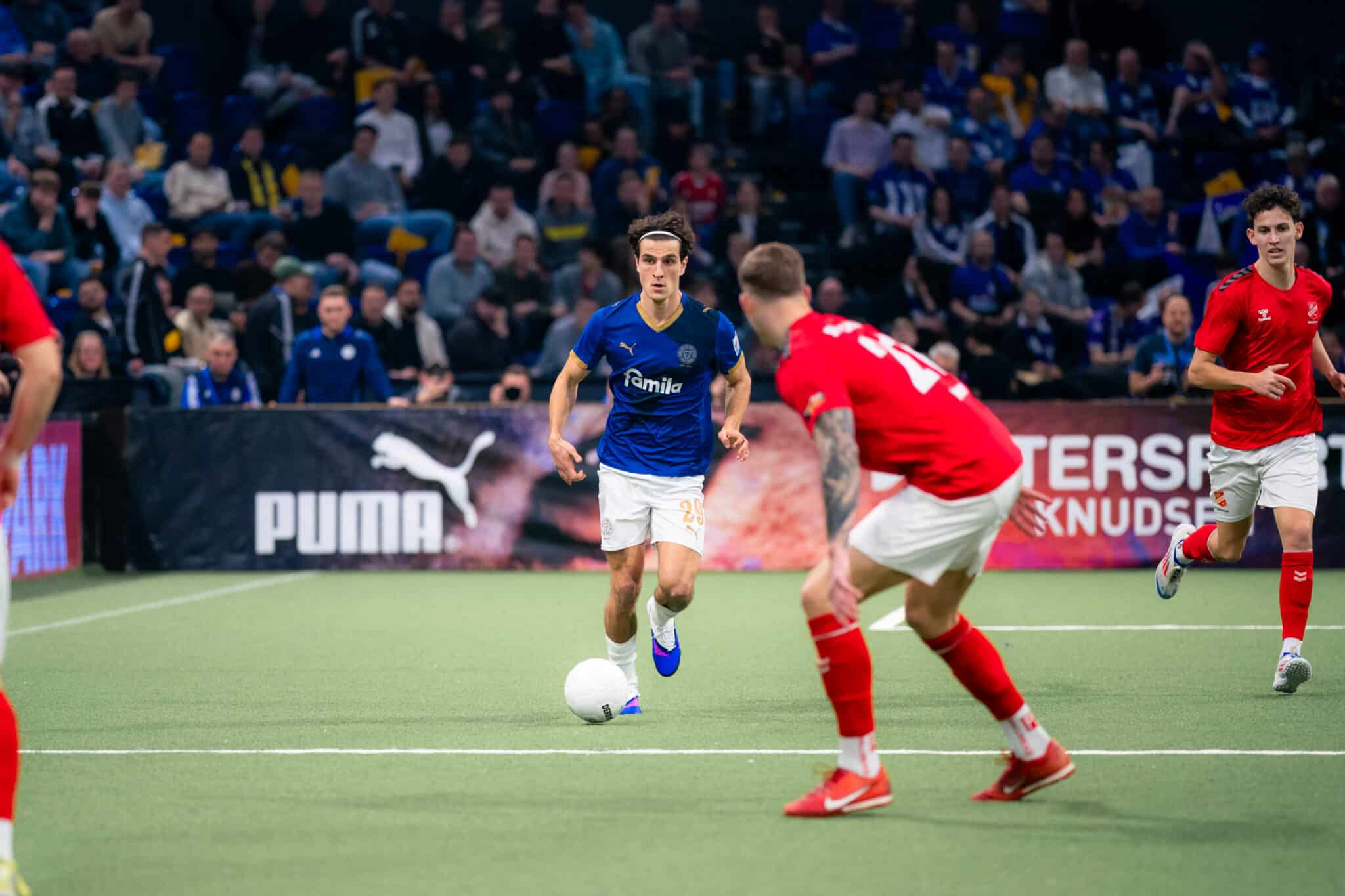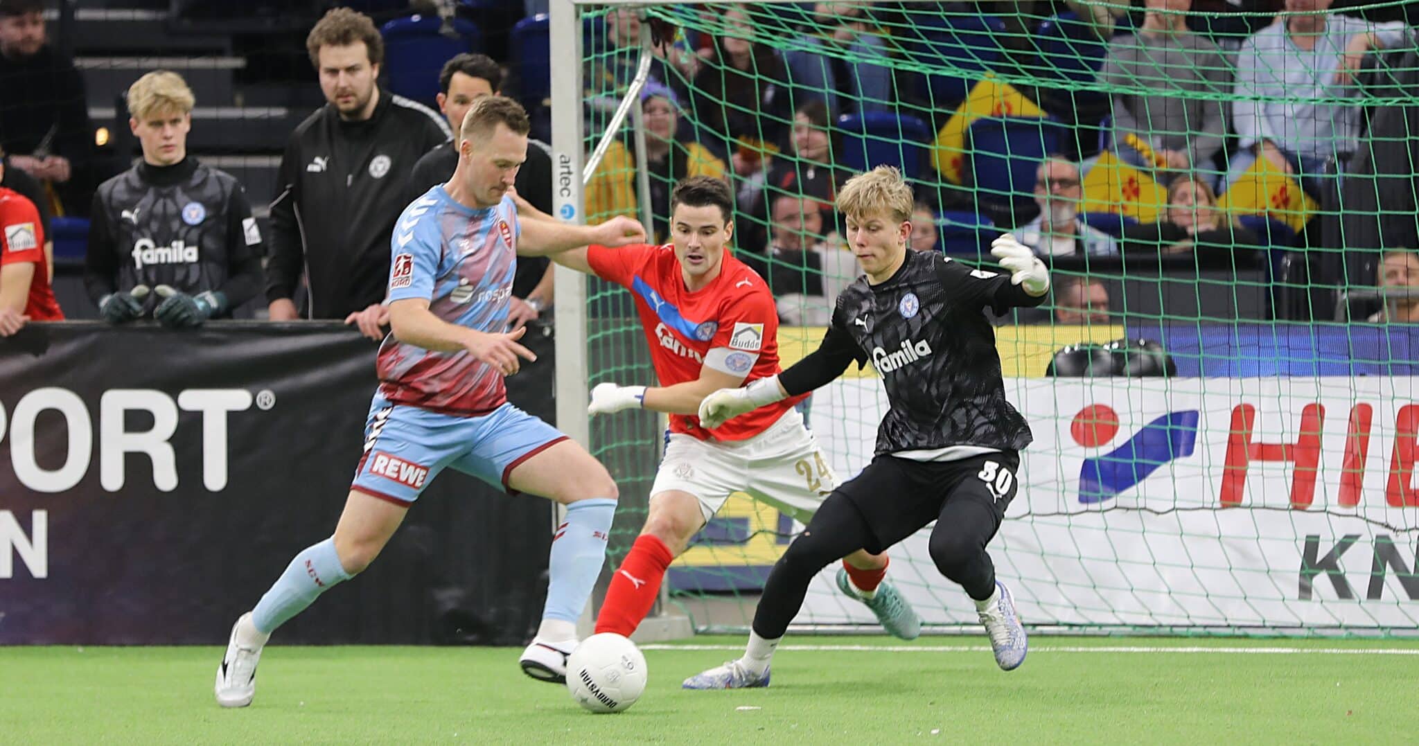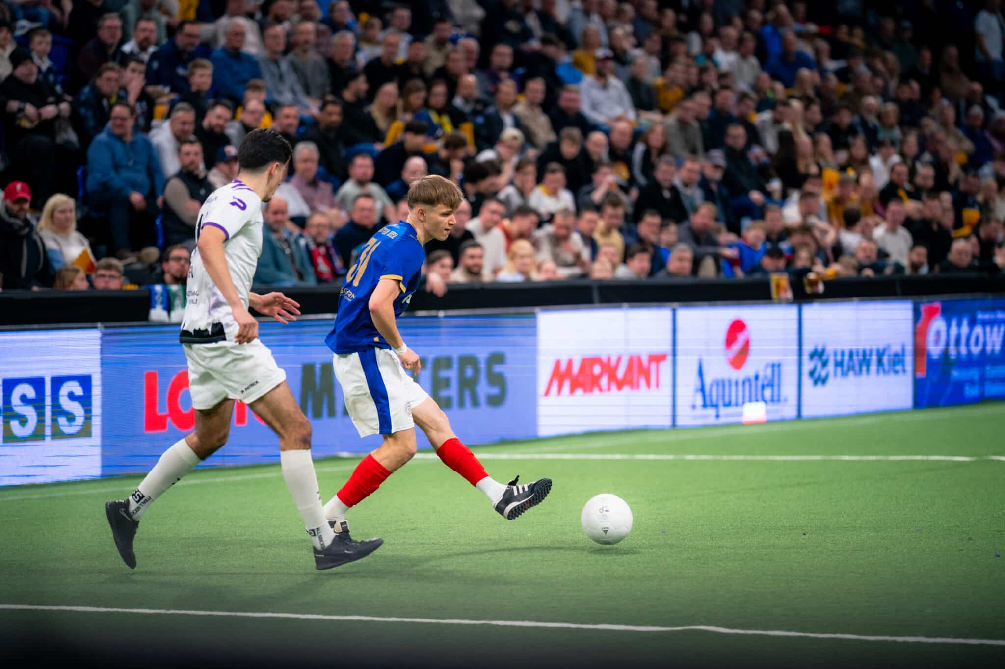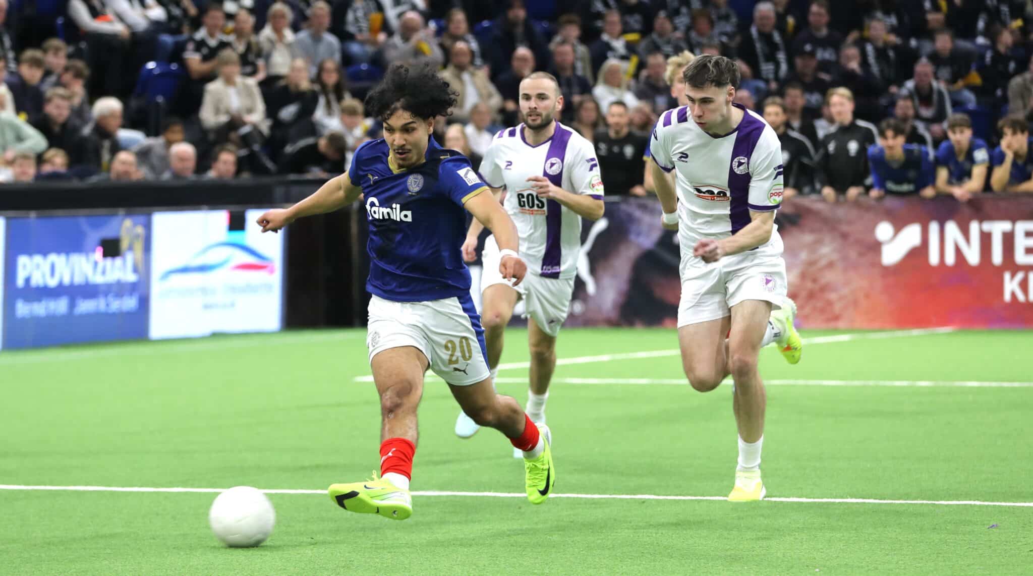 Richtig torreich wurde es, als unsere Jungstörche das erst Mal auf dem Platz standen. Im Auftaktspiel gegen den SV Eichede gelang ihnen ein 3:2-Sieg – eingeleitet von einem Traumtor aus der Distanz an den Innenpfosten von U23-Routinier Laurynas Kulikas. Die weiteren Treffer erzielten Islam Matene und Jorden Winter. Auch im zweiten Spiel von Holsteins Nachwuchs zappelte regelmäßig das Netz: In einem umkämpften Duell mit dem Regionalligisten SC Weiche Flensburg 08 jubelten am Ende dank eines 4:3-Erfolgs unsere Jungstörche, bei denen Kulikas einen Doppelpack schnürte und Matene und Felix Boelter ebenfalls trafen. Durch diese beiden Siege sowie die Ergebnisse der Konkurrenz hatte unser Nachwuchs bereits vorzeitig den ersten Halbfinaleinzug seit 2018 sowie den Gruppensieg sicher. Das letzte Gruppenspiel verloren unsere Jungs mit 1:2 gegen den SV Todesfelde, der dadurch unserer von Co-Trainer Linus Schewior betreuten Mannschaft ins Halbfinale folgte.