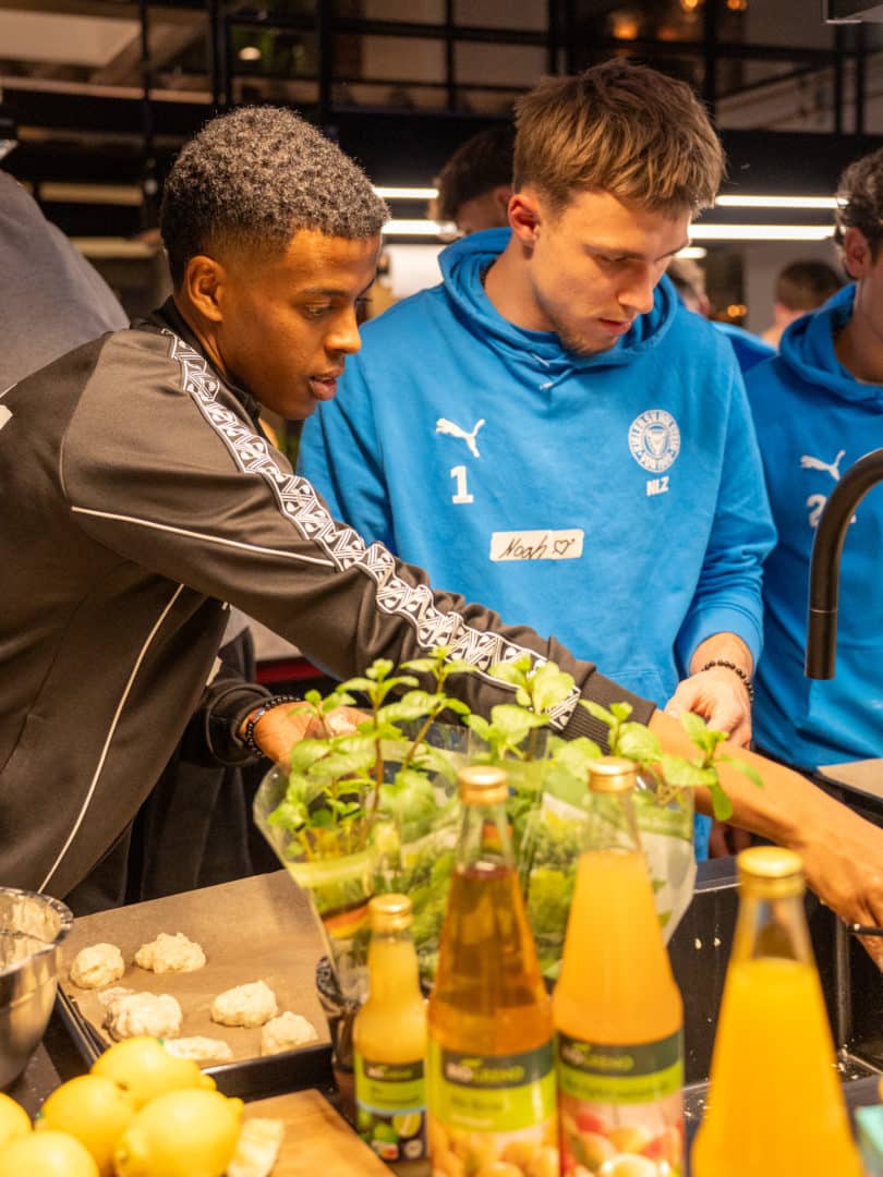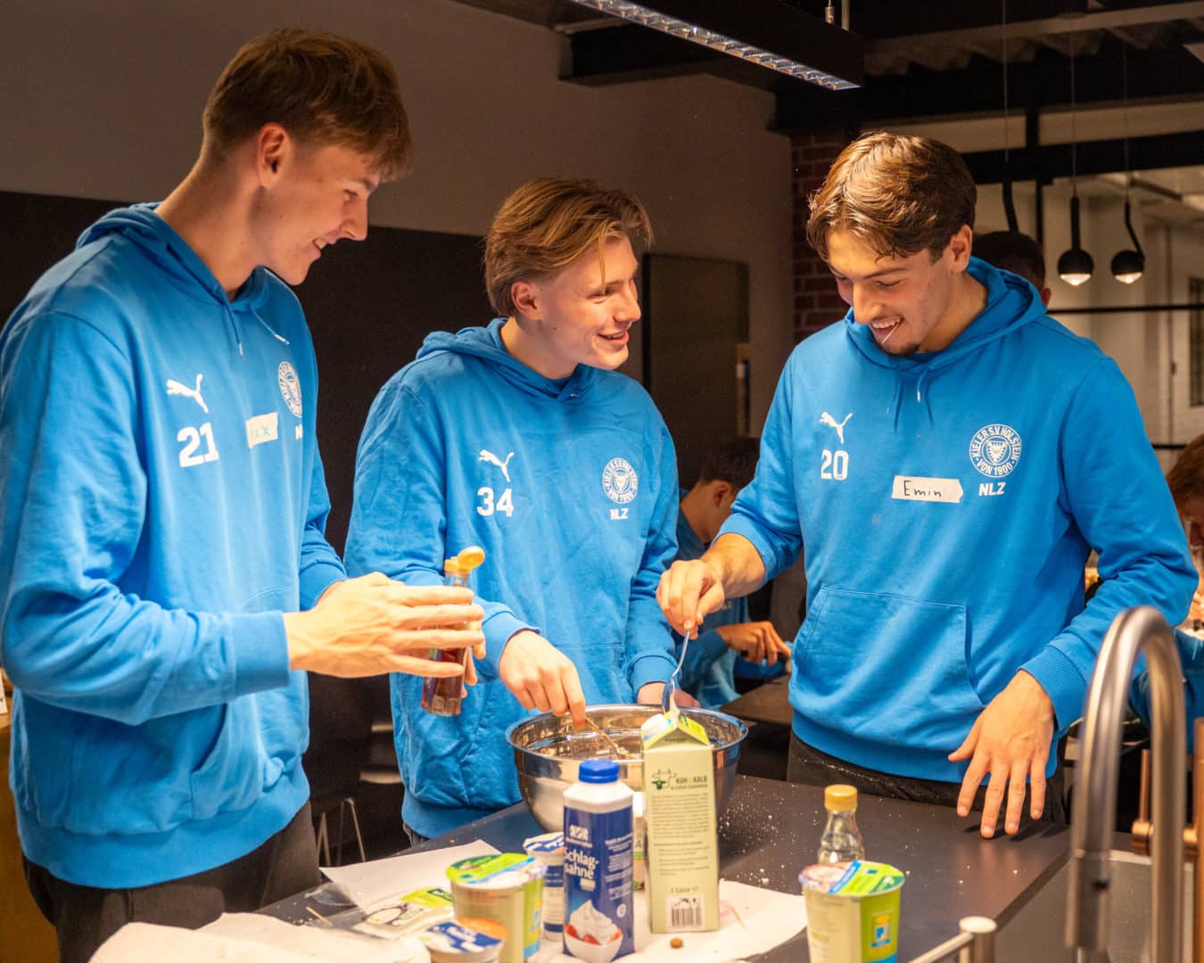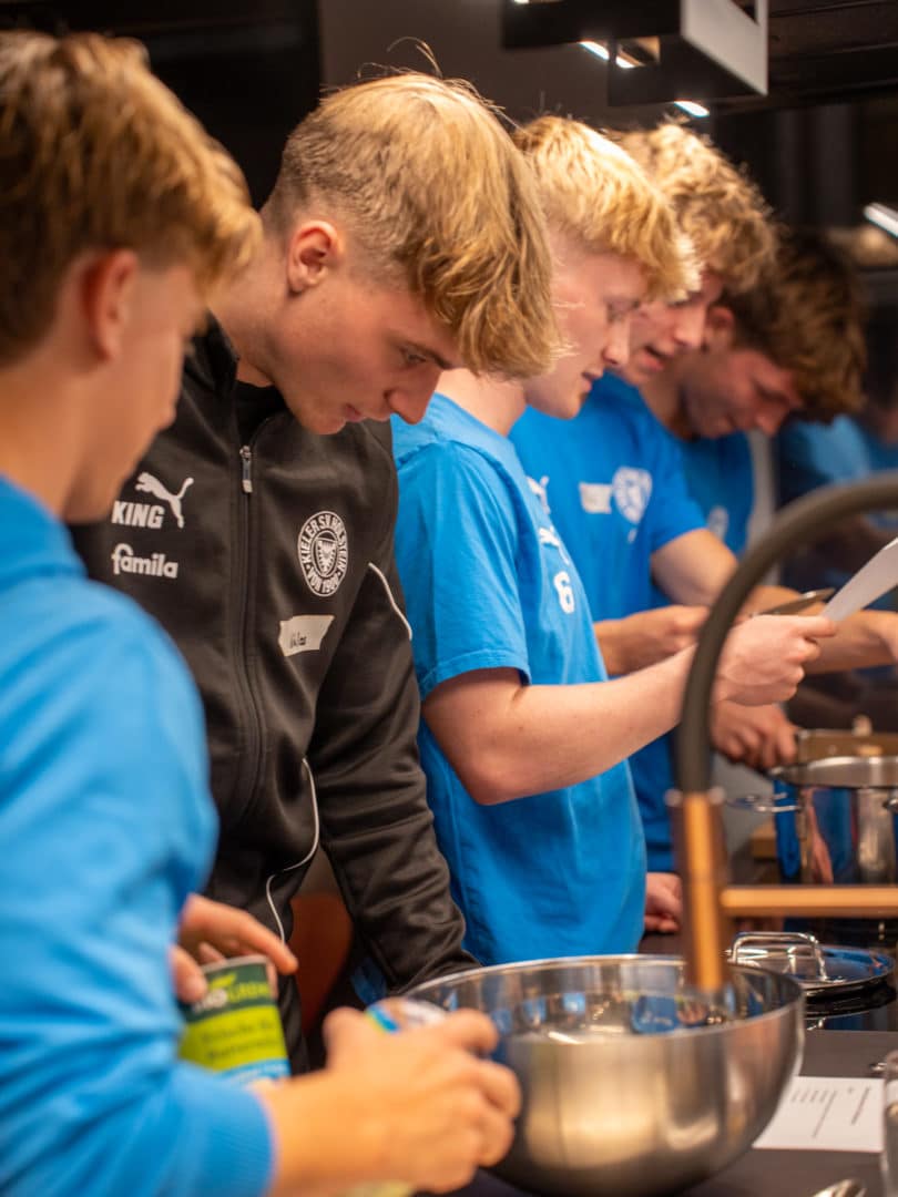 „Nach einem kleinen Wissensinput ging es direkt an den Herd, um ein paar gesunde Alternativen auszuprobieren. Man merkt, dass einige schon geübter sind als andere, aber vor allem hatten alle großen Spaß“, sagte Eike Selonke, Vertreter der Innovationskasse. Holstein-Profi Niehoff ergänzte mit einem Schmunzeln: „Wir wurden eingeladen, gemeinsam mit der U19 zu kochen. Der Austausch lief super, meine Gruppe hat sich auch über die Unterstützung gefreut, obwohl ich meine eigenen Kochkünste eher als ‚okay‘ bezeichnen würde.”