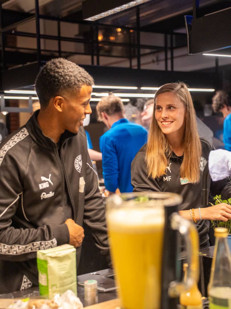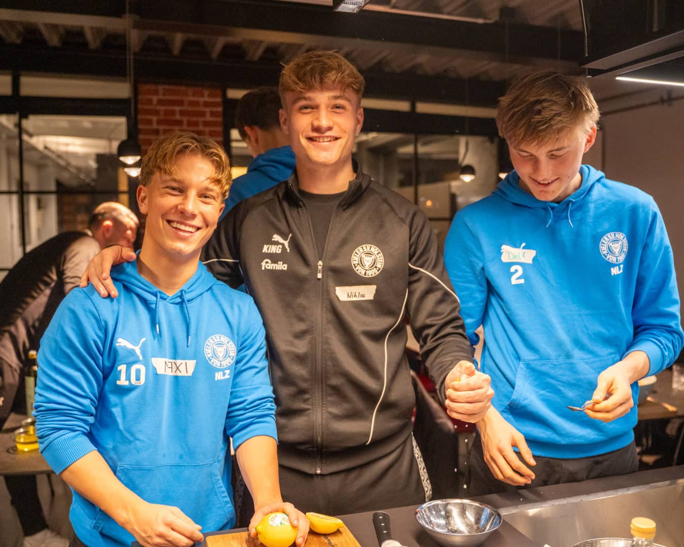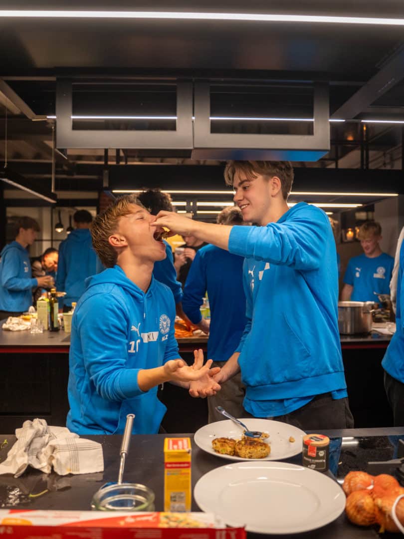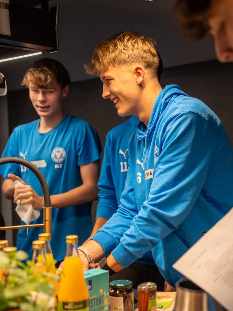 „Nach einem kleinen Wissensinput ging es direkt an den Herd, um ein paar gesunde Alternativen auszuprobieren. Man merkt, dass einige schon geübter sind als andere, aber vor allem hatten alle großen Spaß“, sagte Eike Selonke, Vertreter der Innovationskasse. Holstein-Profi Niehoff ergänzte mit einem Schmunzeln: „Wir wurden eingeladen, gemeinsam mit der U19 zu kochen. Der Austausch lief super, meine Gruppe hat sich auch über die Unterstützung gefreut, obwohl ich meine eigenen Kochkünste eher als ‚okay‘ bezeichnen würde.”