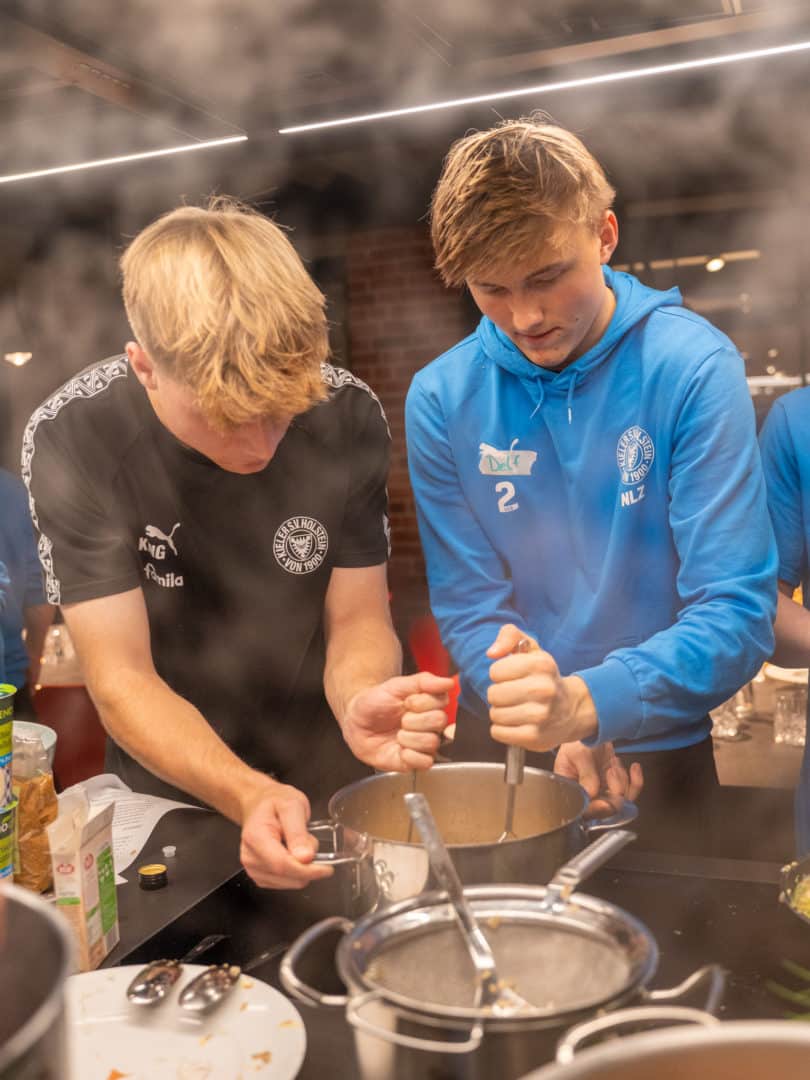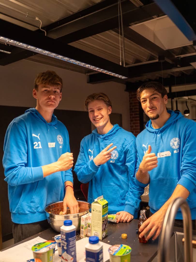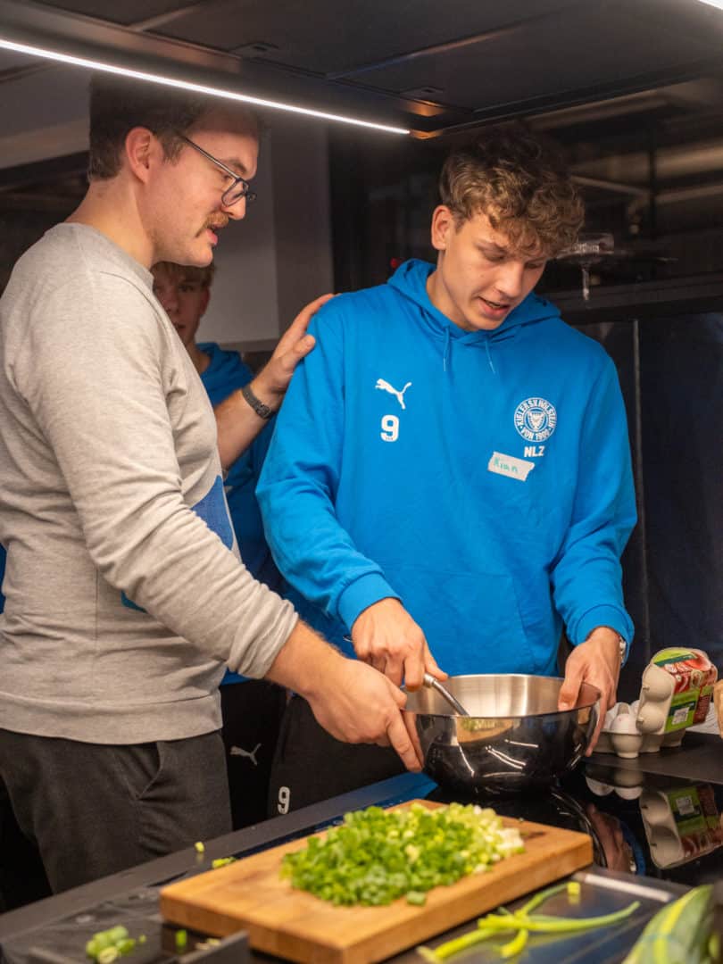 Beim diesjährigen Kochevent von Holsteins U19 gab es besonderen Besuch: Andu Kelati und Niklas Niehoff waren vor Ort und kochten gemeinsam mit unseren Jungstörchen. In regelmäßigen Abständen führt Holsteins Partner, die Innovationskasse, diese gemeinsamen Kochaktionen mit Nachwuchsmannschaften, den Holstein Women oder auch den eSportlern durch. Das Ziel bleibt dabei immer gleich: Grundlagen einer gesunden Ernährung vermitteln, neue Rezepte kennenlernen und gemeinsam Alternativen ausprobieren, die sich später gut in den Alltag integrieren lassen.