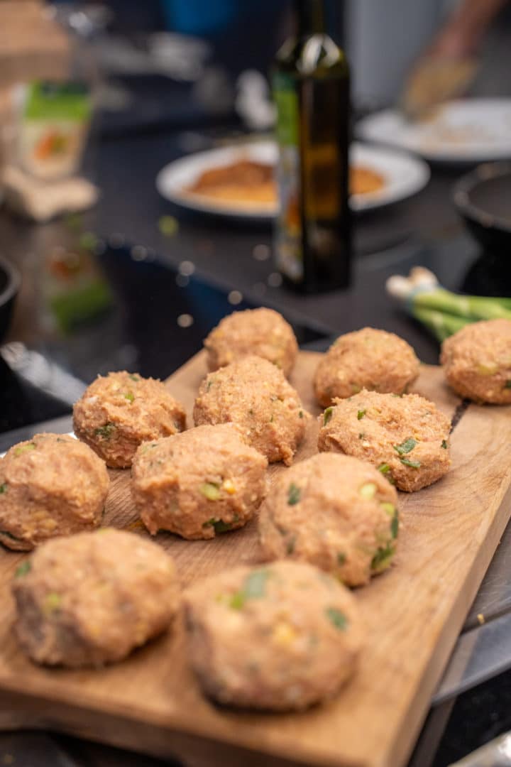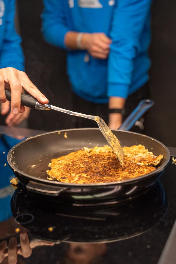 Am Mittwochabend stand wieder gemeinsames Schnippeln, Braten und Probieren auf dem Programm. Die beiden Holstein-Profis Kelati und Niehoff unterstützten unsere U19 dabei, verschiedenste Gerichte zuzubereiten. Darunter waren zum Beispiel eine Linsen-Möhren-Suppe, Haferflocken-Pfannkuchen, Quarkbrötchen mit Mandelaufstrich und Linsen-Hack-Frikadellen. Auch Getränke wurden eigens hergestellt: Eine Gruppe widmete sich frischen Ingwershots, die andere einem saisonalen, gesunden Punsch.