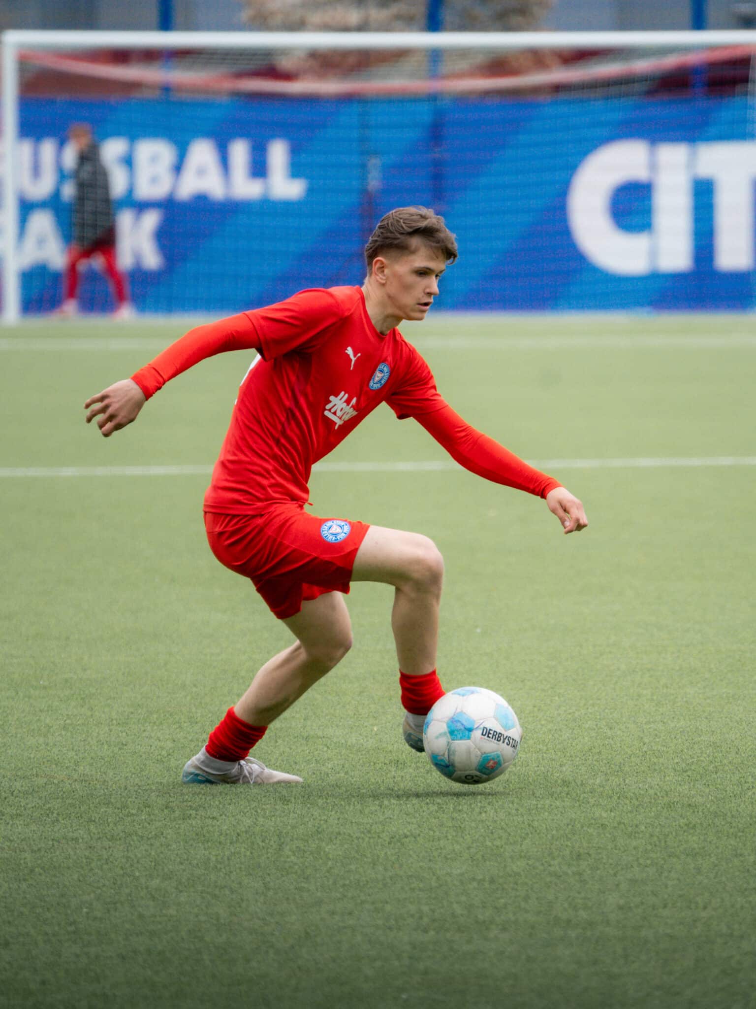 Am Samstagmorgen startete dann zum letzten Mal in der laufenden Saison die gewohnte Vorbereitung auf ein Ligaspiel, das in diesem Fall um 13 Uhr angepfiffen wurde. Mit dem FCA trafen unsere Jungstörche dabei auf Gastgeber, die noch um den Einzug in das Achtelfinale der DFB-Nachwuchsliga kämpften und sich entsprechend zielstrebig in den Zweikämpfen zeigten. Holsteins U19 gelang es dennoch, über weite Strecken der ersten Hälfte gut dagegenzuhalten. Einen Dämpfer erfuhr die engagierte Leistung dann in der 30. Minute, als ein Abstauber-Tor die Augsburger in Führung brachte. Unsere Kieler reagierten auf den unglücklichen Gegentreffer mit einer Druckphase. Vor der Pause näherten sich dabei mit Abschlüssen und Standardsituationen dem FCA-Tor mehrmals gefährlich an. „Ein Ausgleich wäre zur Halbzeit verdienter gewesen als der Rückstand“, analysierte U19-Cheftrainer Freddy Kaps den gezeigten Einsatz seines Teams.