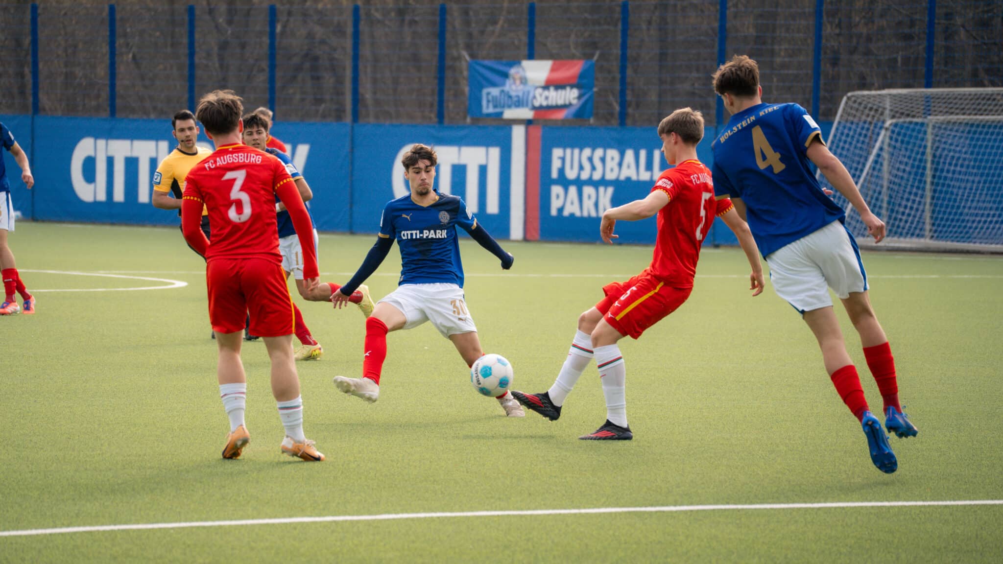 Beim Heimspiel gegen die U19 des FC Augsburg ließen sich unsere U19-Jungstörche von Beginn an nicht anmerken, dass sie zuletzt zwei deutliche Niederlagen hinnehmen mussten. Mit präsentem Auftreten und guter Zweikampfführung erarbeitete sich der Holstein-Nachwuchs stattdessen kontinuierlich Spielanteile. So entstand bereits in der ersten Hälfte ein Chancenplus für die Gastgeber. „Wir waren mit dem Ball zielstrebiger als zuletzt und kamen dadurch häufiger in gefährliche Situationen in Strafraumnähe“, lieferte U19-Cheftrainer Freddy Kaps die Erklärung für einen starken Beginn seiner Mannschaft.