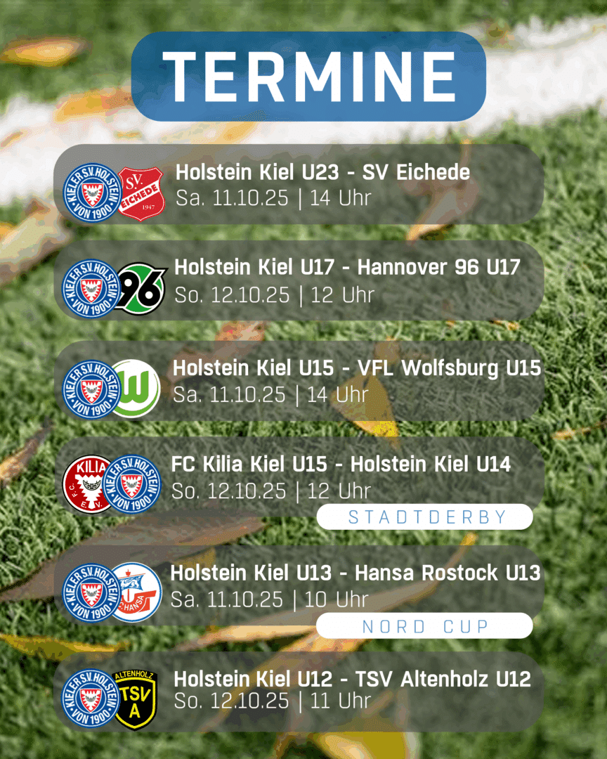 Am Samstag heißt es im CITTI FUSSBALL PARK: Dritter gegen Zweiter – unsere U23 empfängt den SV Eichede zum direkten Verfolgerduell. Darüber hinaus stehen zahlreiche weitere Heimspiele unserer Jungstörche auf dem Programm. Die U19 hat am Wochenende spielfrei, doch die U17 trifft auf den Gruppenersten Hannover 96, und die U15 misst sich mit dem VfL Wolfsburg. Auch die U12 ist vor heimischer Kulisse gegen den TSV Altenholz gefordert. Für die U14 steht das Stadtderby beim Nachwuchs des FC Kilia Kiel an.