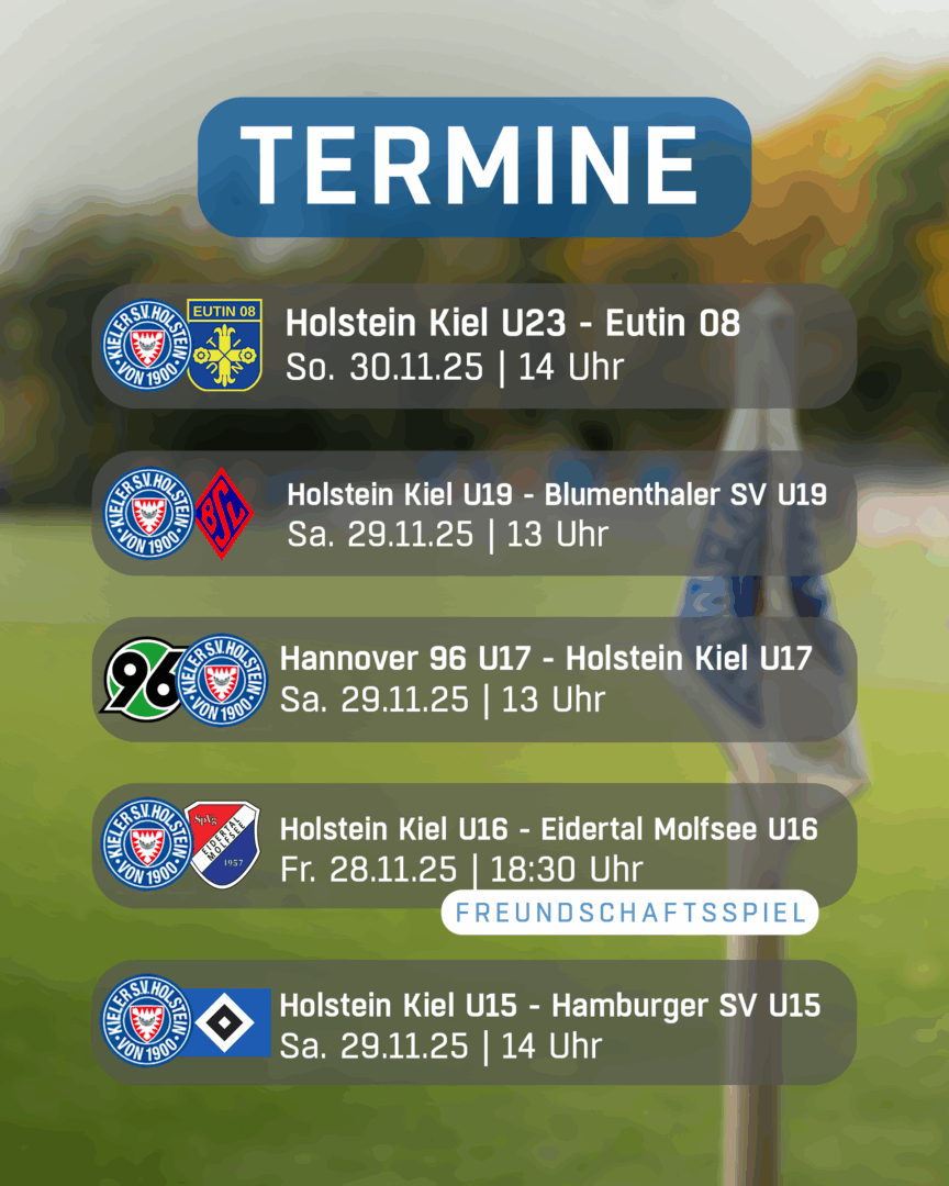 Sechs Heim- sowie zwei Auswärtsspiele stehen für Holsteins Nachwuchsteams am Wochenende an. Bis auf unsere U16, die in einem Freundschaftsspiel ebenfalls im Einsatz ist, sind alle U-Mannschaften am Wochenende noch in Pflichtspielen gefordert. Ein besonderes Augenmerk gilt dabei der U19 und U17, die beide an diesem Spieltag die Qualifikation für Liga A perfekt machen können.