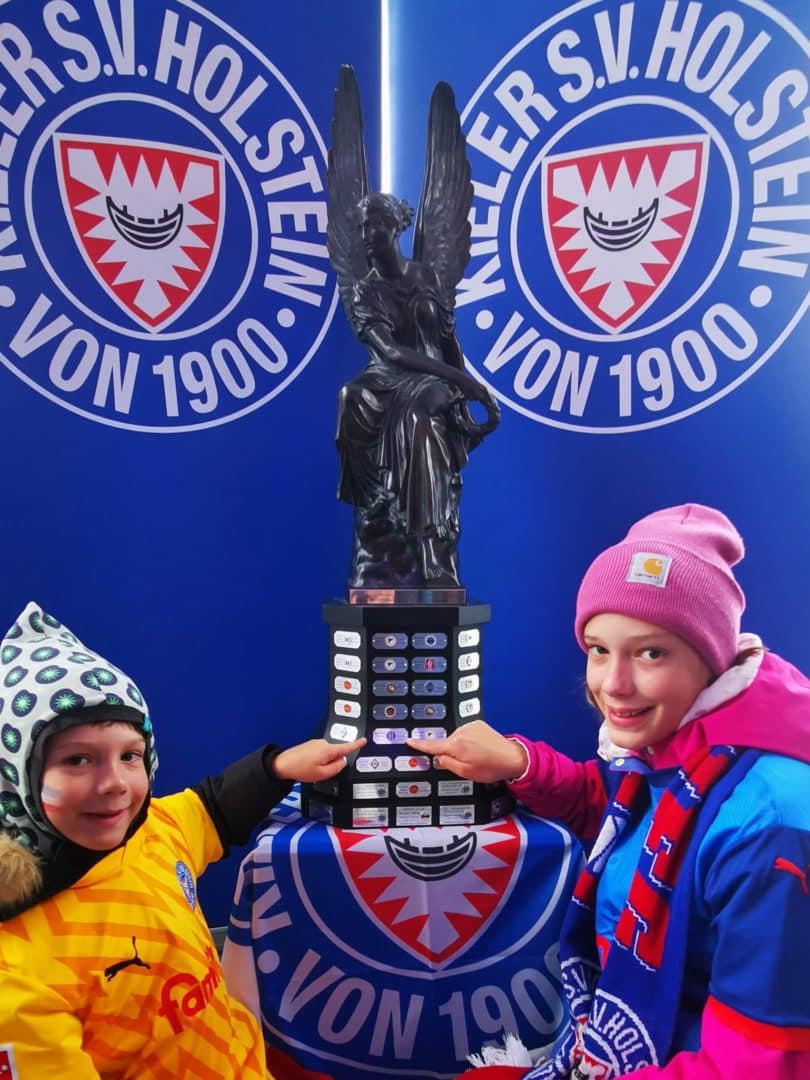 Anlässlich des Internationalen Tages für Kinderrechte, der jährlich am 20. November stattfindet, hatte unsere KSV Holstein gegen Hertha BSC viele Aktionen für Kinder rund um das Holstein-Stadion geplant. Zahlreiche Kinder ließen sich unter anderem schminken und bestaunten die Victoria, unseren Meisterpokal von 1912, – darunter auch die Ururenkel von Holsteins 1930er-Vizemeister Oskar Ritter, Tom (6) und Lena (11). Tolle lange Holstein-Tradition in der Familie Ritter.