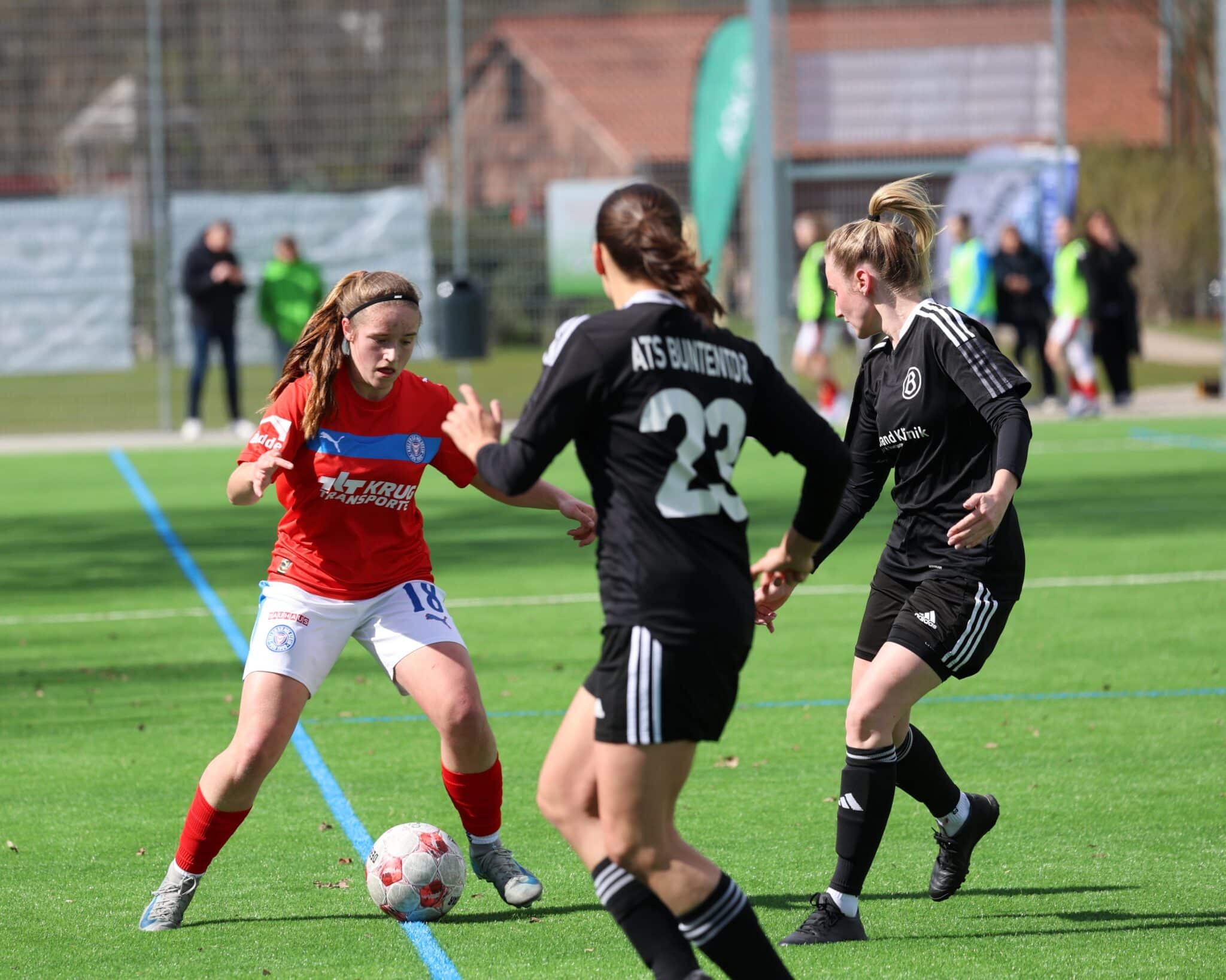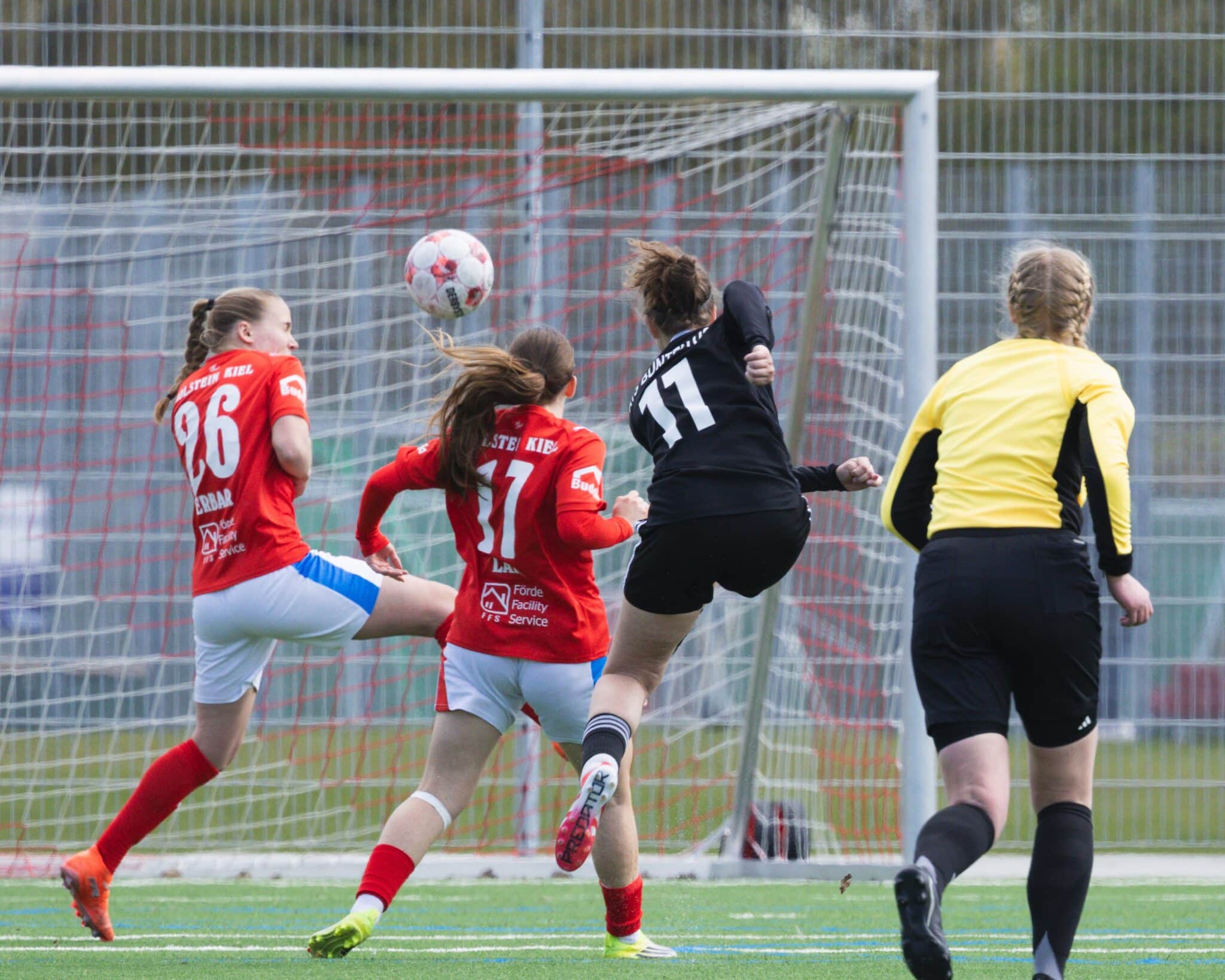 Die ersten 45 Minuten dieses Auswärtsspiels gingen eher schleppend voran. Unsere Women fanden gegen die gut stehende Defensive des ATS nicht die richtigen spielerischen Lösungen. So blieb es – abgesehen von einem etwas überhasteten Abschluss von Sammy Carone – weitestgehend ungefährlich vor dem Tor der Gastgeberinnen. Auf der anderen Seite hatten unsere Holsteinerinnen Glück, dass Buntentor sich für einige lange Bälle und schnelles Umschalten nicht belohnte. Zur Pause ging es dementsprechend ohne Treffer auf beiden Seiten.