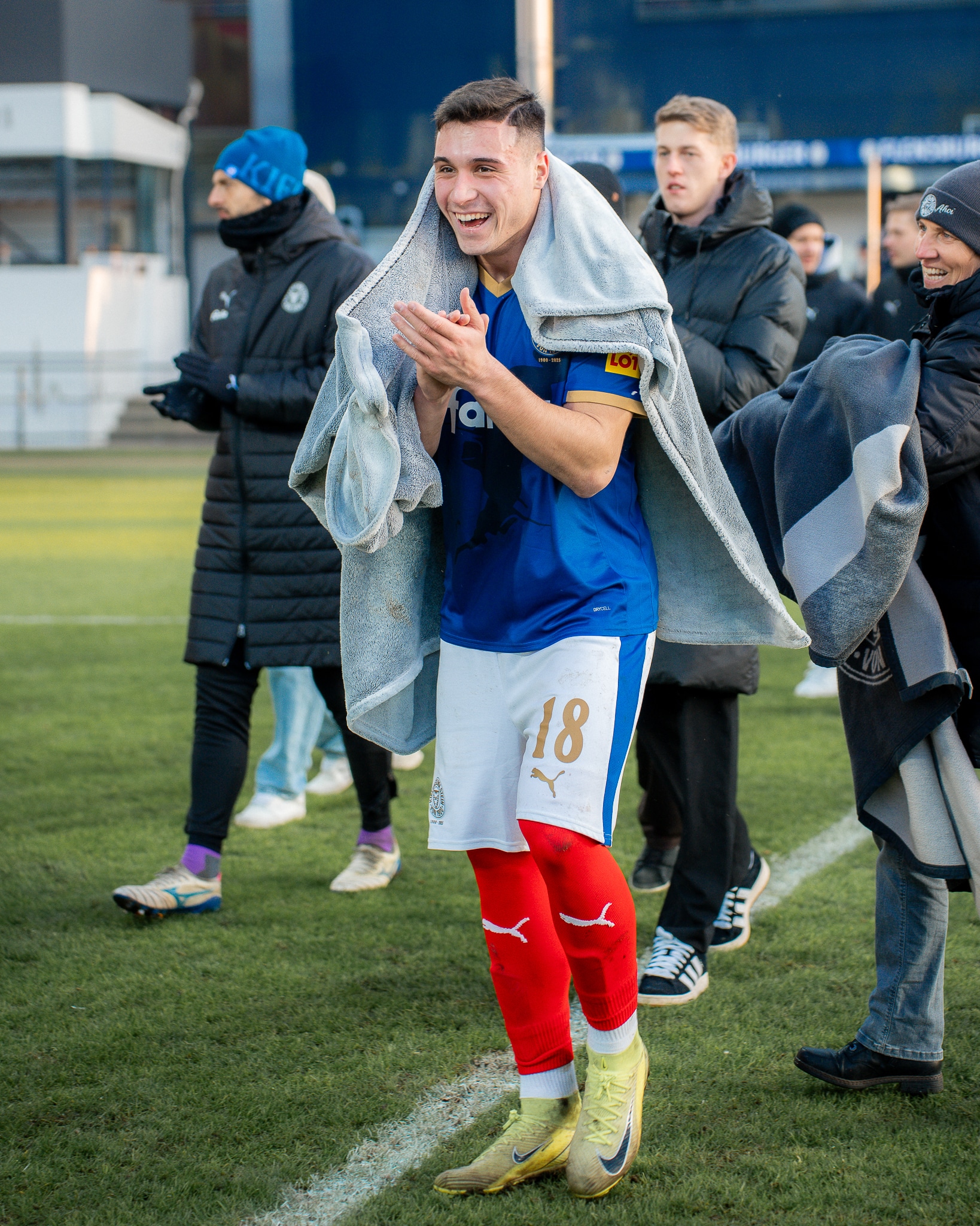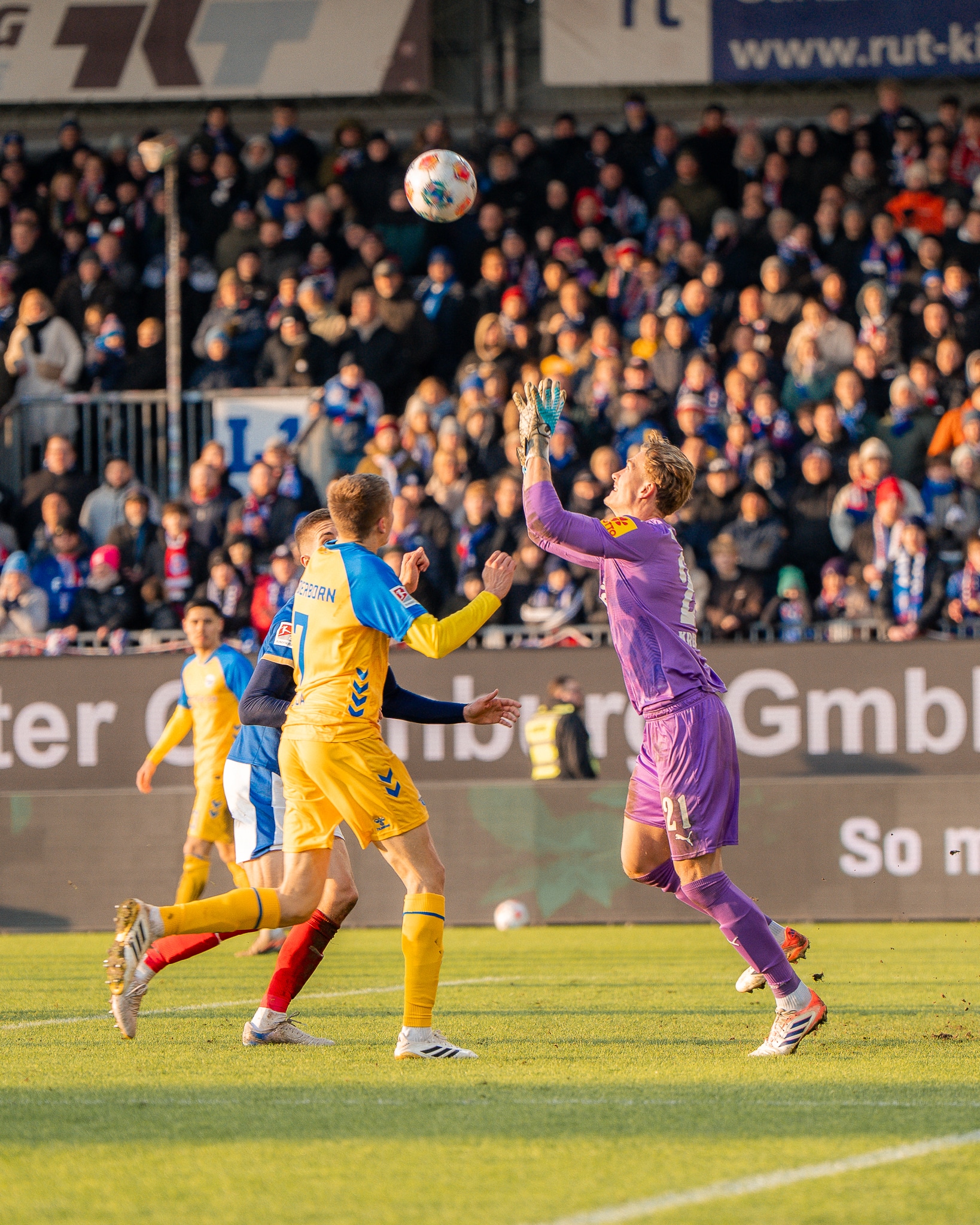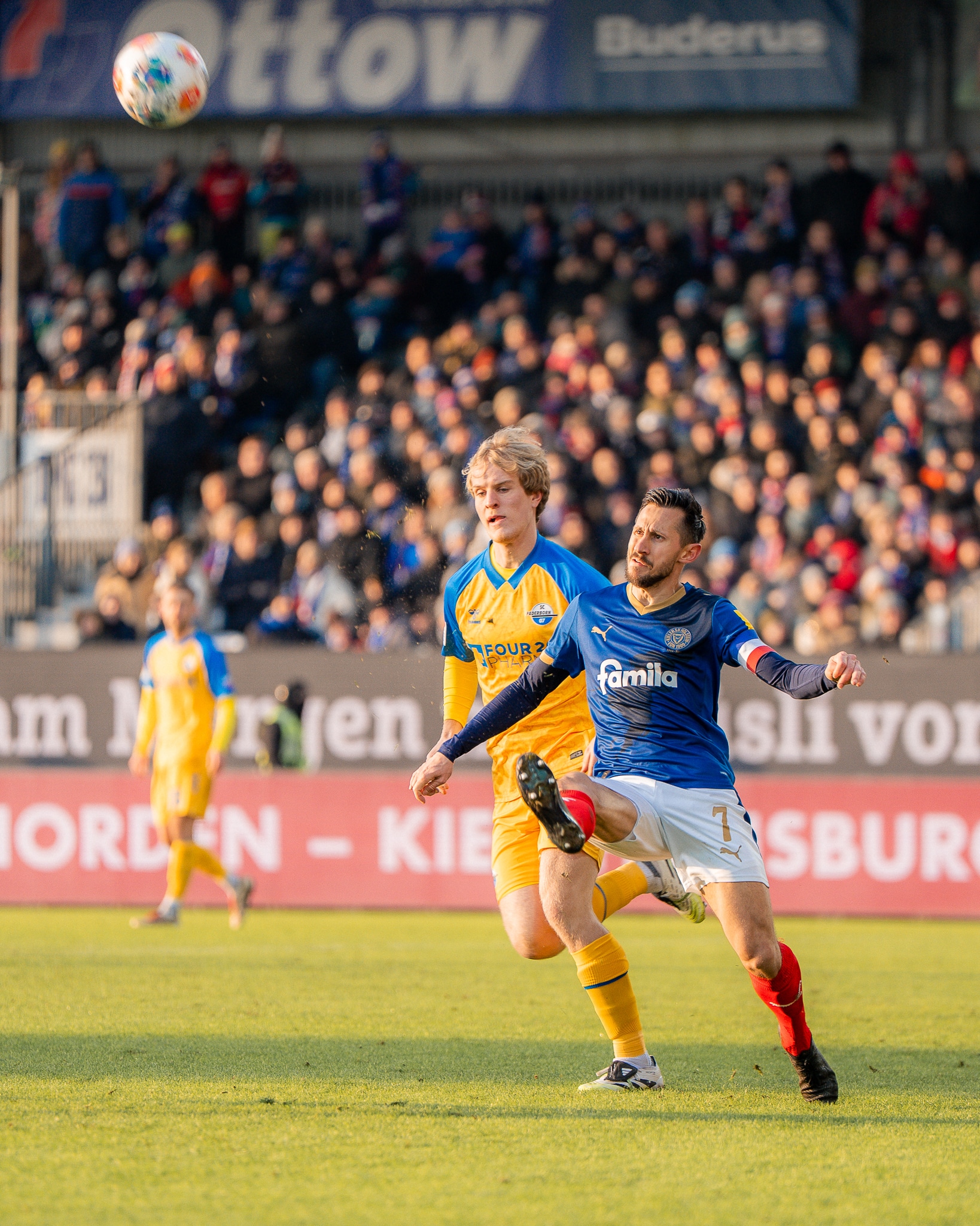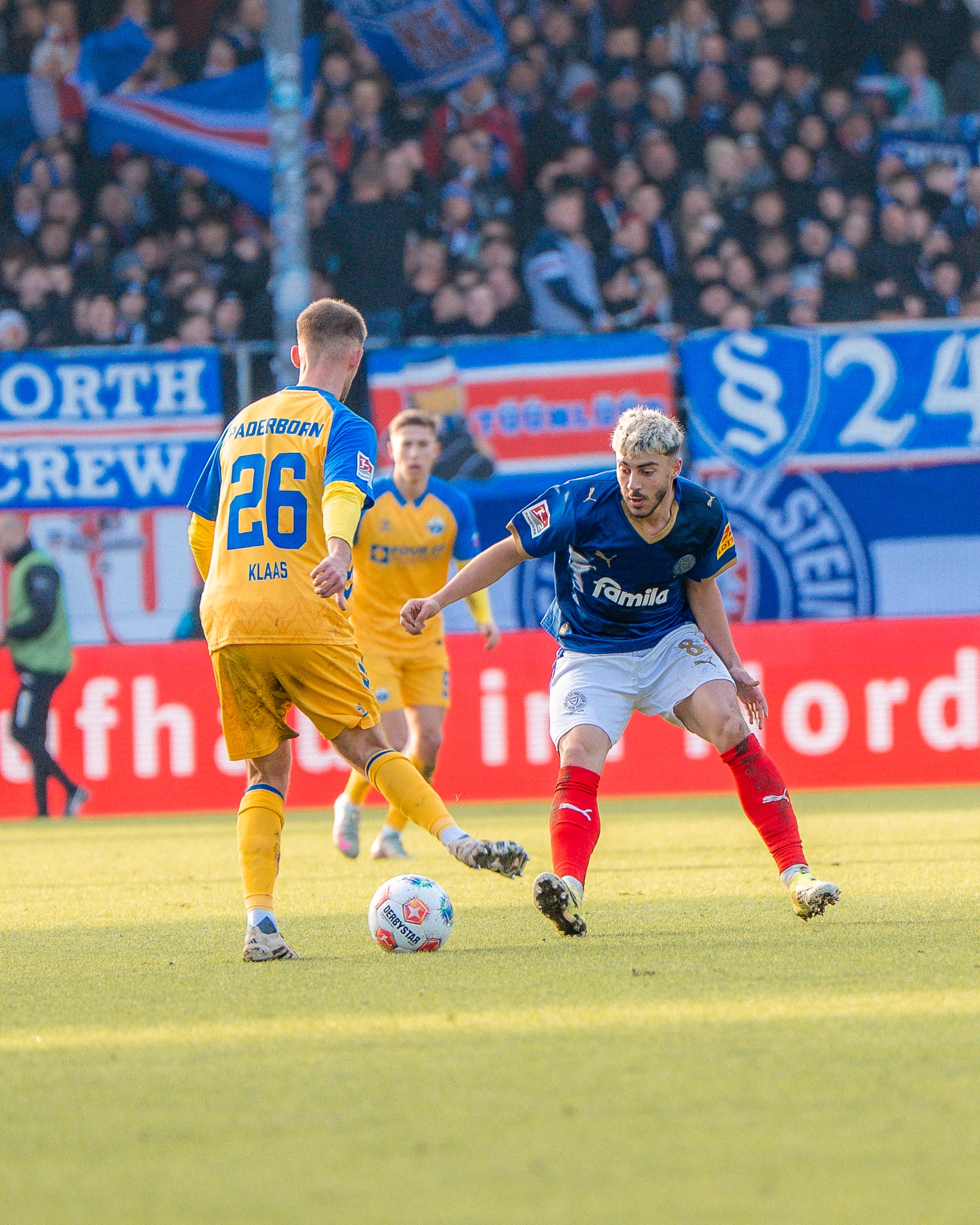 Auch nach dem Seitenwechsel hatte Paderborn mehr Ballbesitz, Holstein stand aber weiterhin kompakt – und setzte erneut offensive Nadelstiche: Erst lenkte Dennis Seimen einen Niehoff-Schuss spektakulär über die Latte hinweg (53.), ehe sich der SCP-Torwart wenig später aber geschlagen geben musste. Harres legte eine Skrzybski-Flanke auf David Zec ab, dessen abgeblockter Schuss bei Lasse Rosenboom landete, der aus kurzer Distanz abstauben konnte (67.). Danach drängte Paderborn auf den Anschlusstreffer, ein Distanzschuss von Raphael Obermair verfehlte aber knapp sein Ziel (74.) und Klaas‘ Treffer nach Zec-Fehlpass zählte nicht, weil Steffen Tigges beim vorherigen Abstoß bereits im Strafraum gestanden hatte (75.). Die Schlussphase wurde überschattet von einer Verletzung von Calvin Brackelmann, der kurz vor Ende der regulären Spielzeit nach einem Kopfballduell mit Rosenboom unglücklich landete und lange behandelt werden musste – gute Besserung an dieser Stelle! Auch die insgesamt 16-minütige Nachspielzeit überstand unsere KSV schadlos, sodass der Sieg zum Rückrundenstart perfekt war.