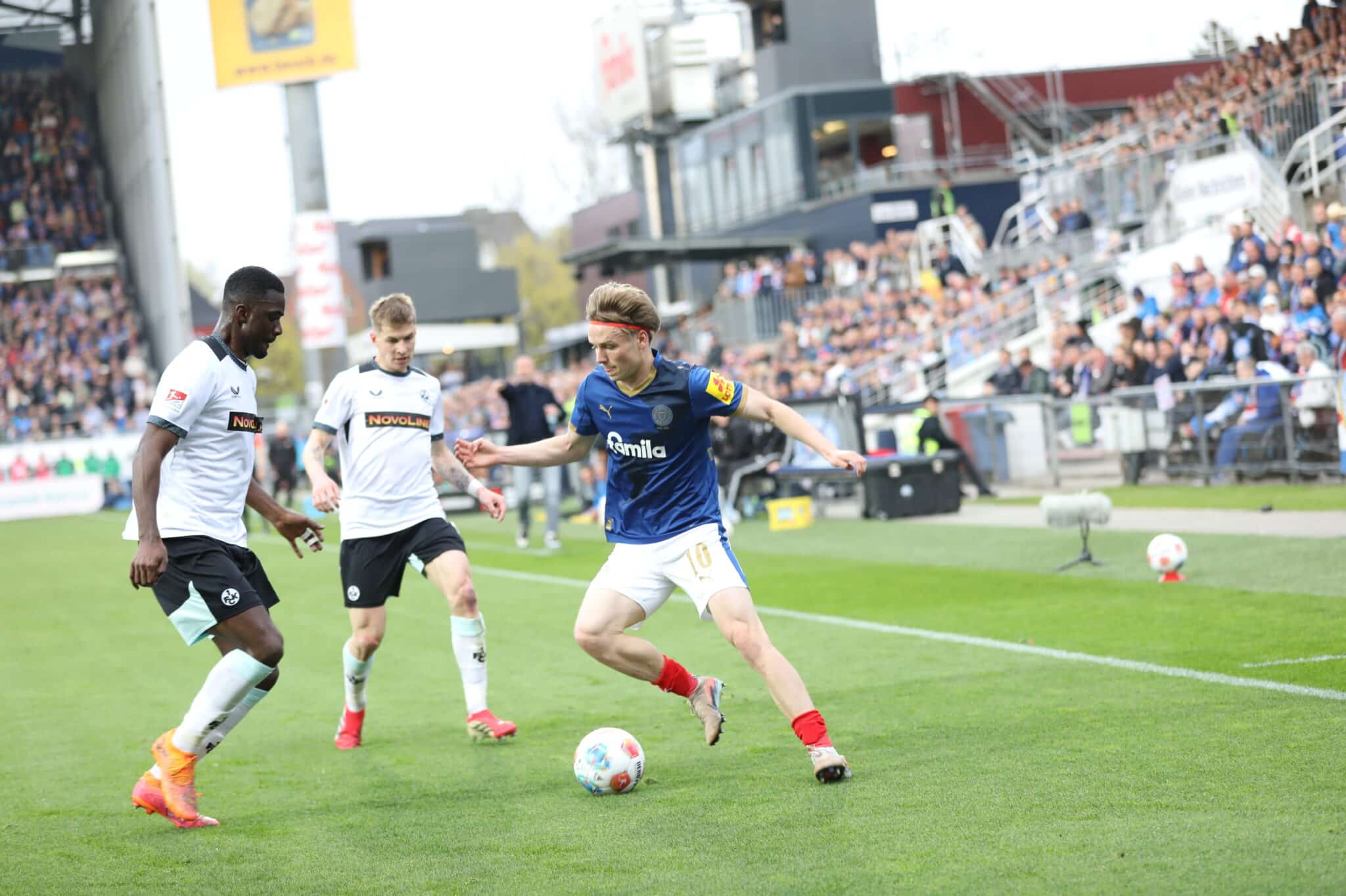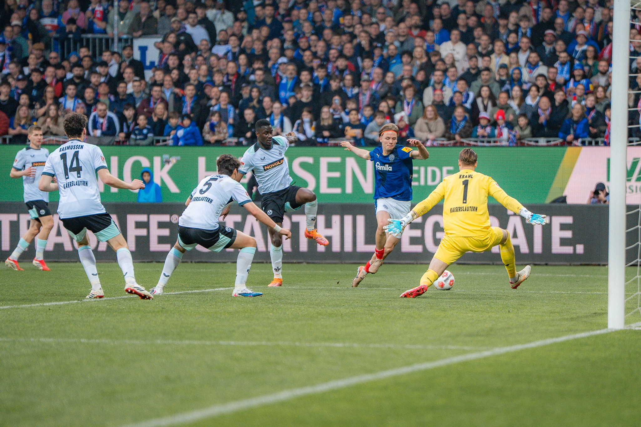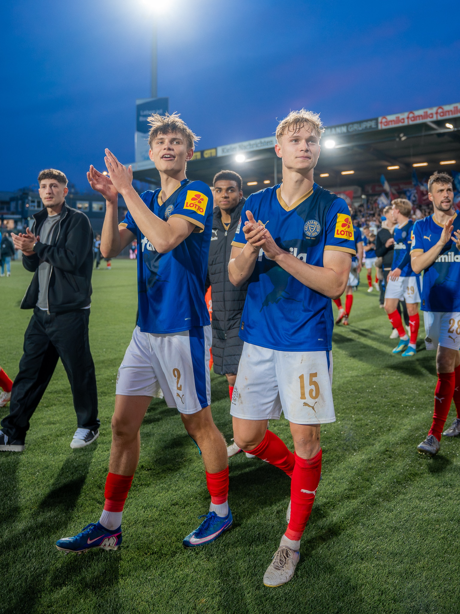 Nach dem Seitenwechsel blieb das hohe Tempo im Spiel unverändert und Holstein hörte nicht auf, nach vorne zu spielen. Der schon in der ersten Hälfte gekommene Jonas Therkelsen wollte sich als vierter Holsteiner in der Torschützenliste eintragen. Trotz ausgezeichneter Dribblings fehlte dem Norweger das nötige Glück im Abschluss. Kaiserslautern war mit einem Doppelwechsel in die zweite Halbzeit gestartet, konnte trotz taktischer Umstellungen weiterhin kaum Torgefahr erzeugen und unsere Störche erst in der Schlussphase noch einmal in Bedrängnis bringen. Doch gegen eine Direktabnahme von Semih Sahin war Timon Weiner reaktionsschnell zur Stelle und hielt die Null fest (72.). So blieb es beim 3:0 und einem verdienten Heimsieg.