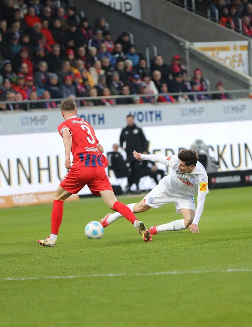 Nach Wiederanpfiff setzte es dann einen schnellen Nackenschlag: Erst scheiterte Pieringer nach einem Freistoß am stark reagierenden Weiner, eine Zeigerumdrehung später zog Budu Zivzidaze von halblinks ab und erhöhte durch die Beine von Nicolai Remberg auf 2:0 (47.). Angefeuert von 700 Kieler Schlachtenbummlern rannten die Störche im Anschluss wütend an. Die beste Chance in dieser Phase hatte der eingewechselte Fiete Arp, der einen Freistoß sehenswert an den Querbalken setzte (58.). Trotz viel Ballbesitz und einigen Halbchancen blieben die Kieler Bemühungen lange vergebens. In der 87. Minute gelang dann der Anschlusstreffer: Müller ließ einen Distanzschuss von Finn Porath nach vorne klatschen, der eingewechselte Phil Harres stand goldrichtig und verkürzte auf 1:2 aus Kieler Sicht (87.). Die Störche warfen alles nach vorne – und liefen in einen Konter. Zivzidaze steckte gegen aufgerückte Kieler auf Sirlord Conteh durch, der eiskalt zum 3:1-Endstand abschloss (90.+3).