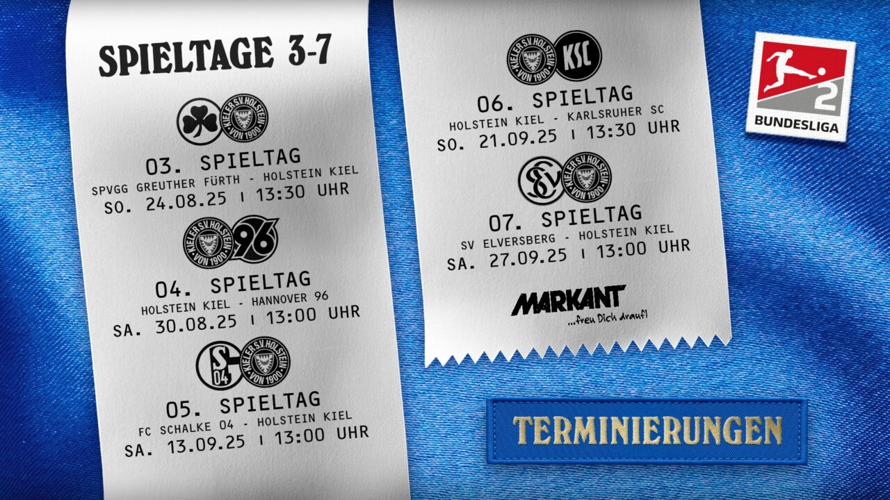 Am dritten Spieltag reisen unsere Störche zur SpVgg Greuther Fürth. Am Sonntag, 24. August, ist dabei um 13.30 Uhr Anstoß. Das zweite Heimspiel der Saison steigt am Samstag, 30. August, um 13 Uhr gegen Hannover 96. Nach der Länderspielpause geht es für unsere Störche ab nach Gelsenkirchen zu Schalke 04. Anpfiff der Partie ist am Samstag, 13. September, um 13 Uhr. Am sechsten Spieltag empfangen wir dann den Karlsruher SC am Sonntag, 21. September um 13.30 Uhr, im Holstein-Stadion. Der siebte Spieltag hält dann eine Auswärtsfahrt zum SV Elversberg für unsere KSV-Profis bereit. Am Samstag, 27. September, rollt ab 13.30 Uhr der Ball in der URSAPHARM-Arena an der Kaiserlinde.