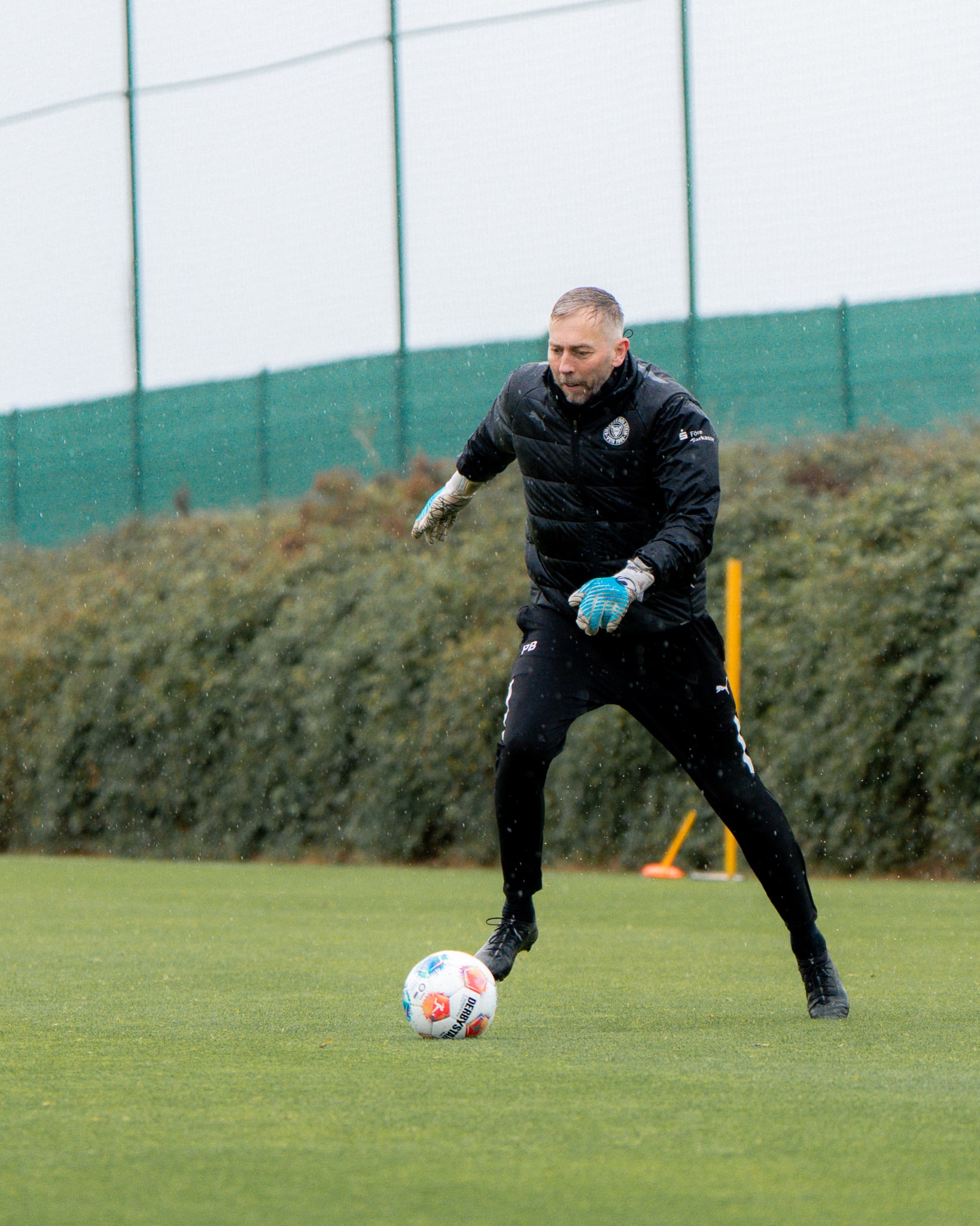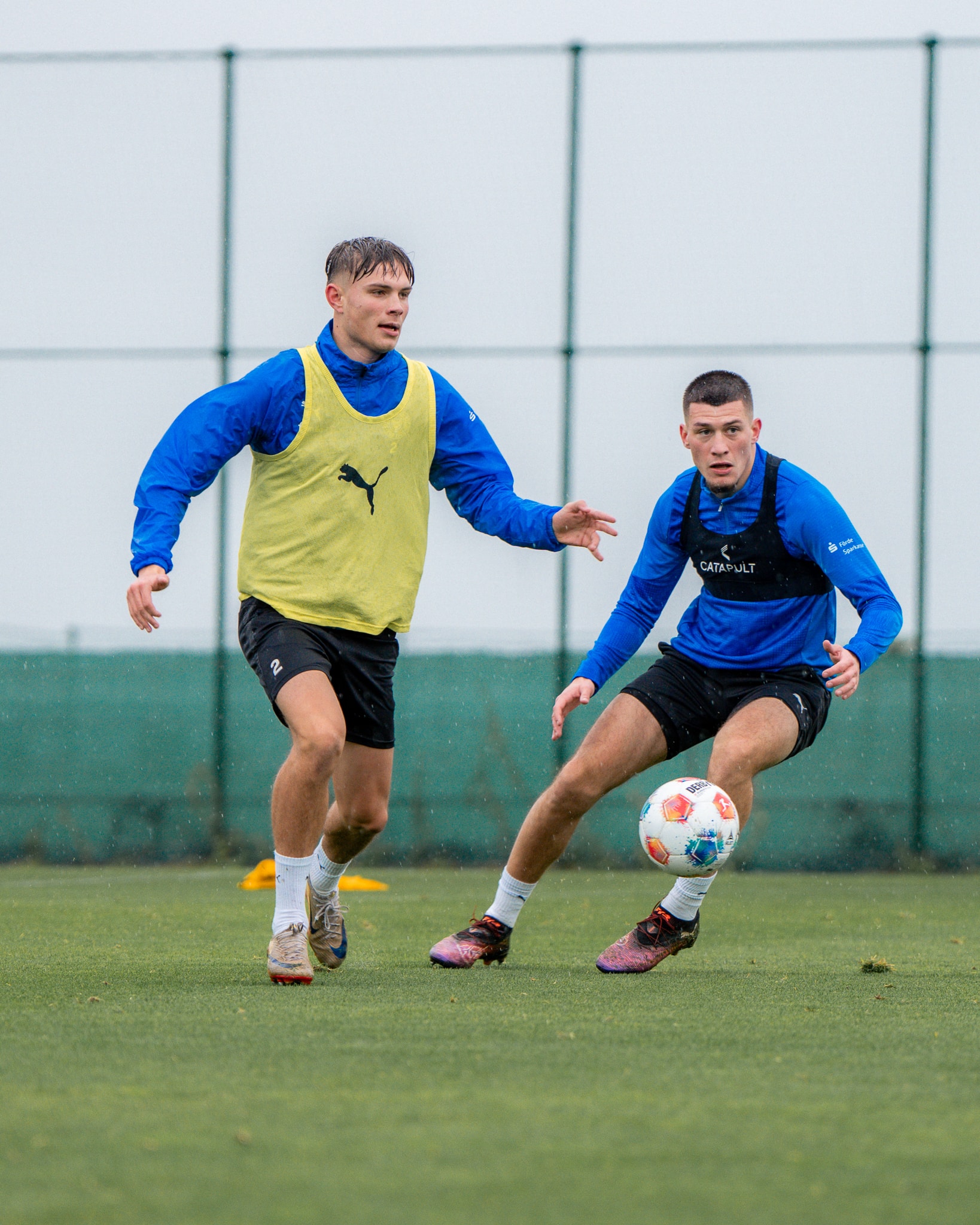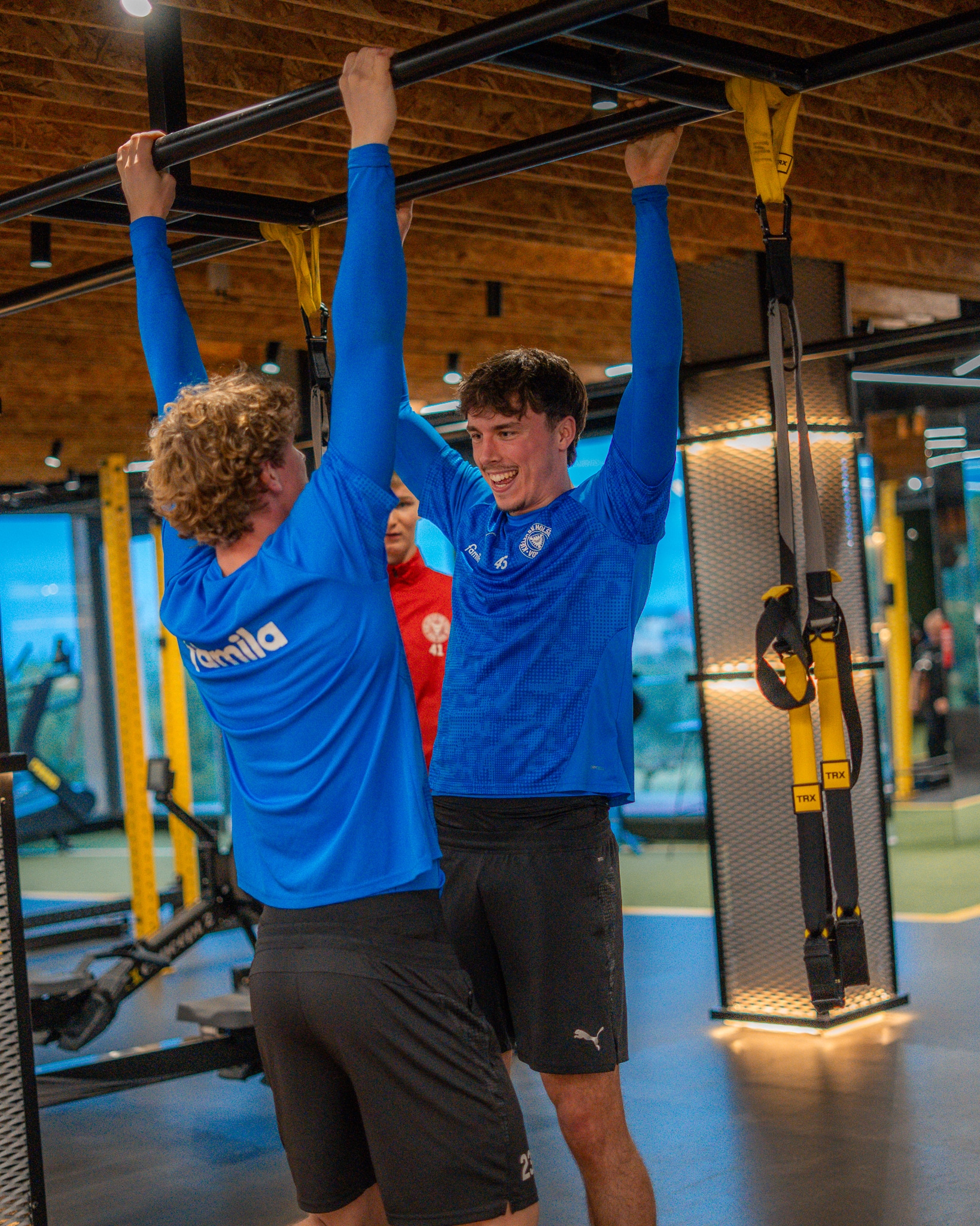 Über die Mittagszeit hörte der Regen dann auf, doch der Himmel blieb bedeckt. Unter diesen Vorzeichen trat die Mannschaft zum zweiten Mal den Weg zum Trainingsplatz an. Dort wurden sie von den ersten aus Kiel gekommenen Fans begrüßt. Zurück im Hotel ging es allerdings nicht sofort zum Abendessen, denn zuerst betrat die Mannschaft das Gym. Unter der Anleitung der Athletiktrainer Lasse Bork und Timm Sörensen absolvierten unsere Profis zunächst ein Oberkörpertraining und anschließend regenerative Übungen. Das Abendessen hatten sich die Spieler dann mehr als verdient.