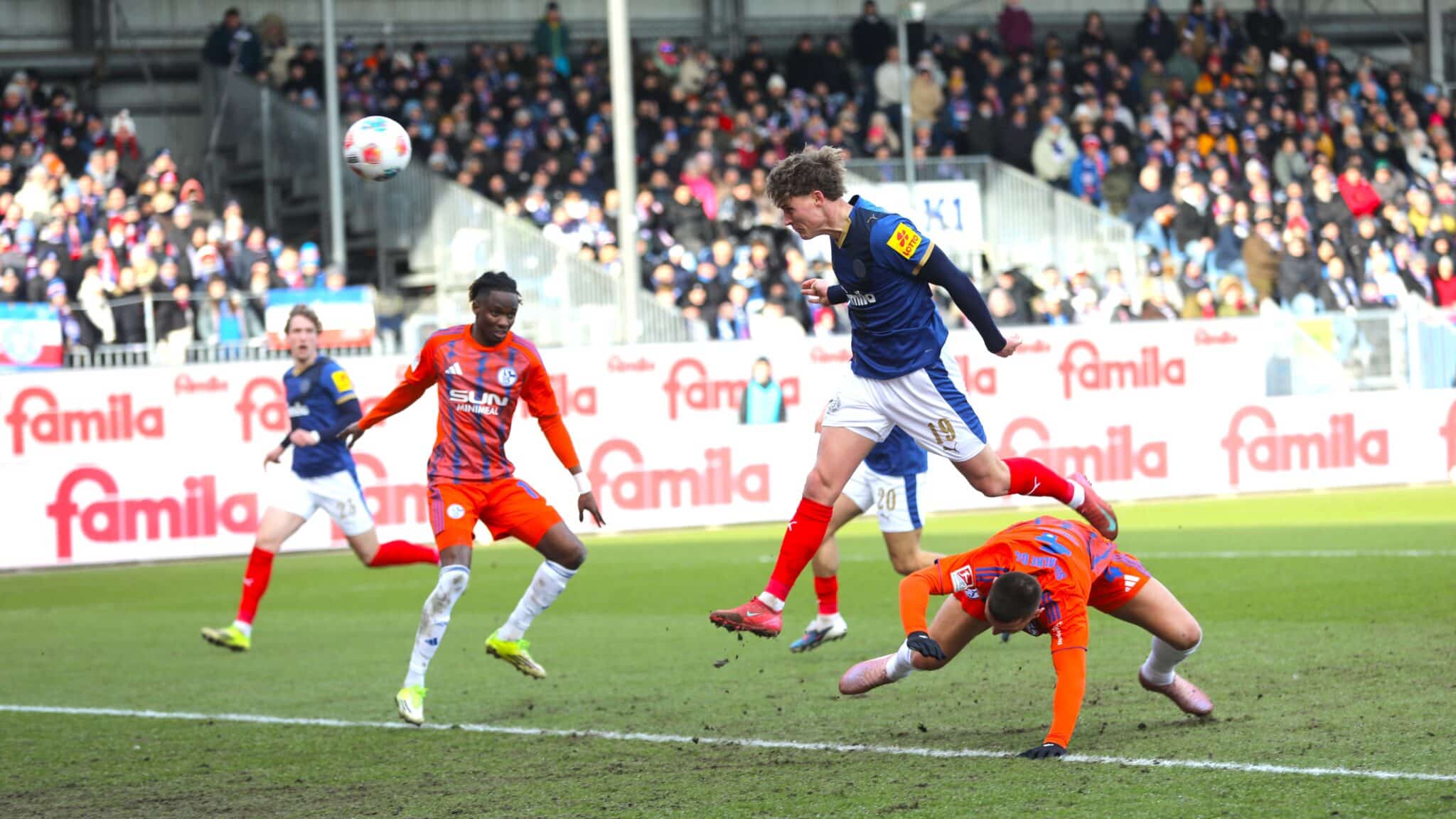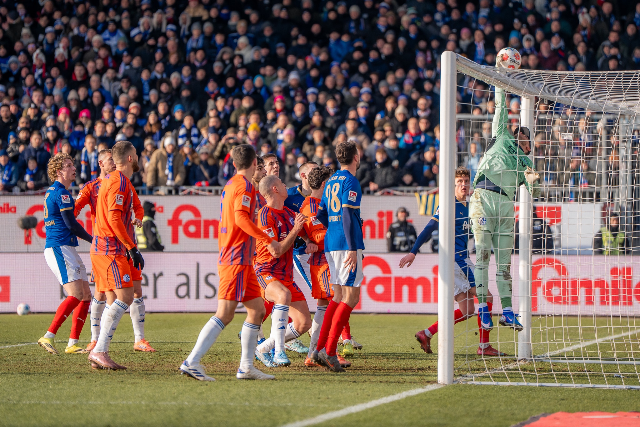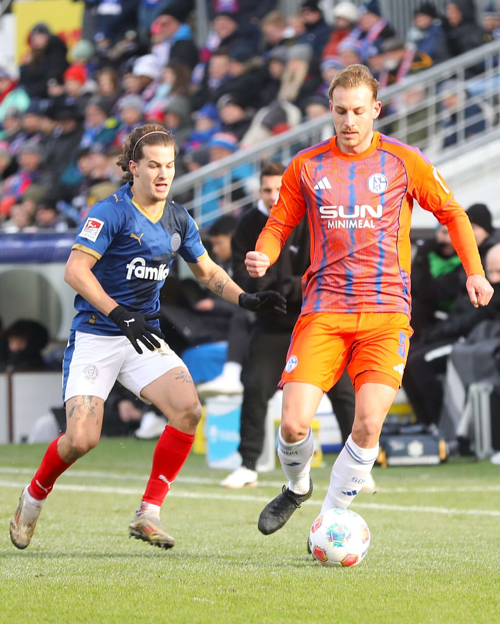 Die Gäste aus Gelsenkirchen hatten in der Anfangsphase mehr vom Spiel – und gingen demzufolge auch in Führung: Nachdem Jonas Krumrey kurz zuvor noch sehenswert einen Schuss von Dejan Ljubicic aus dem linken Giebel gekratzt hatte (10.), war unser Keeper wenig später bei einer Ecke chancenlos, als Kenan Karaman nach einer Kopfball-Ablage von Edin Dzeko den Ball aus kurzer Distanz über die Linie drückte (16.). Holstein arbeitete sich in der Folge ins Spiel und kam zu einer großen Doppelchance: Erst scheiterte Adrian Kapralik frei vor Loris Karius am S04-Torwart, ehe Andu Kelati den Abpraller knapp rechts vorbeisetzte (25.). Stattdessen legte Königsblau nach: Zunächst ließ sich Krumrey nicht von Adil Aouchiche im kurzen Eck überlisten (27.) und parierte auch eine Volleyabnahme von Dzeko stark (28.), war aber erneut nach einem Eckball ohne Chance, als Hasan Kurucay die Kugel abermals nach Dzeko-Verlängerung am zweiten Pfosten einköpfte (29.). Im direkten Gegenzug kam Holstein zum vermeintlichen Anschlusstreffer durch Phil Harres, dessen Tor aber wegen eines Offensivfouls keine Anerkennung fand (31.).