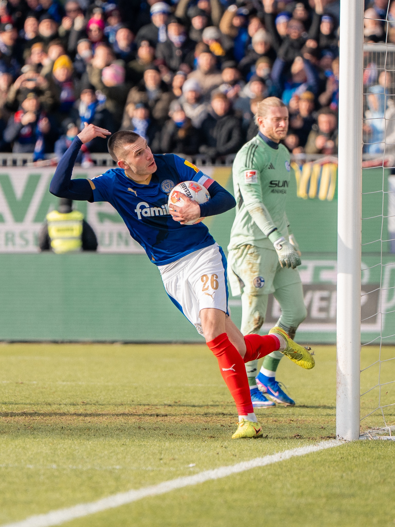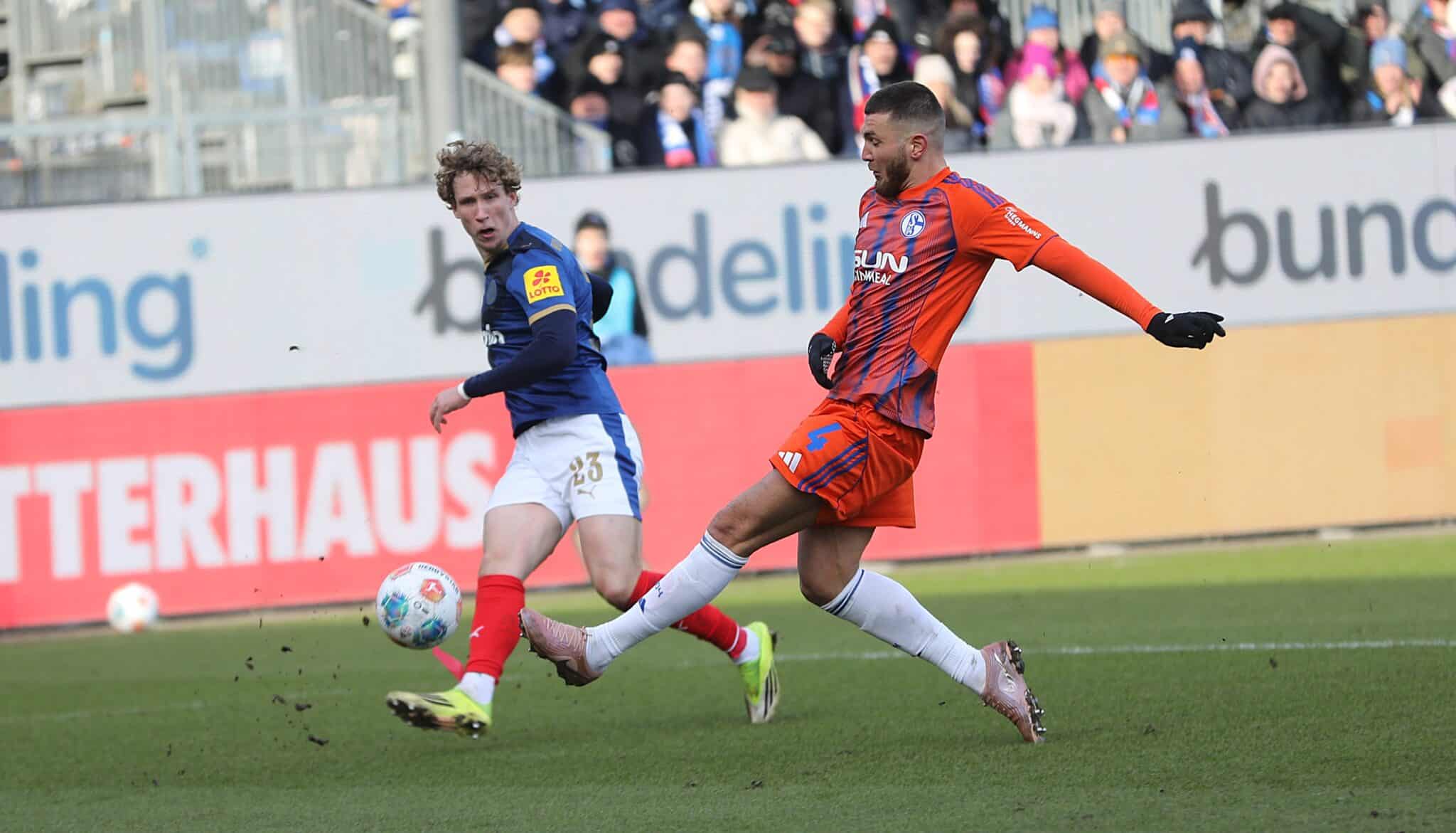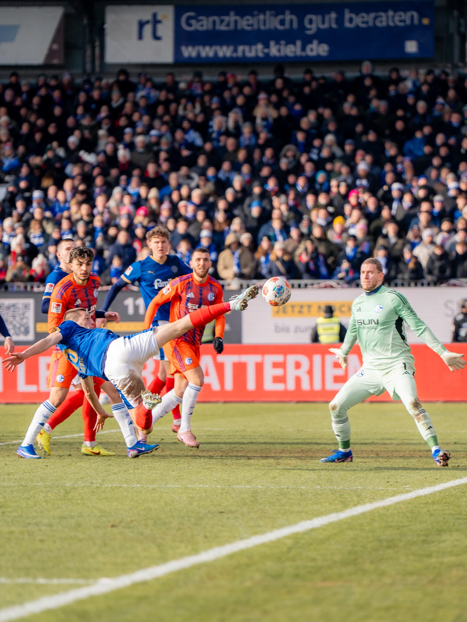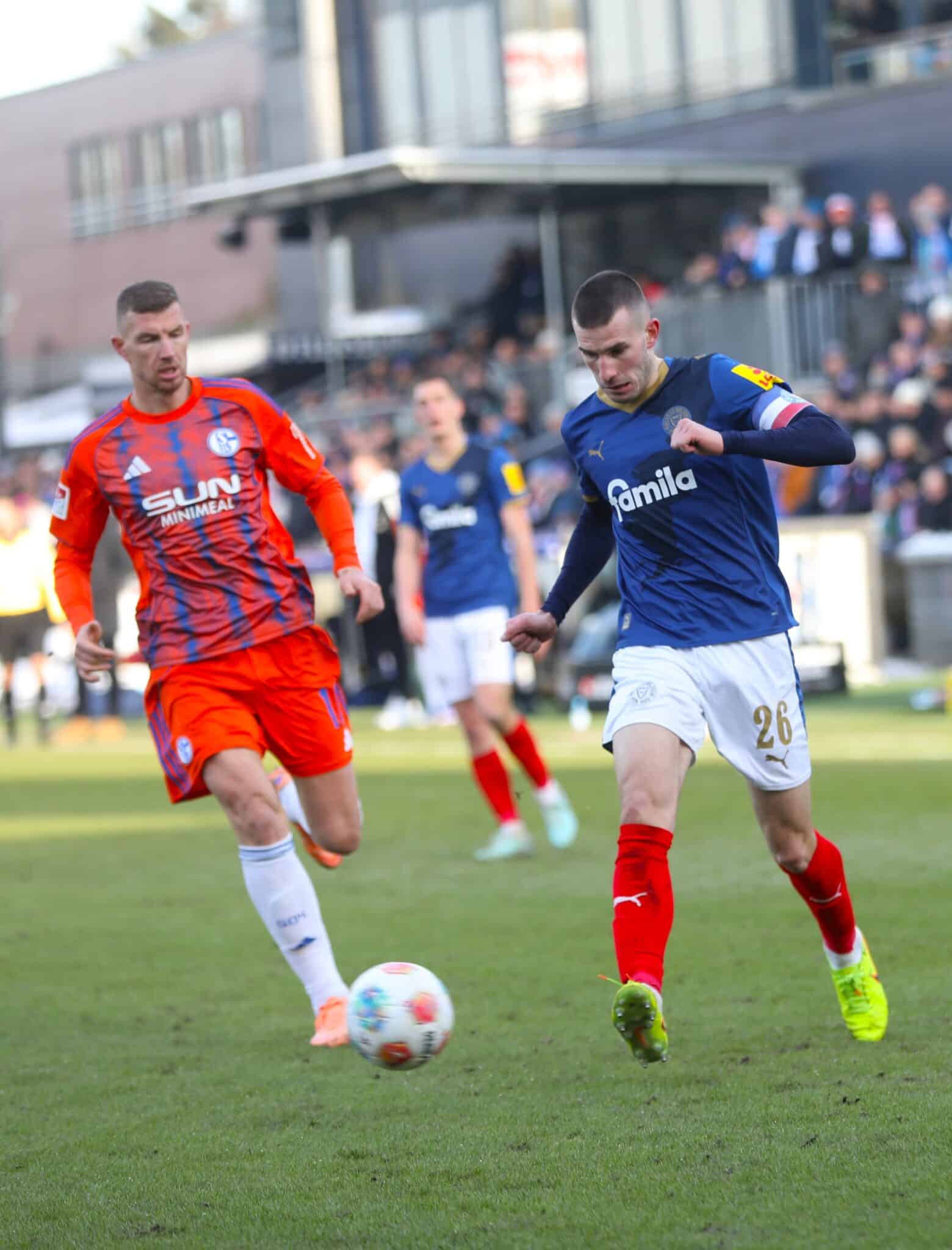 Die Gäste aus Gelsenkirchen hatten in der Anfangsphase mehr vom Spiel – und gingen demzufolge auch in Führung: Nachdem Jonas Krumrey kurz zuvor noch sehenswert einen Schuss von Dejan Ljubicic aus dem linken Giebel gekratzt hatte (10.), war unser Keeper wenig später bei einer Ecke chancenlos, als Kenan Karaman nach einer Kopfball-Ablage von Edin Dzeko den Ball aus kurzer Distanz über die Linie drückte (16.). Holstein arbeitete sich in der Folge ins Spiel und kam zu einer großen Doppelchance: Erst scheiterte Adrian Kapralik frei vor Loris Karius am S04-Torwart, ehe Andu Kelati den Abpraller knapp rechts vorbeisetzte (25.). Stattdessen legte Königsblau nach: Zunächst ließ sich Krumrey nicht von Adil Aouchiche im kurzen Eck überlisten (27.) und parierte auch eine Volleyabnahme von Dzeko stark (28.), war aber erneut nach einem Eckball ohne Chance, als Hasan Kurucay die Kugel abermals nach Dzeko-Verlängerung am zweiten Pfosten einköpfte (29.). Im direkten Gegenzug kam Holstein zum vermeintlichen Anschlusstreffer durch Phil Harres, dessen Tor aber wegen eines Offensivfouls keine Anerkennung fand (31.).