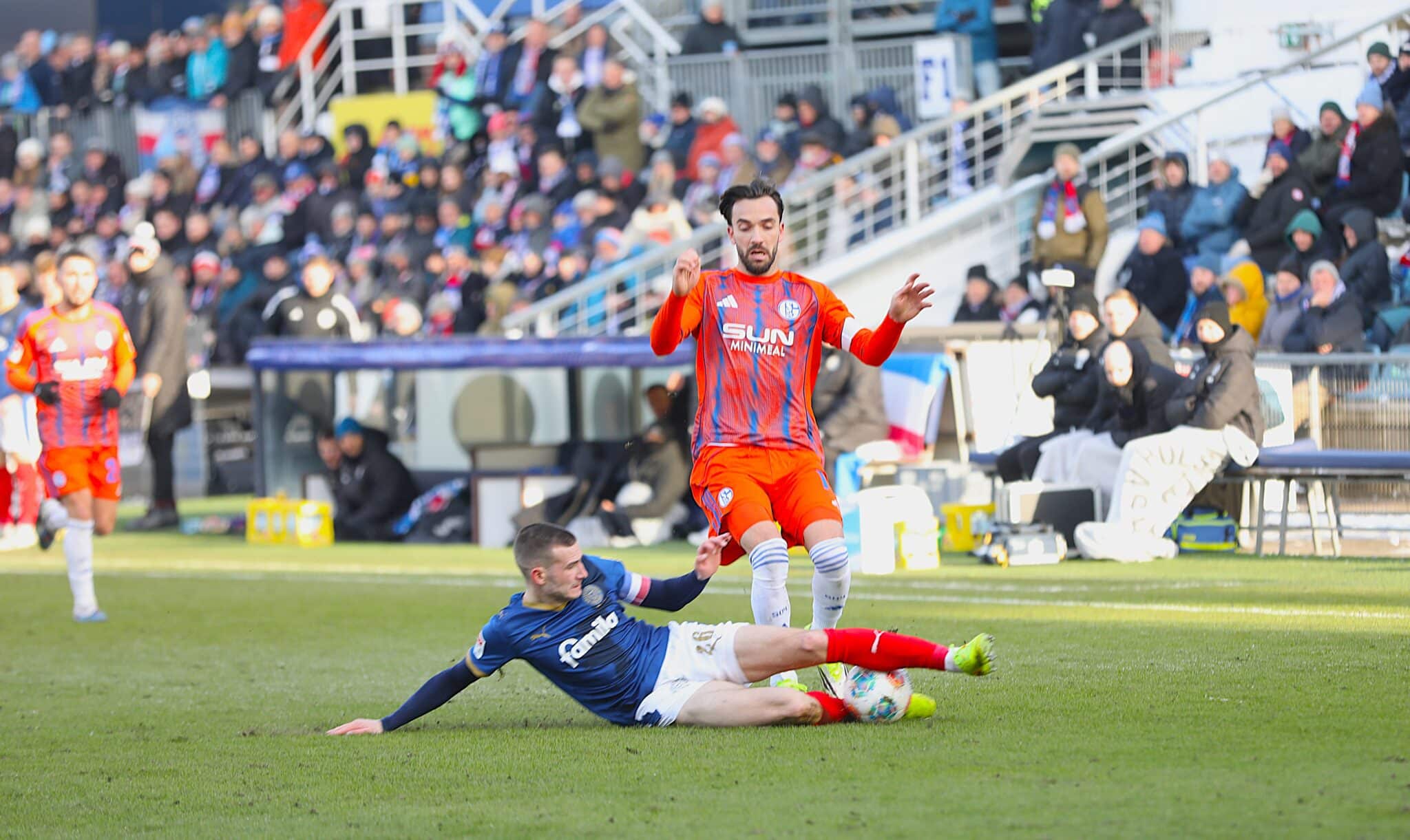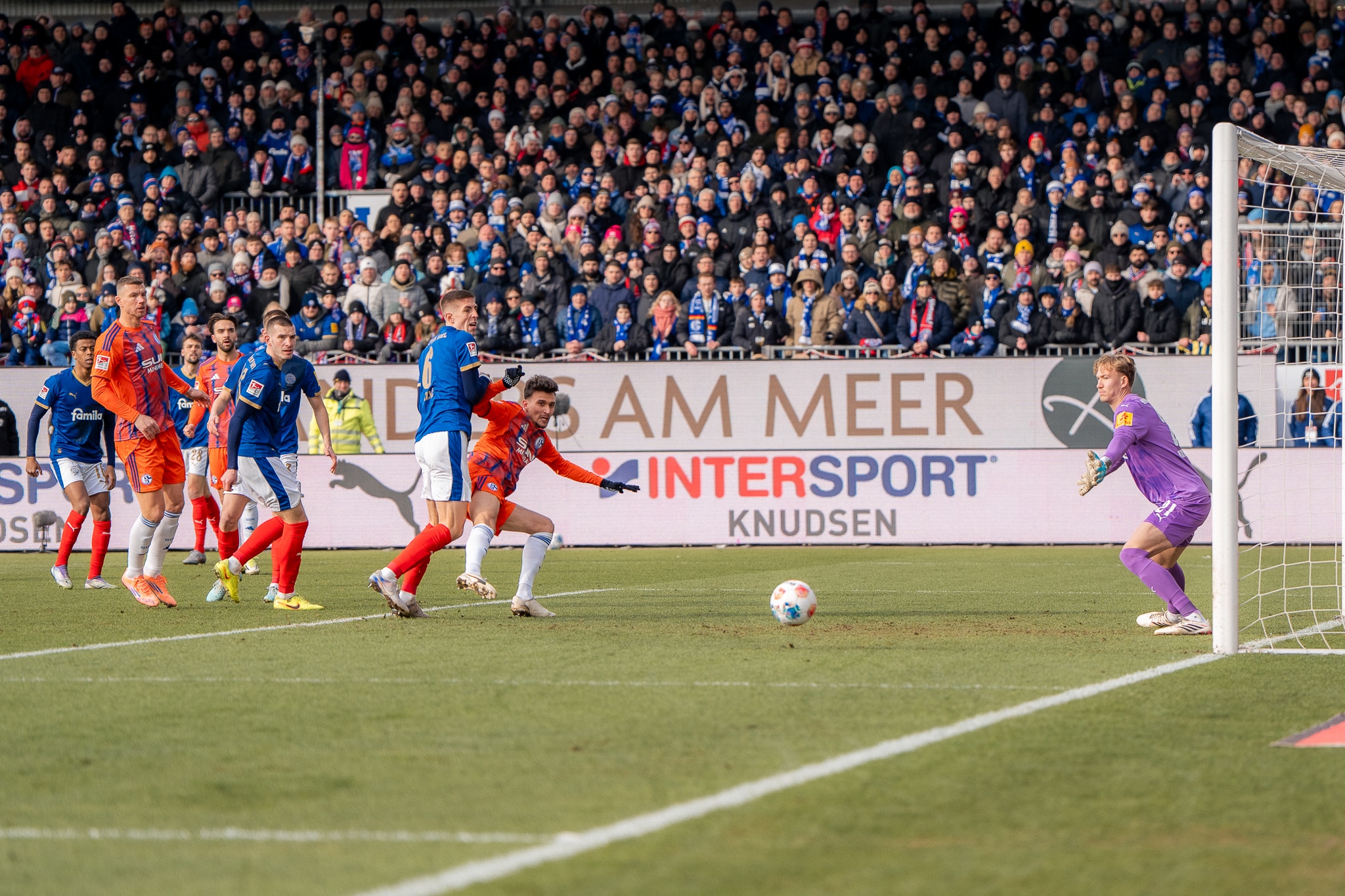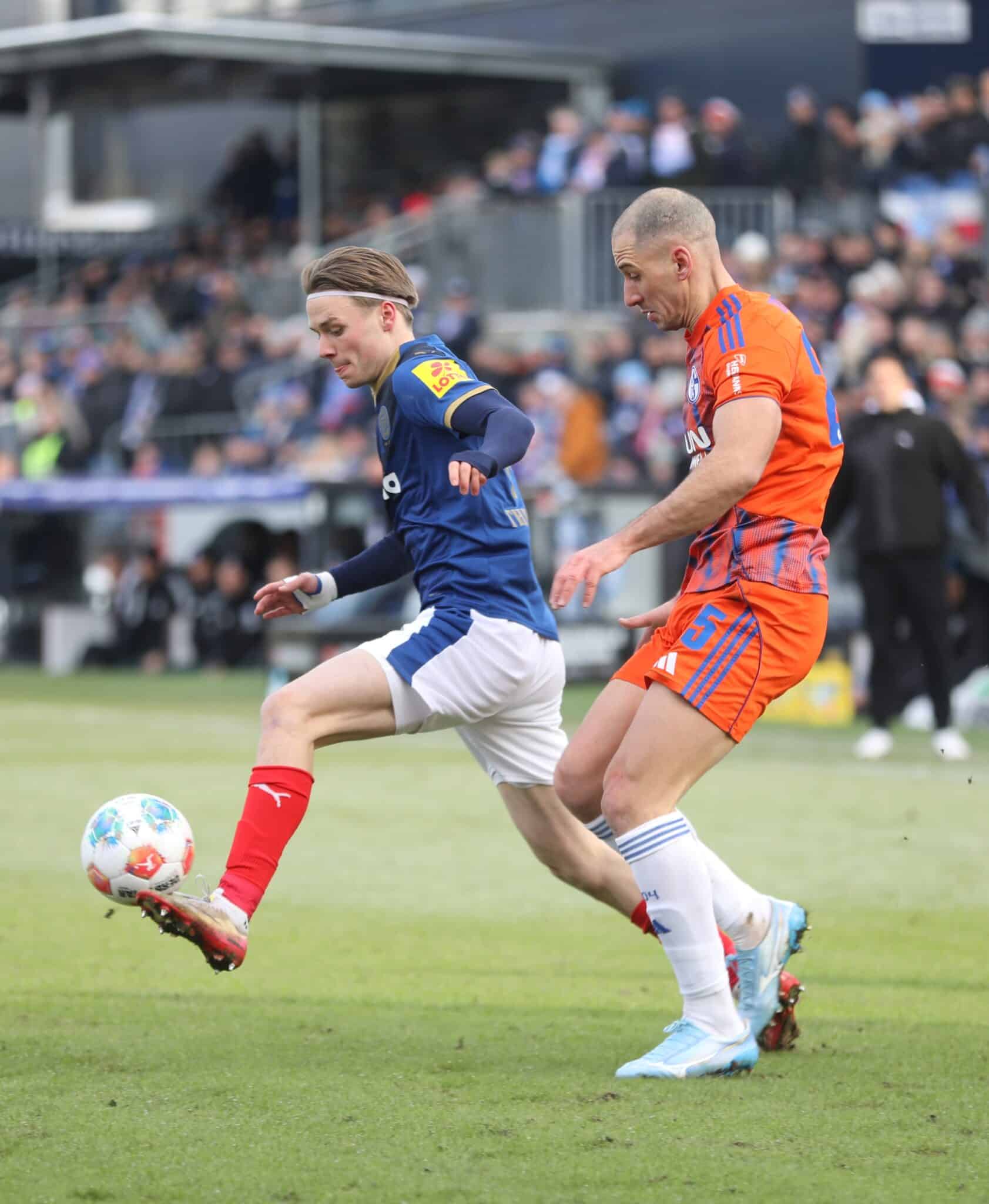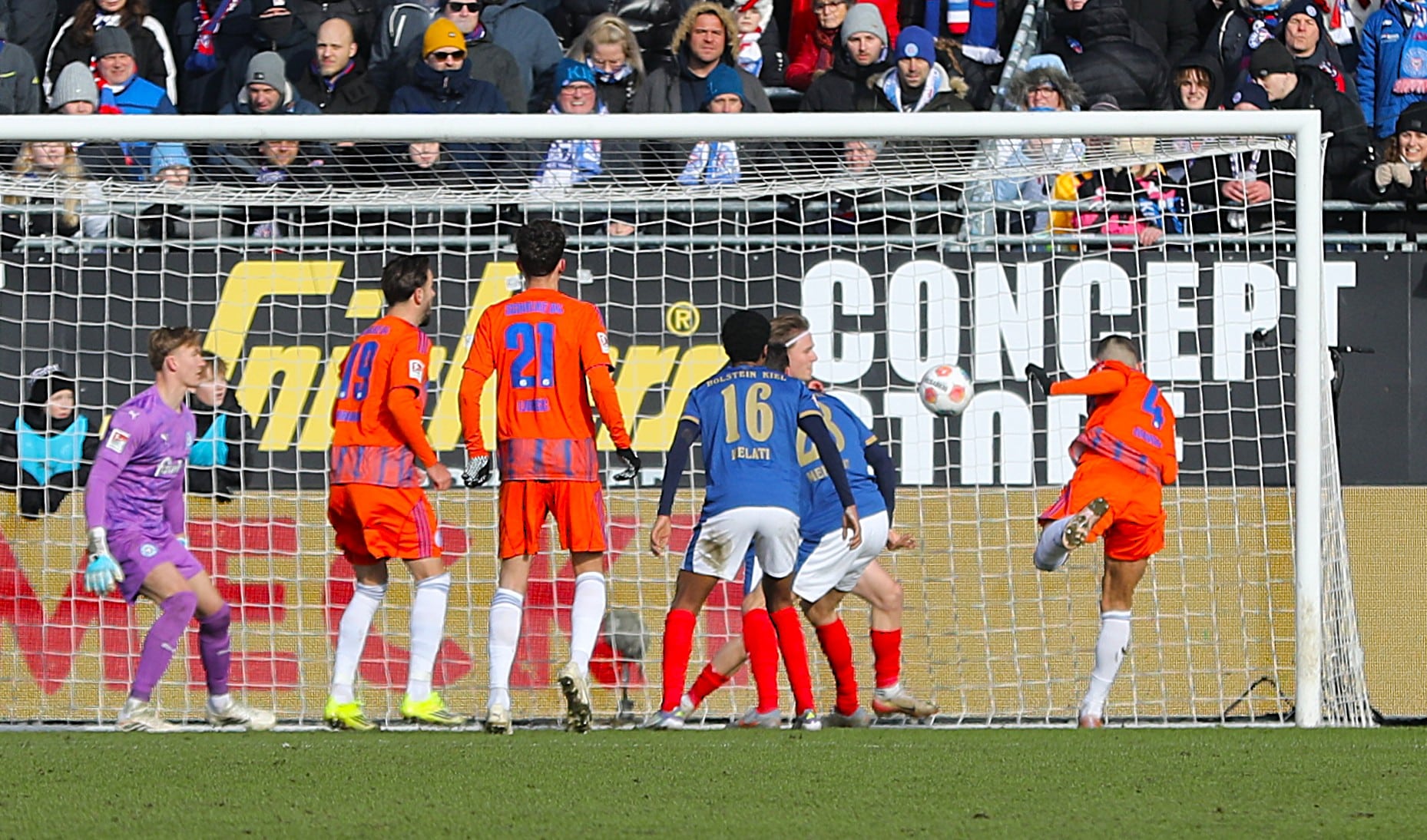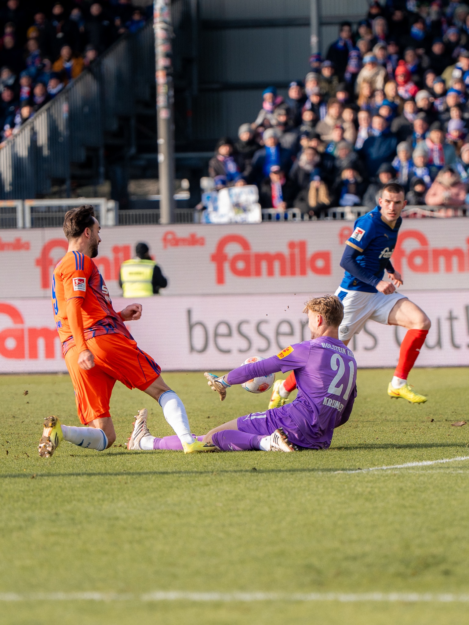 Nach dem Seitenwechsel präsentierten sich unsere Jungs deutlich agiler – und erhielten zu Beginn des zweiten Durchgangs einen Elfmeter zugesprochen, nachdem Ron Schallenberg Jonas Therkelsen zu Fall gebracht hatte. David Zec, der unsere Störche erstmals als Kapitän aufs Feld geführt hatte, trat an und verwandelte sicher ins rechte untere Eck (55.). Der Anschlusstreffer bescherte der Rapp-Elf neuen Auftrieb, sodass sie fortan mehr vom Spiel hatte und zu Chancen kam. Doch Aldin Jakupovic schoss links vorbei (58.), Harres verfehlte knapp das lange Eck (72.) und Kurucay rettete Ivan Nekics Direktabnahme nach einer Ecke für den geschlagenen Karius auf der Linie (74.). In der Schlussphase drängte Holstein weiterhin auf den Ausgleich, kam aber zu keinem weiteren Hochkaräter, sodass der Kampf unbelohnt blieb und die Knappen den Vorsprung über die Zeit brachten.