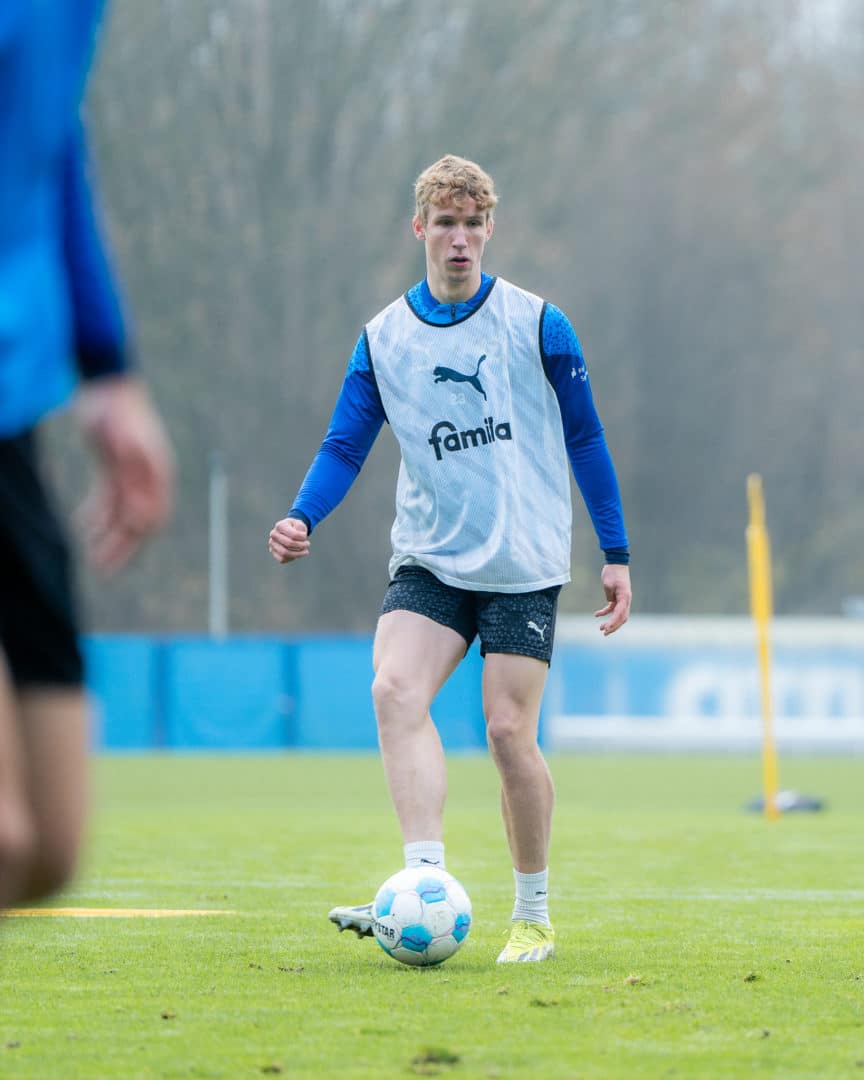 Diesen Schritt musste sich der blonde Lockenkopf allerdings hart erarbeiten. 17 Minuten stand Rosenboom in der Hinrunde der vergangenen Zweitliga-Saison 2023/24 nur auf dem Rasen, verteilt auf drei Partien. Spielpraxis holte er sich in der U23 unserer KSV Holstein in der Regionalliga – oft auf eigenen Wunsch: „Die Spiele bringen dir am meisten“, hält der Auricher fest. 14-mal lief „Rose“, wie er in der Mannschaft genannt wird, für die Jungstörche auf und bereitete vier Treffer vor. Seine Hartnäckigkeit sollte sich zum Ende der Saison auszahlen.