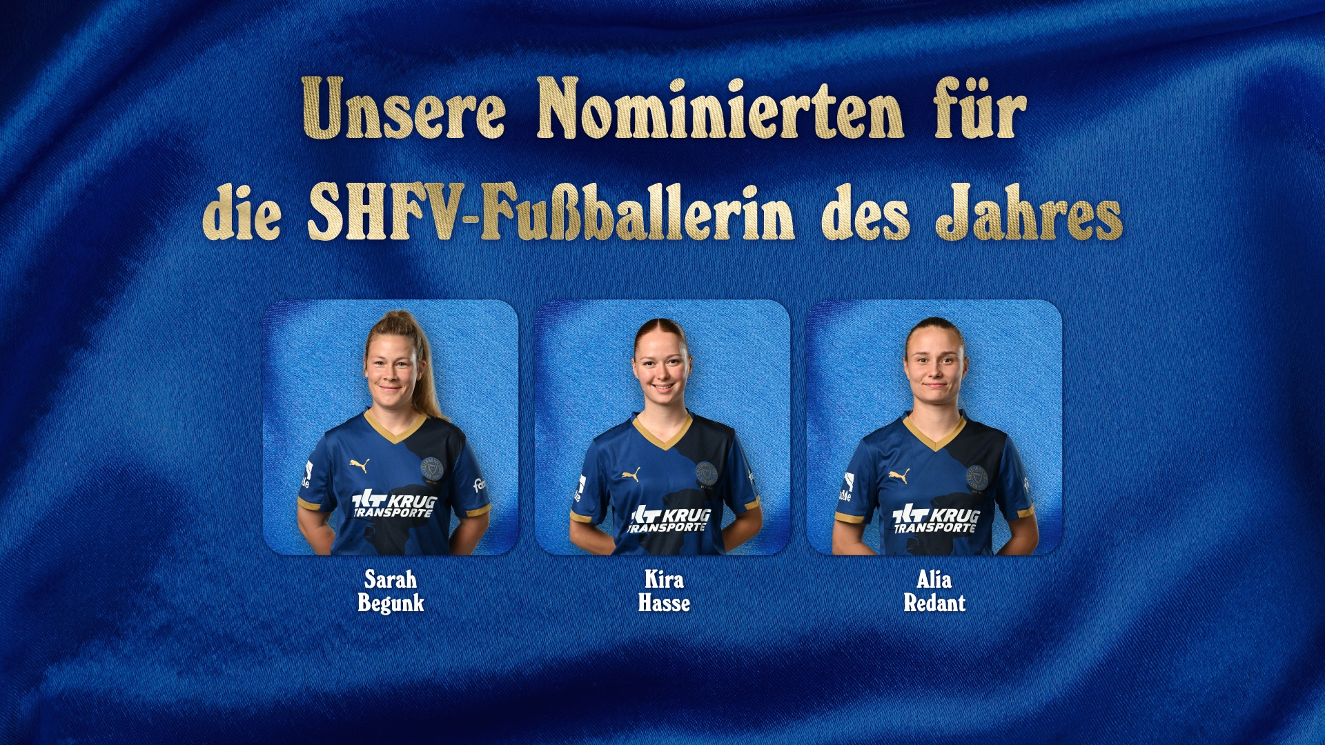 Mit Sarah Begunk, Kira Hasse und Alia Redant wurden gleich drei Spielerinnen der Holstein Women nominiert. Kapitänin Sarah Begunk trägt das Trikot der Women bereits seit 2012. Nach der Geburt ihres Sohnes feierte sie im vergangenen Jahr ihr erfolgreiches Comeback auf dem Platz und entwickelte sich schnell wieder zu einer tragenden Säule im Offensivspiel. Für besondere Torgefahr sorgt zudem Stürmerin Kira Hasse, die bereits in der vergangenen Saison, vor allem aber in der aktuellen Spielzeit, ihre Qualitäten unter Beweis stellt. Mit 13 Treffern in 12 Spielen führt sie derzeit die Torjägerinnenliste der Regionalliga Nord an. Einen wesentlichen Anteil an dieser starken Ausbeute hat auch Alia Redant: Die eigentliche Außenverteidigerin setzt sich immer wieder über die Flügel durch und sorgt mit präzisen Flanken für zusätzliche Offensivpower. Redant steht seit 2021 für Holstein auf dem Platz und wurde nach 2024 nun bereits zum zweiten Mal in Folge für die SHFV-Abstimmung nominiert.