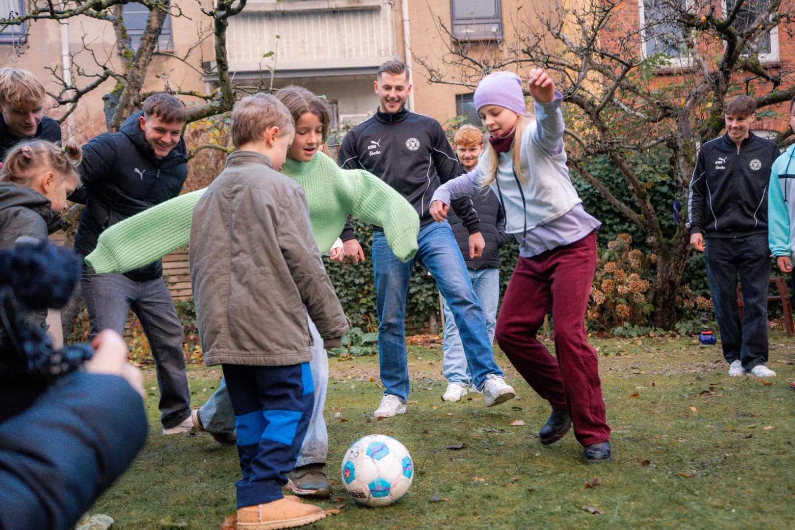 Die Profis von Holstein Kiel unterstützen das Projekt KLEE bereits seit mehreren Jahren und besuchen die Kinder der Einrichtung regelmäßig in der Vorweihnachtszeit. So waren am Mittwoch Luca Prasse, Timon Weiner, Niklas Niehoff, Phil Harres, Carl Johansson, Robert Wagner, Leon Parduzi und Louis Köster in der Waitzstraße zu Besuch. Zunächst spielten sie mit den Kindern im Garten eine Runde Fußball, anschließend stellten die Kinder neugierig Fragen an die Fußballer. Zum Abschluss überreichten unsere Störche Geschenktüten mit Mützen, Schals, Autogrammkarten und weiteren Überraschungen aus dem Holstein-Fanshop – zur großen Freude der Kinder.