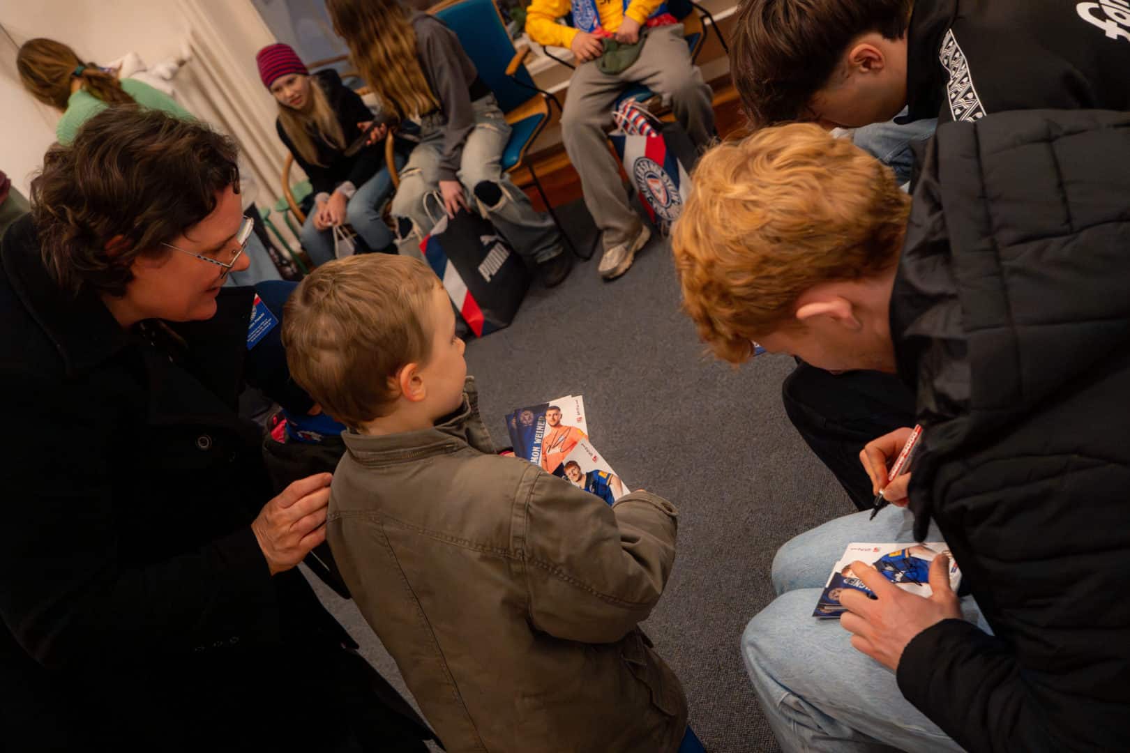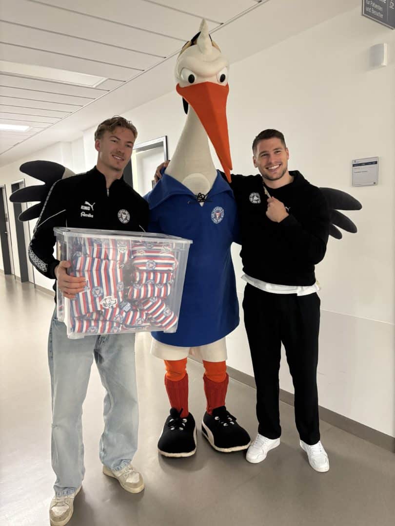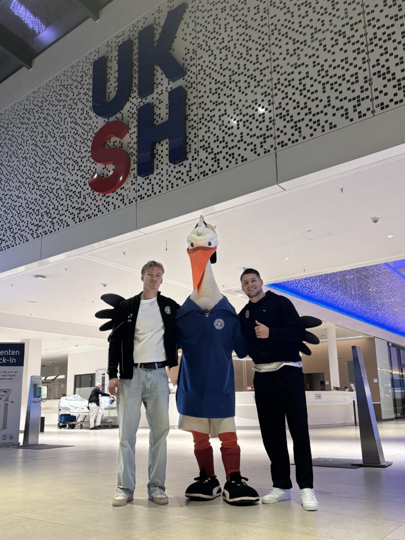 Am Donnerstag besuchten Jonas Krumrey und Marcus Müller gemeinsam mit KSV-Maskottchen Stolle die Kinderstation des UKSH in Kiel. Mit den Kindern und Jugendlichen im Alter von 2 bis 20 Jahren haben die Drei fleißig Fotos gemacht, Autogramme geschrieben und Holstein Kiel-Schals, -Mützen, -Stifte und mehr verschenkt. Auch die Eltern und Mitarbeitenden auf der Station – vom Pflegepersonal bis zur Oberärztin – haben sich sichtlich über den Besuch gefreut.