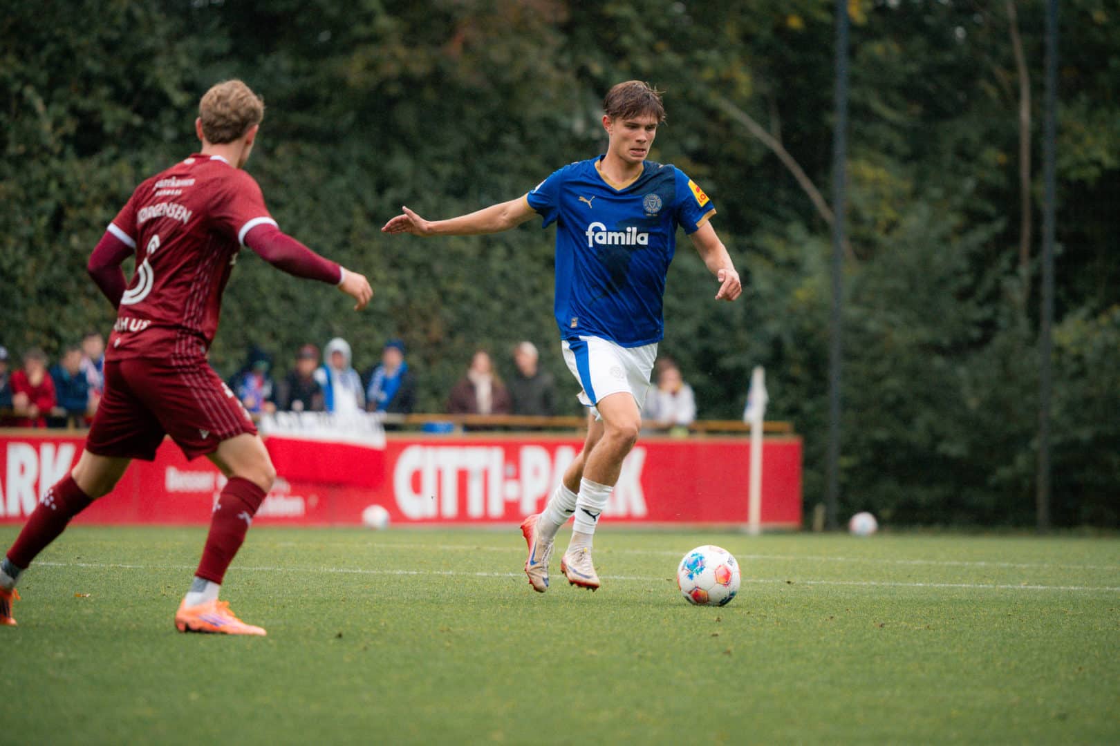 Von Beginn an kombinierten sich unsere Jungs schnell und schnörkellos nach vorne, die ersten Schussversuche von Lasse Rosenboom (2.) und Marcus Müller (5.) wurden aber jeweils geblockt. Auch danach spielte in der Anfangsphase nur Holstein: Jonas Therkelsens Schlenzer nach starkem Solo geriet zu zentral (9.) und Müllers Kopfball aus Rücklage verfehlte sein Ziel (14.). Stattdessen präsentierte sich Aarhus maximal effizient und ging mit dem ersten Schuss aufs Tor in Führung, als Eric Kahl den Ball nach einer Ecke am langen Pfosten aus kurzer Distanz über die Linie drückte (15.). Unsere KSV ließ sich von dem Rückstand nicht beirren, sondern kreierte auch in der Folge gute Möglichkeiten, doch Therkelsens Schuss aus 15 Metern lenkte Leopold Wahlstedt noch an die Latte (22.) und auch Steven Skrzybskis Aufsetzer aus der zweiten Reihe wehrte der AGF-Torhüter zur Seite ab (34.). Kurz vor der Pause konnte sich der Torwart der Gäste erneut auszeichnen: Nachdem Müller den Ball knapp rechts vorbeigeschoben hatte (44.), parierte Wahlstedt erst Robert Wagners Schuss aus kurzer Distanz (45.), ehe er auch im Eins gegen Eins gegen Therkelsen Sieger blieb und den Nachschuss von Müller ebenfalls über den Querbalken hinwegwischte (45.).