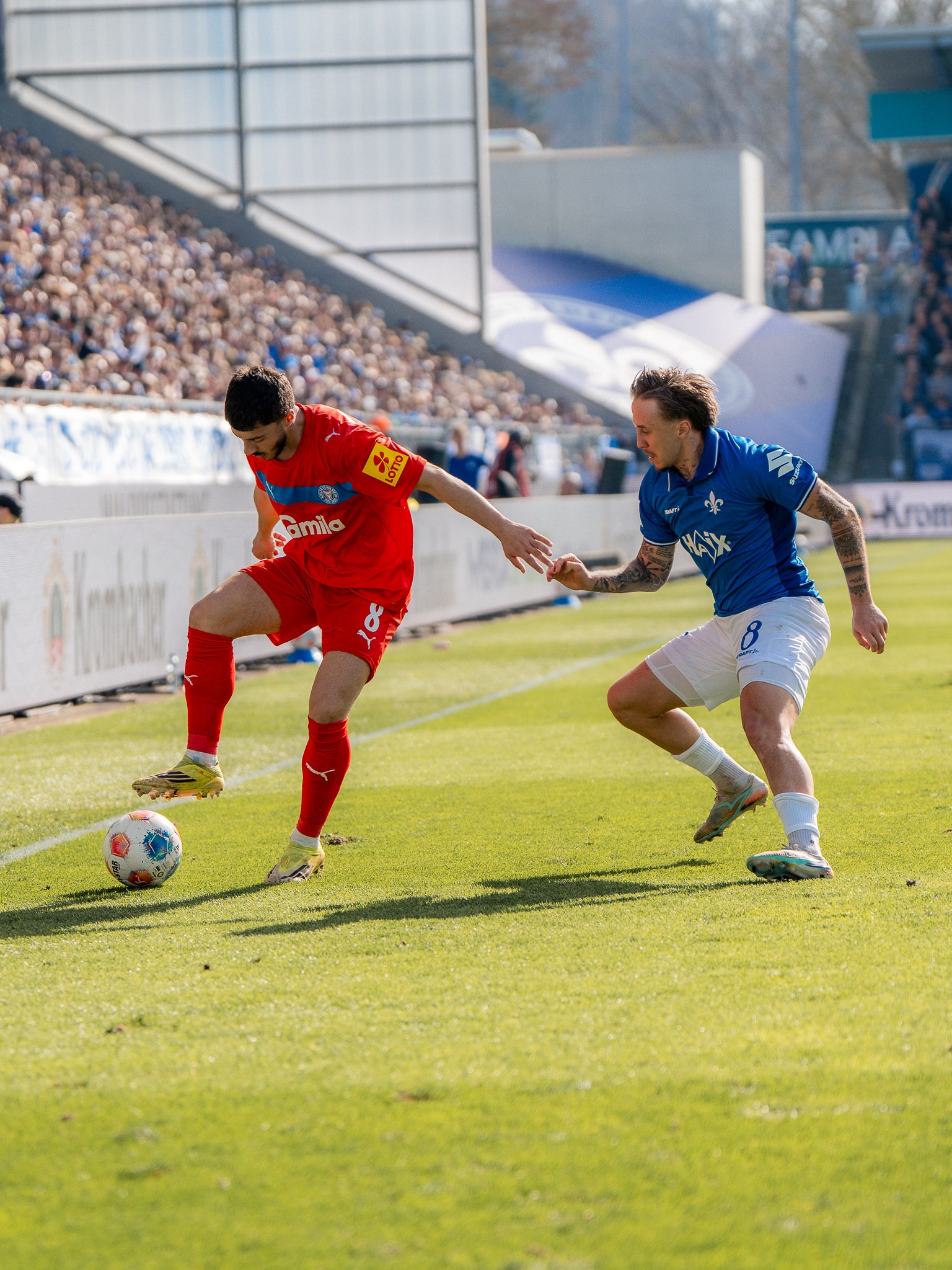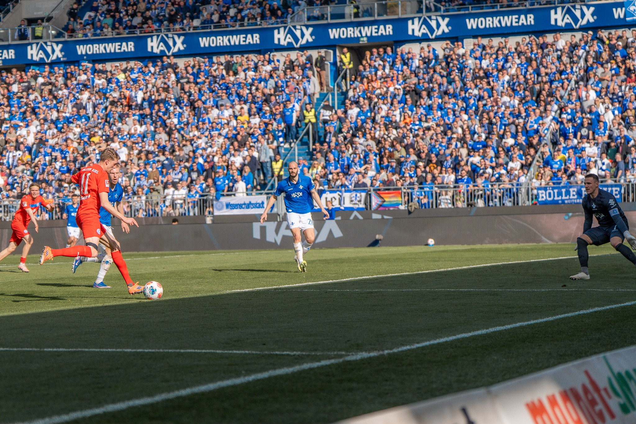 Nach dem Seitenwechsel sollte schnell die Vorentscheidung fallen. Darmstadt, das den Druck noch einmal erhöhte, ging durch Isac Lidberg in Führung. Der Schwede konnte nach einem Zuspiel von rechts Weiner umkurven (47.). Die Lilien blieben direkt dran. Zunächst rettete der Pfosten bei einem Schuss von Niklas Schmidt, dann nutzte der Mittelfeldspieler seine zweite Chance mit einem Flachschuss aus 13 Metern (52.). Gegen die ballsicheren Darmstädter investierten unsere Störche viel, um das Spiel offen zu halten. Gegen Ende des Spiels kam Holstein noch einmal zu höheren Balleroberungen. Den daraus resultierenden besten Angriff konnte Jonas Therkelsen jedoch nicht zum Anschlusstreffer verwerten (79.). So blieb es beim 0:2 aus Sicht der Störche.