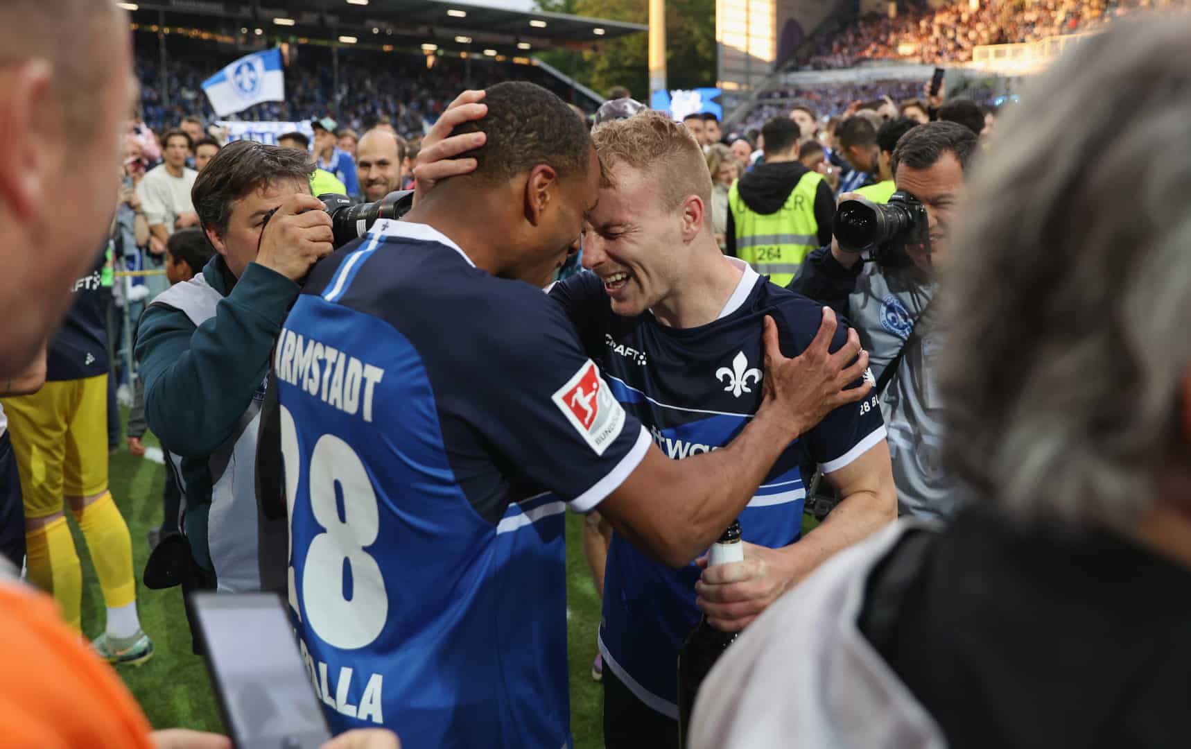 Jubel bei Fabian Holland (re.) nach dem Bundesliga-Aufstieg der Lilien im Jahr 2023. Holland ist bereits seit 2015 beim SVD (Foto: IMAGO / HMB-Media).