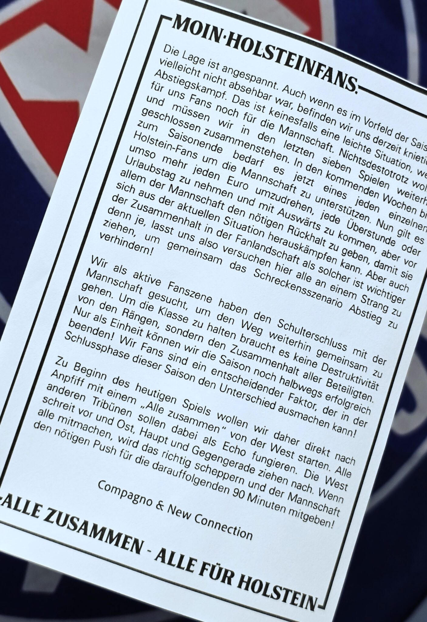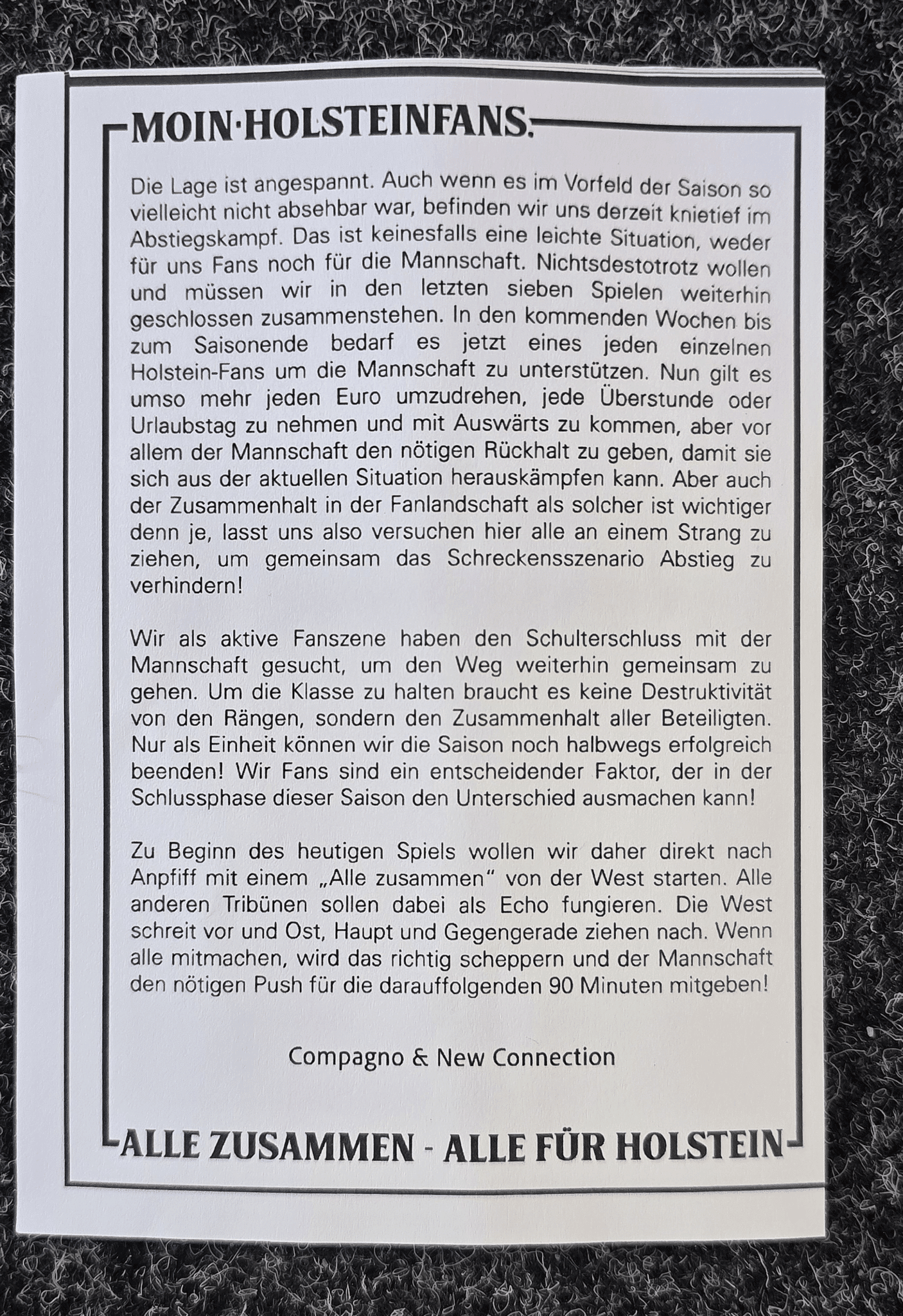 „In den kommenden Wochen bis zum Saisonende bedarf es jetzt eines jeden einzelnen Holstein-Fans, um die Mannschaft zu unterstützen. Nun gilt es umso mehr, jeden Euro umzudrehen, jede Überstunde oder jeden Urlaubstag zu nehmen und mit auswärts zu kommen, aber vor allem der Mannschaft den nötigen Rückhalt zu geben, damit sie sich aus der aktuellen Situation herauskämpfen kann. Aber auch der Zusammenhalt in der Fanlandschaft als solcher ist wichtiger denn je. Lasst uns also versuchen, hier alle an einem Strang zu ziehen, um gemeinsam das Schreckensszenario Abstieg zu verhindern!“, hieß es von Seiten der organisierenden Fan-Gruppierungen Compagno & New Connection. Dabei erteilt die aktive Fanszene Destruktivität von den Rängen eine klare Absage: „Nur als Einheit können wir die Saison noch halbwegs erfolgreich beenden. Wir Fans sind ein entscheidender Faktor, der in der Schlussphase dieser Saison den Unterschied ausmachen kann!“