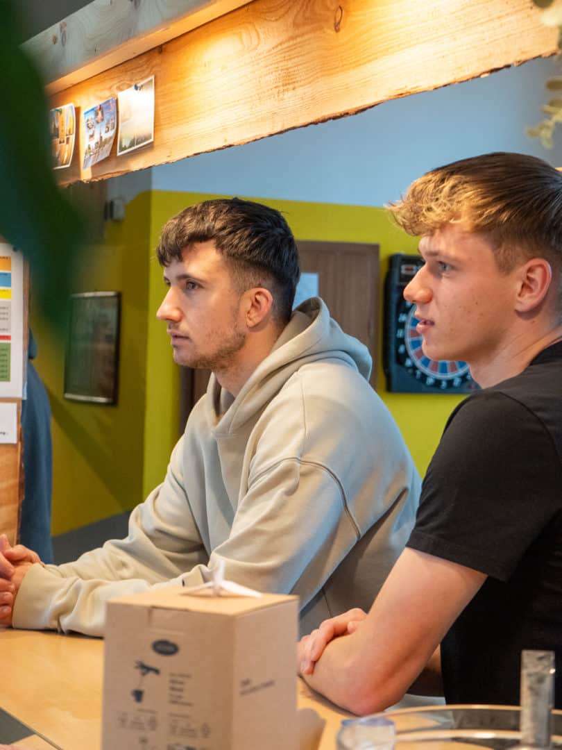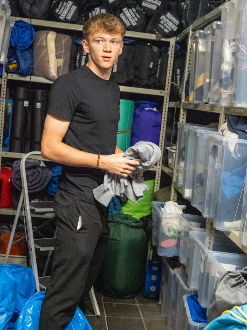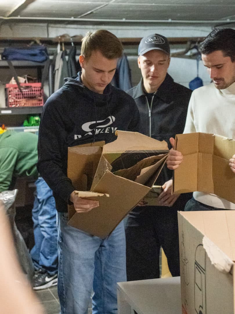 Parallel packte die zweite Gruppe im Sozial-Haus kräftig mit an: Bei der Essens- und Getränkeausgabe, beim Sortieren von Kleidung und Sachspenden in der berüchtigten „Kammer des Schreckens“ und im direkten Austausch mit Mitarbeitenden und Gästen. Die Spieler nutzten die Gelegenheit, viele Fragen zu stellen und Einblicke in Abläufe und Herausforderungen der Einrichtungen zu gewinnen.