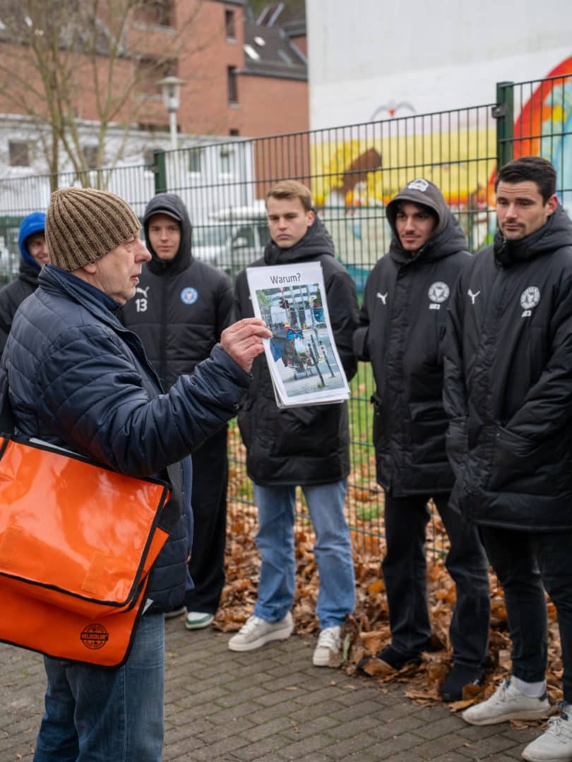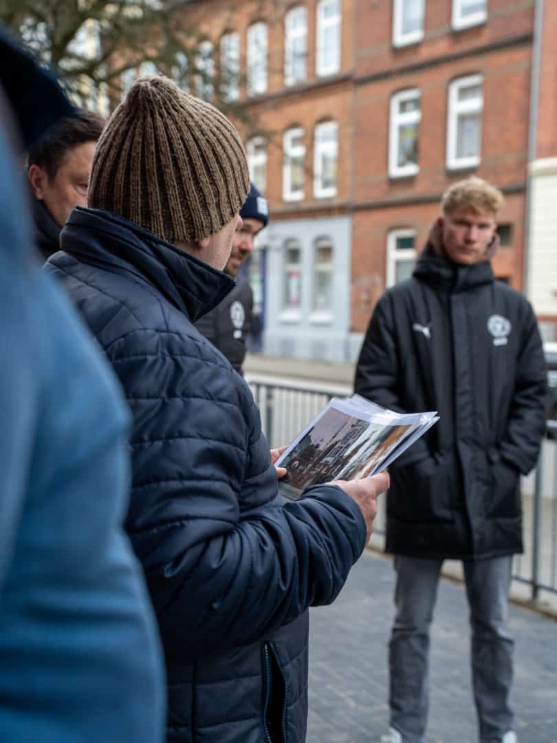 Aufgeteilt in zwei Teams startete unsere U23 am Vormittag in unterschiedliche Programmpunkte: Eine Gruppe begleitete Hans-Peter, ehrenamtlicher Stadtführer des Kieler Ankers, auf eine Stadtführung der besonderen Art. „HP“ erzählte offen von seiner eigenen Geschichte und den Herausforderungen, die ihn zeitweise in eine schwierige Lebenssituation gebracht haben. Auch über Ursachen von Obdachlosigkeit und die täglichen Hürden auf der Straße sprach er mit den Spielern. Die Führung endete schließlich an der Bahnhofsmission im Kieler Hauptbahnhof.