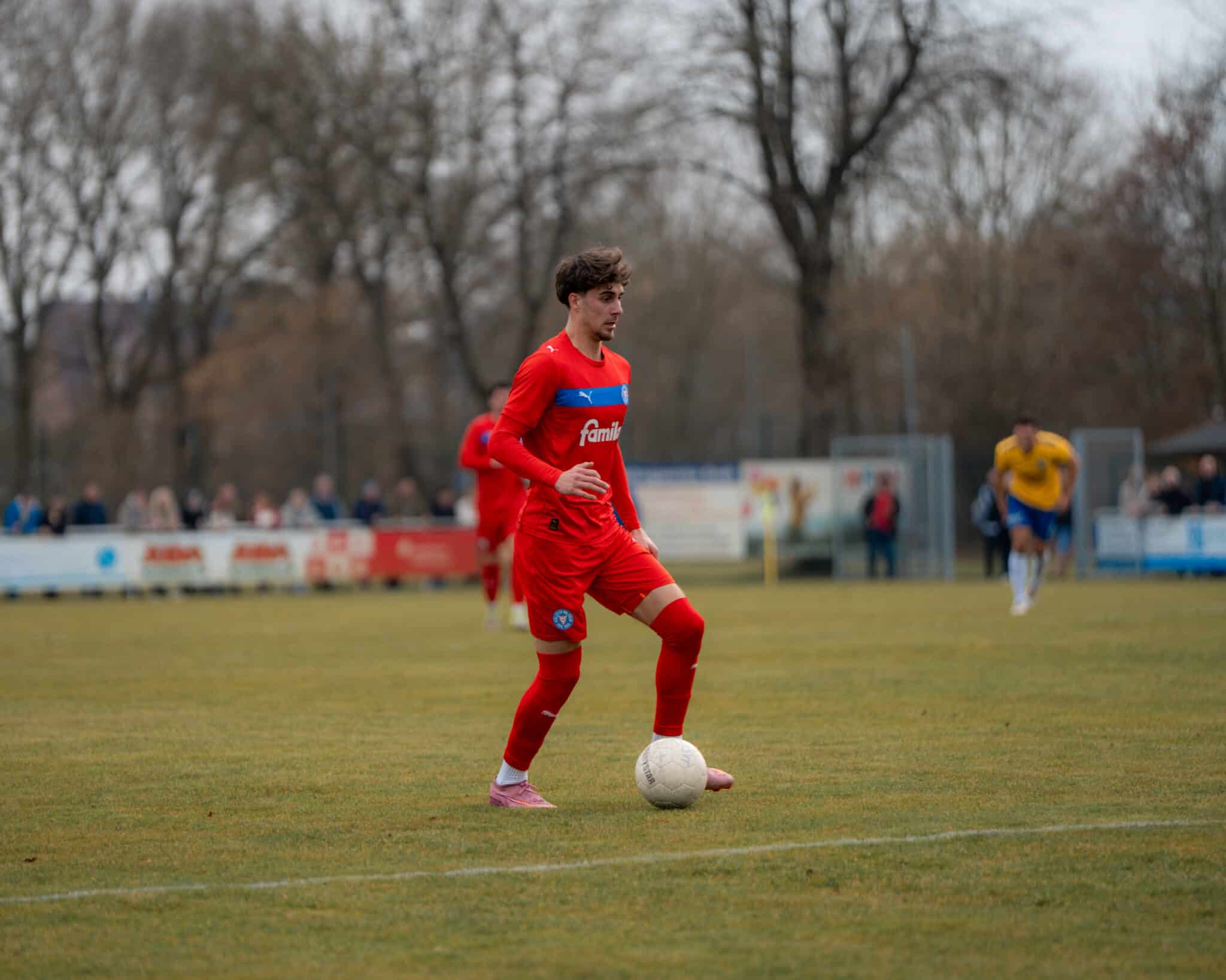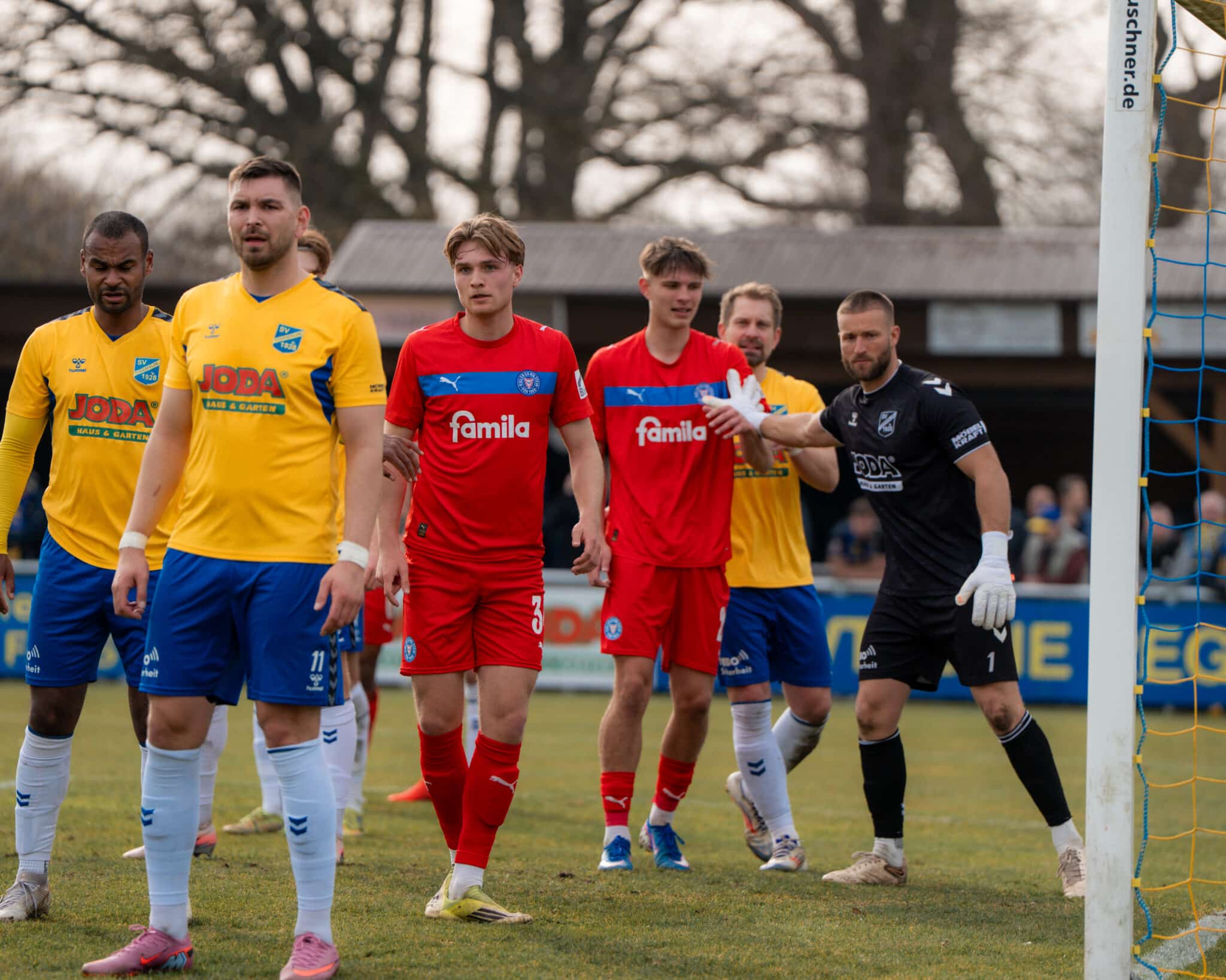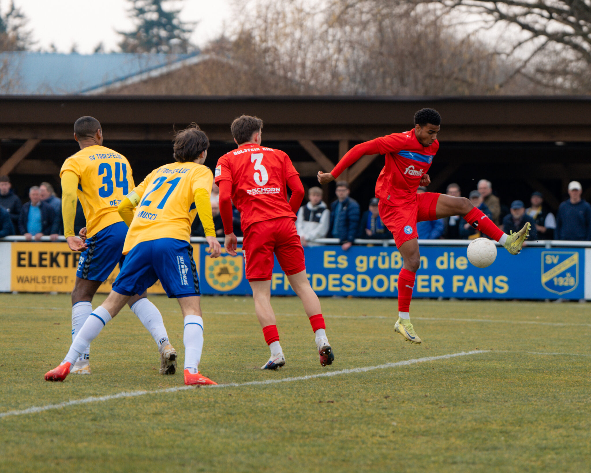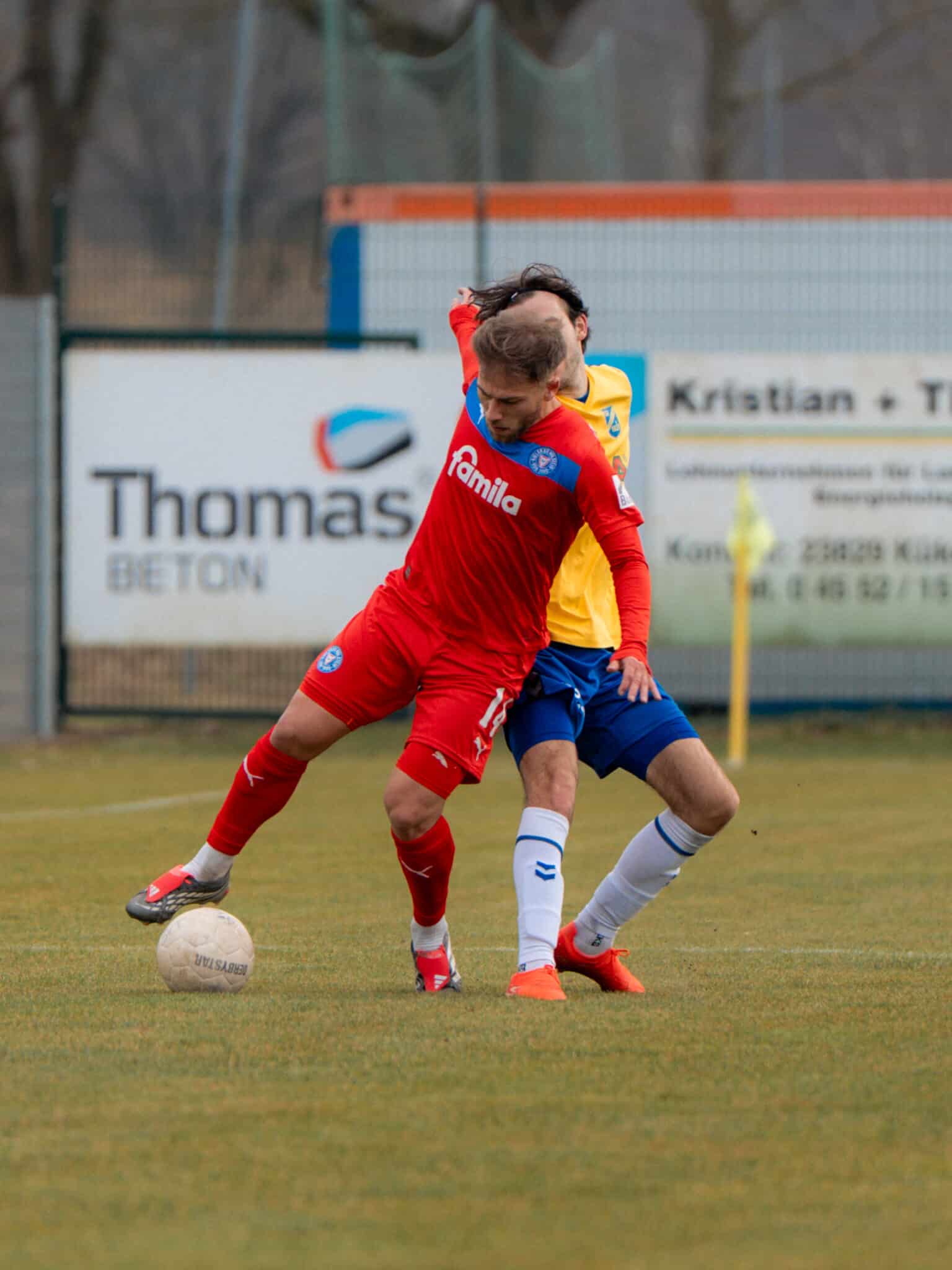 Es folgte eine kurze Druckphase der Todesfelder, die aber wieder durch eine gute Chance von Holsteins U23 beendet wurde. Auf Vorarbeit von Jakupovic schloss Niehoff in unmittelbarer Tornähe ab. Der Todesfelder Keeper Fabian Landvoigt konnte den Treffer aber im letzten Moment vereiteln. Wenig später war Landvoigt dann geschlagen – doch der Pfosten rettete für ihn. Holstein-Kapitän Malte Petersen hatte zuvor aus der Distanz abgezogen. Von dem Pech ließen sich unsere Jungstörche allerdings nicht beirren. Per direktem Freistoß aus halblinker Position zwang der umtriebige Niehoff den gegnerischen Torwart nach einer guten halben Stunde zu einer weiteren Parade. Und noch vor der Pause sorgte Niehoff abermals für Gefahr. Sein scharf getretener Freistoß von der linken Seite konnte nur mit Mühe vom Todesfelder Schlussmann entschärft werden. So blieb es vor der Halbzeitpause trotz des enormen Aufwands der Kieler beim torlosen Unentschieden.