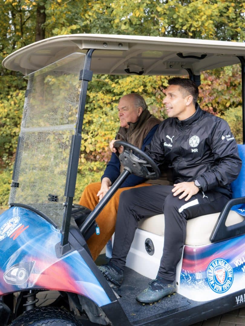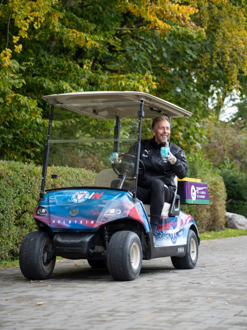 Gemeinsam mit Rapp setzte sich Steffen Schneekloth für die Anschaffung ein und fand mit Wilhelm Eckhard Sindt genau den richtigen Ansprechpartner für dieses Unterfangen. Dass das Golf-Car nun auch tatsächlich im Training der Störche im Einsatz ist, freut auch Sindt, der regelmäßig die Heimspiele im Holstein-Stadion besucht: „Viele Spieler spielen regelmäßig Golf auf unserer Anlage in Altenholz. Umso mehr freut es uns, jetzt auch etwas zurückgeben zu können.“