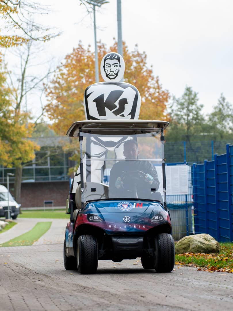 Rund 400 Meter Fußweg liegen zwischen den Mannschafts-Räumlichkeiten und den Trainingsplätzen P3 und P4 auf dem Gelände unserer KSV in Projensdorf. Dorthin, wo die Profis regelmäßig trainieren, mussten Getränkekästen, Ballsäcke und Co. bislang per Hand transportiert werden. Einen entscheidenden Vorteil in Sachen Logistik bietet jetzt ein neues Golf-Car.