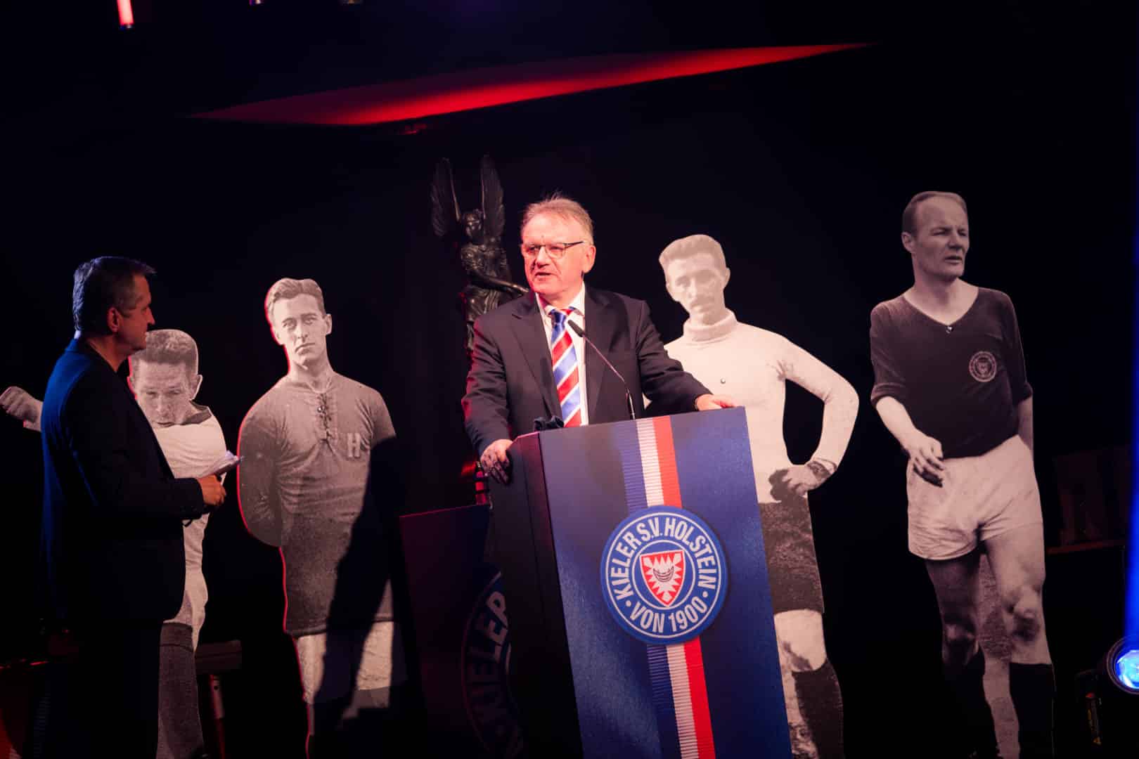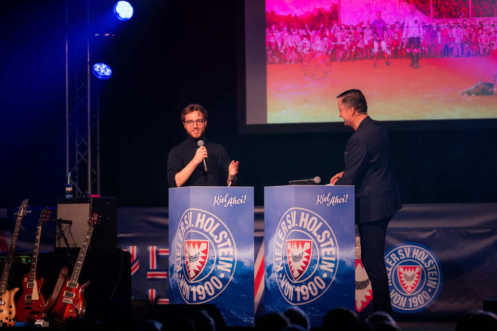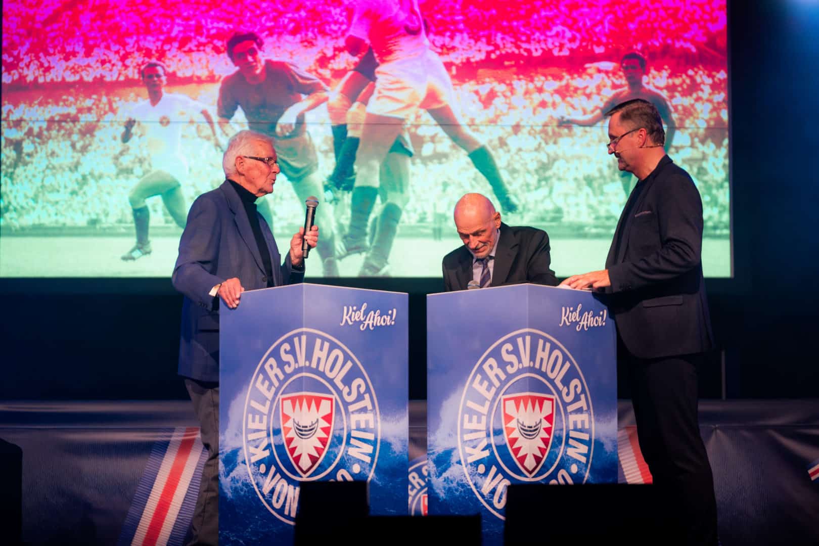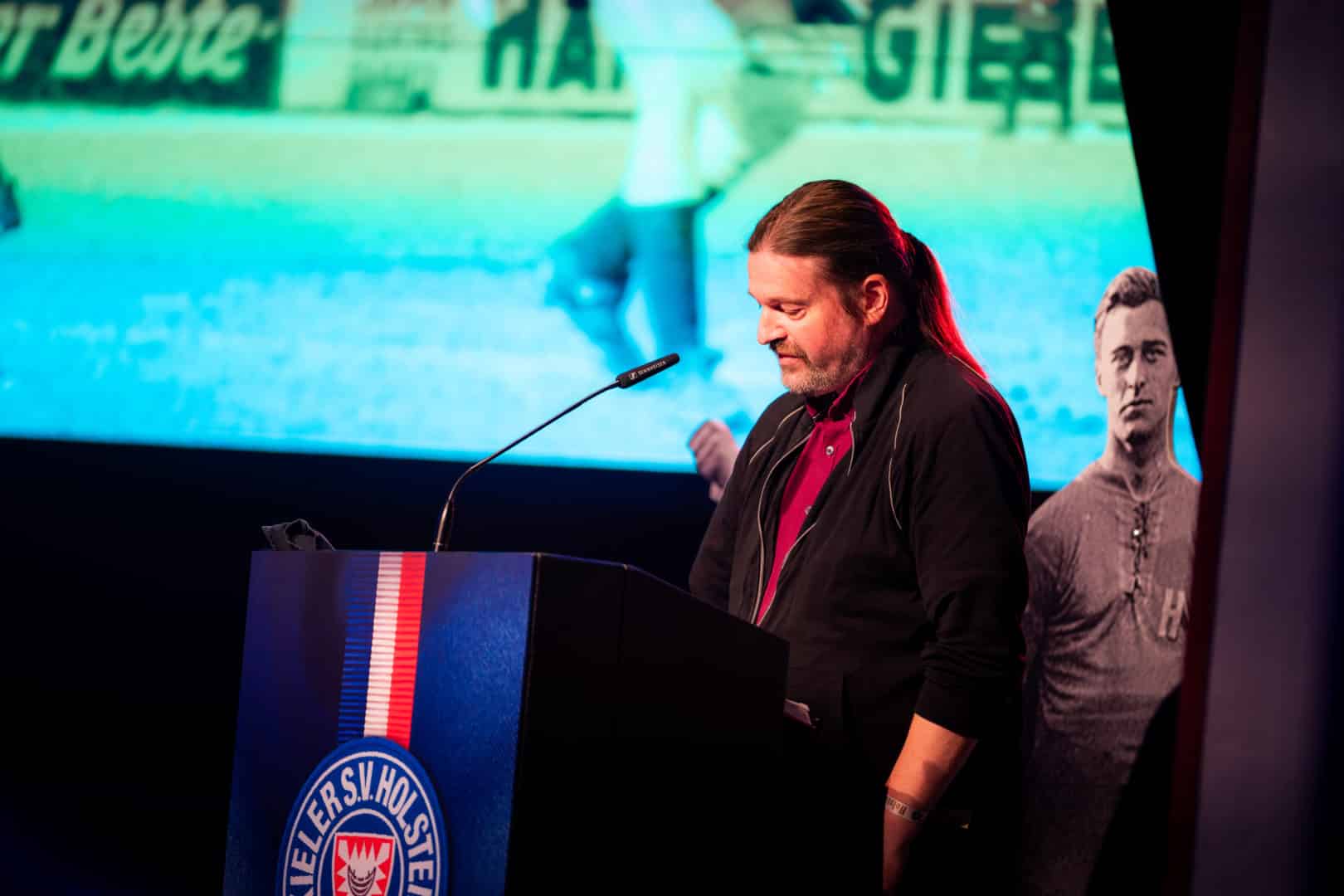 Moderator Andreas Käckell brachte das Ambiente des gesamten Abends schon früh passend auf den Punkt, als er die Atmosphäre „wie bei einem großen Klassentreffen“ beschrieb. Clubhistoriker Patrick Nawe, Herausgeber des großen Jubiläumsbuches „DIE CHRONIK“, lieferte zu Beginn eine erste historische Einordnung, in der er festhielt: „Holstein Kiel war, bleibt und ist ein großer Traditionsverein und wird immer zum obersten Regal deutscher Fußballkunst und -kultur gehören – unabhängig von der Ligazugehörigkeit.“