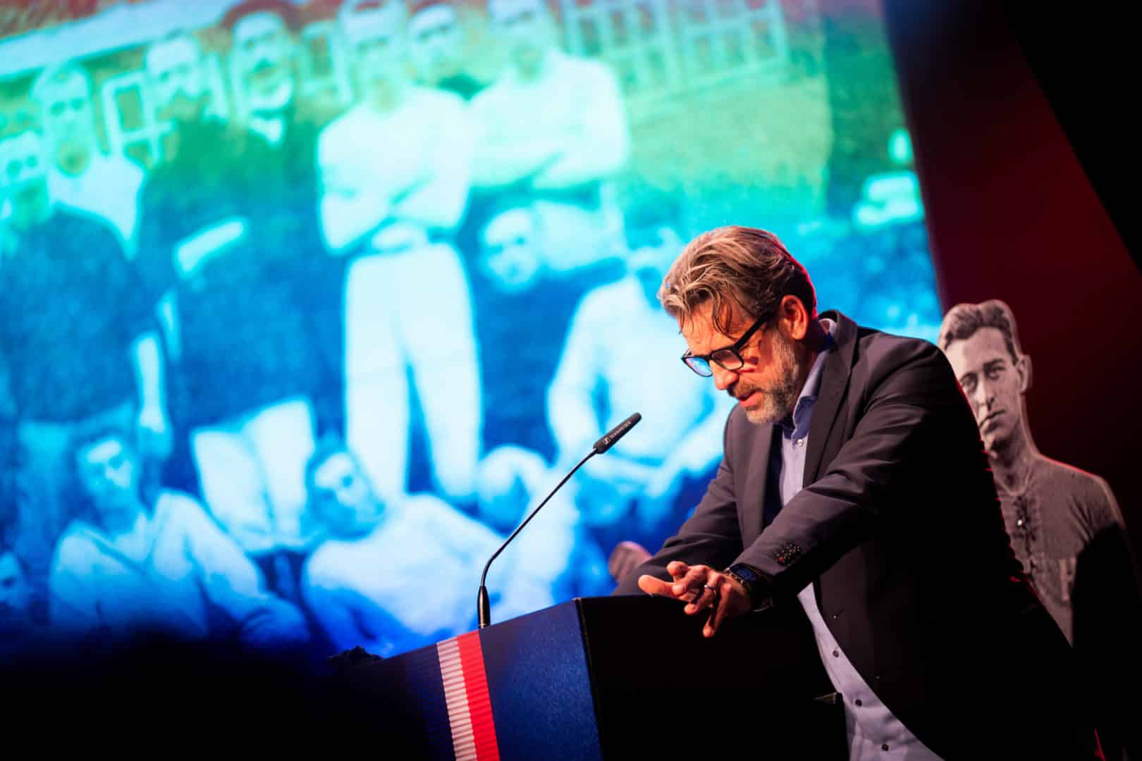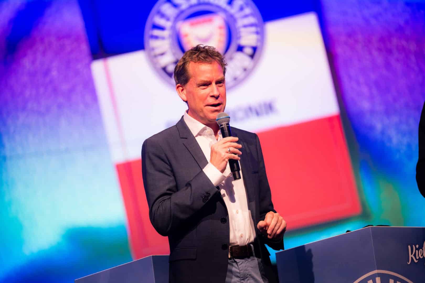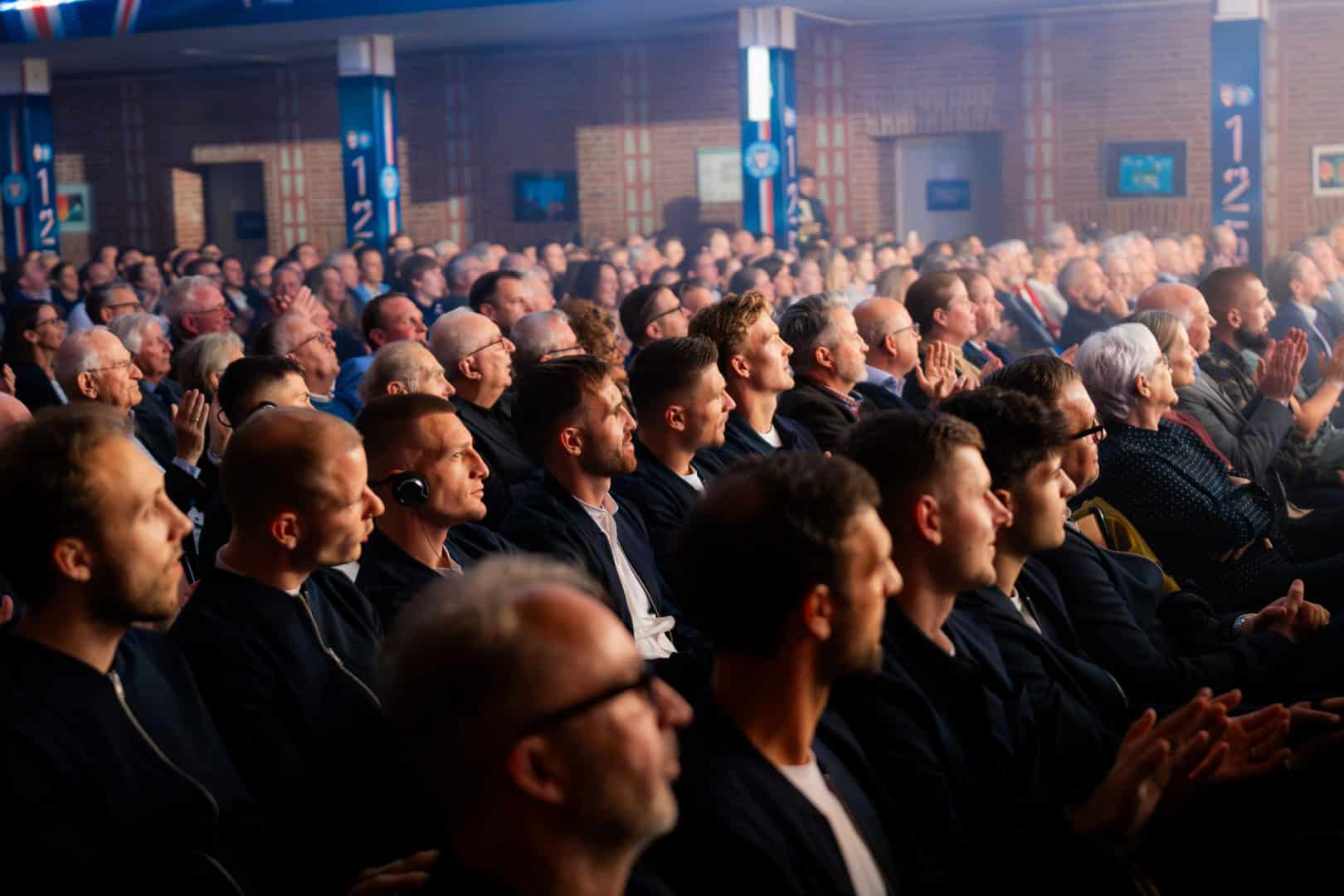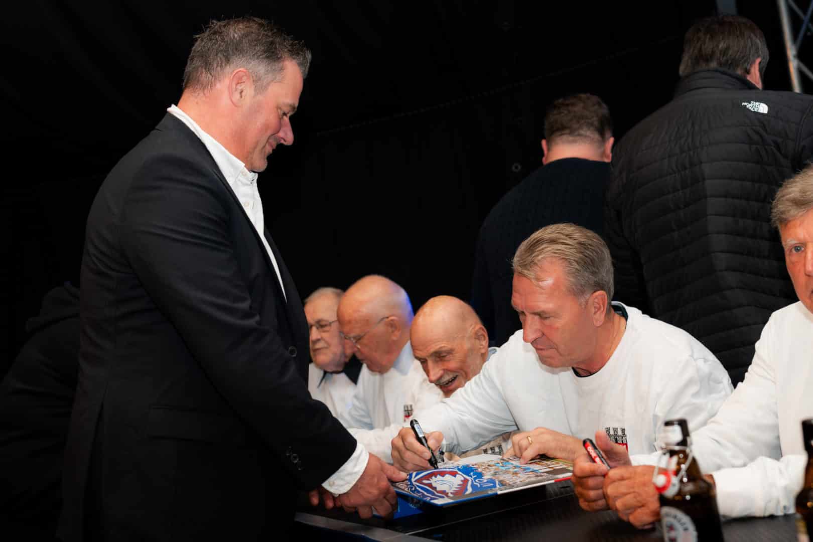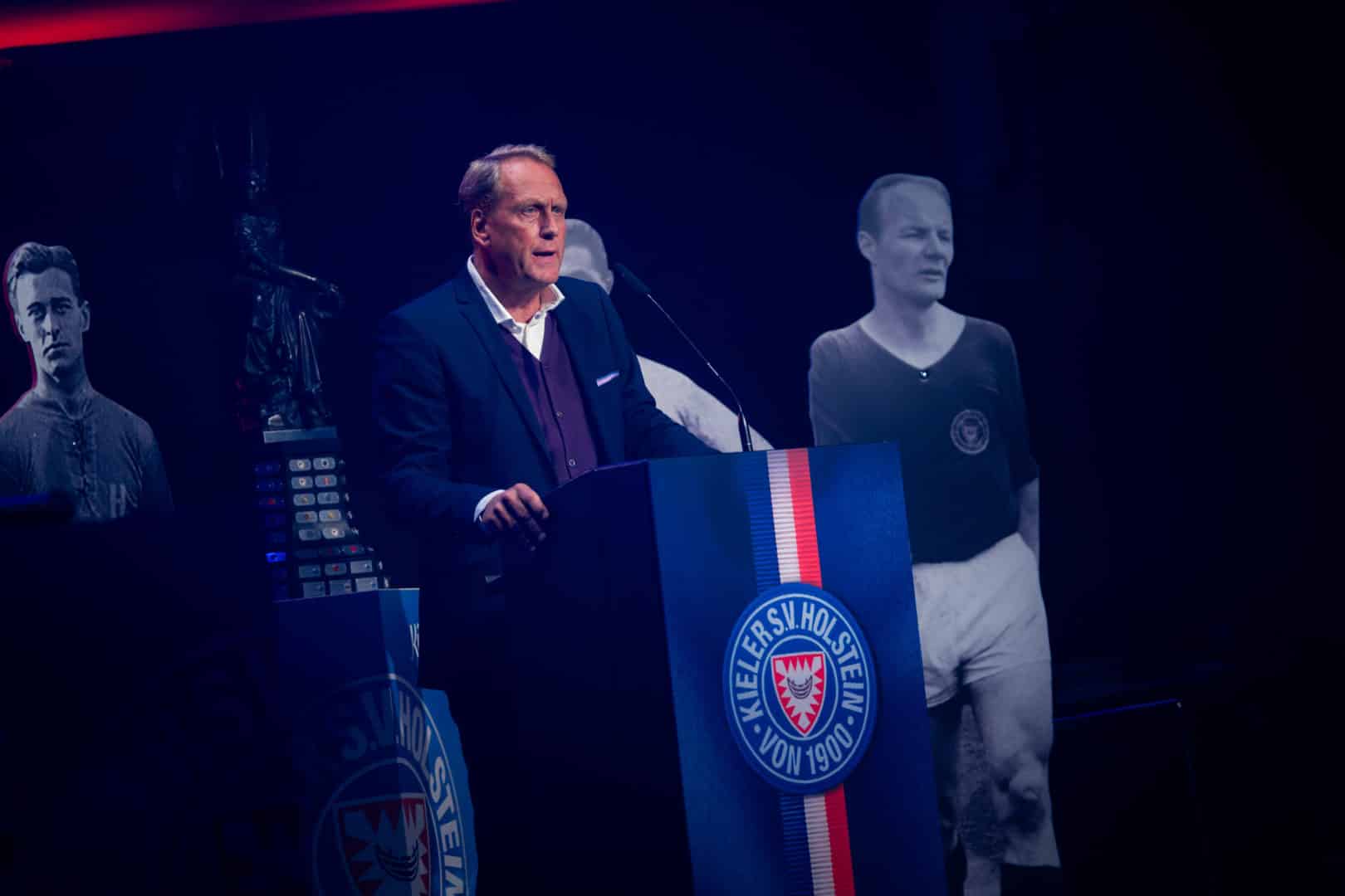 Moderator Andreas Käckell brachte das Ambiente des gesamten Abends schon früh passend auf den Punkt, als er die Atmosphäre „wie bei einem großen Klassentreffen“ beschrieb. Clubhistoriker Patrick Nawe, Herausgeber des großen Jubiläumsbuches „DIE CHRONIK“, lieferte zu Beginn eine erste historische Einordnung, in der er festhielt: „Holstein Kiel war, bleibt und ist ein großer Traditionsverein und wird immer zum obersten Regal deutscher Fußballkunst und -kultur gehören – unabhängig von der Ligazugehörigkeit.“