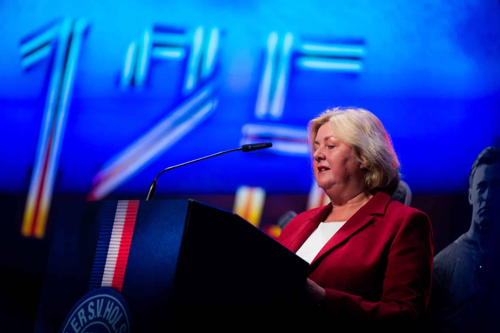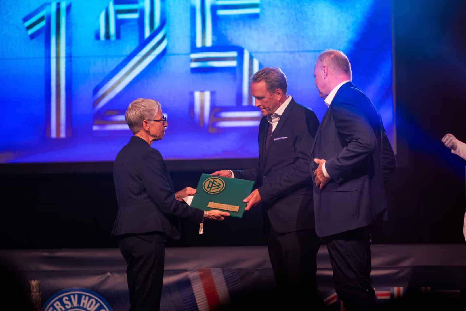 Es folgten gratulierende Worte gleich mehrerer Ehrengäste. „Die Fußballerinnen und Fußballer, Mitglieder und Fans von Holstein Kiel haben sich ihre norddeutsche Bescheidenheit stets bewahrt. Die KSV ist ein Verein, der Menschen zusammenführt, sie begeistert und ganz Schleswig-Holstein guttut. Wir als Land sind verdammt stolz auf Holstein Kiel“, lobte Magdalena Finke, Staatssekretärin im Ministerium für Inneres, Kommunales, Wohnen und Sport. Kiels Stadtpräsidentin Bettina Aust ergänzte: „Es ist eine besondere Freude, einem der Aushängeschilder unserer Stadt heute zum 125. Jubiläum zu gratulieren. Die KSV ist tief in unserer Stadtgesellschaft verwurzelt und lehrt Kindern und Jugendlichen einen Teamgeist, den unsere Gesellschaft so dringend braucht.“ Meike Evers-Rölver, Vizepräsidentin des Landessportverbands Schleswig-Holstein, gab unserem Verein beste Wünsche mit auf den Weg: „Möge die KSV auch in Zukunft mit der gleichen Leidenschaft, Zusammenhalt und Innovationskraft wirken, wie sie es in den vergangenen 125 Jahren gemacht hat.“ Zudem wurde unser Verein zum Jubiläum seitens des Deutschen Fußball-Bundes durch Sabine Mammitzsch, DFB-Vizepräsidentin für Frauen- und Mädchenfußball, geehrt.