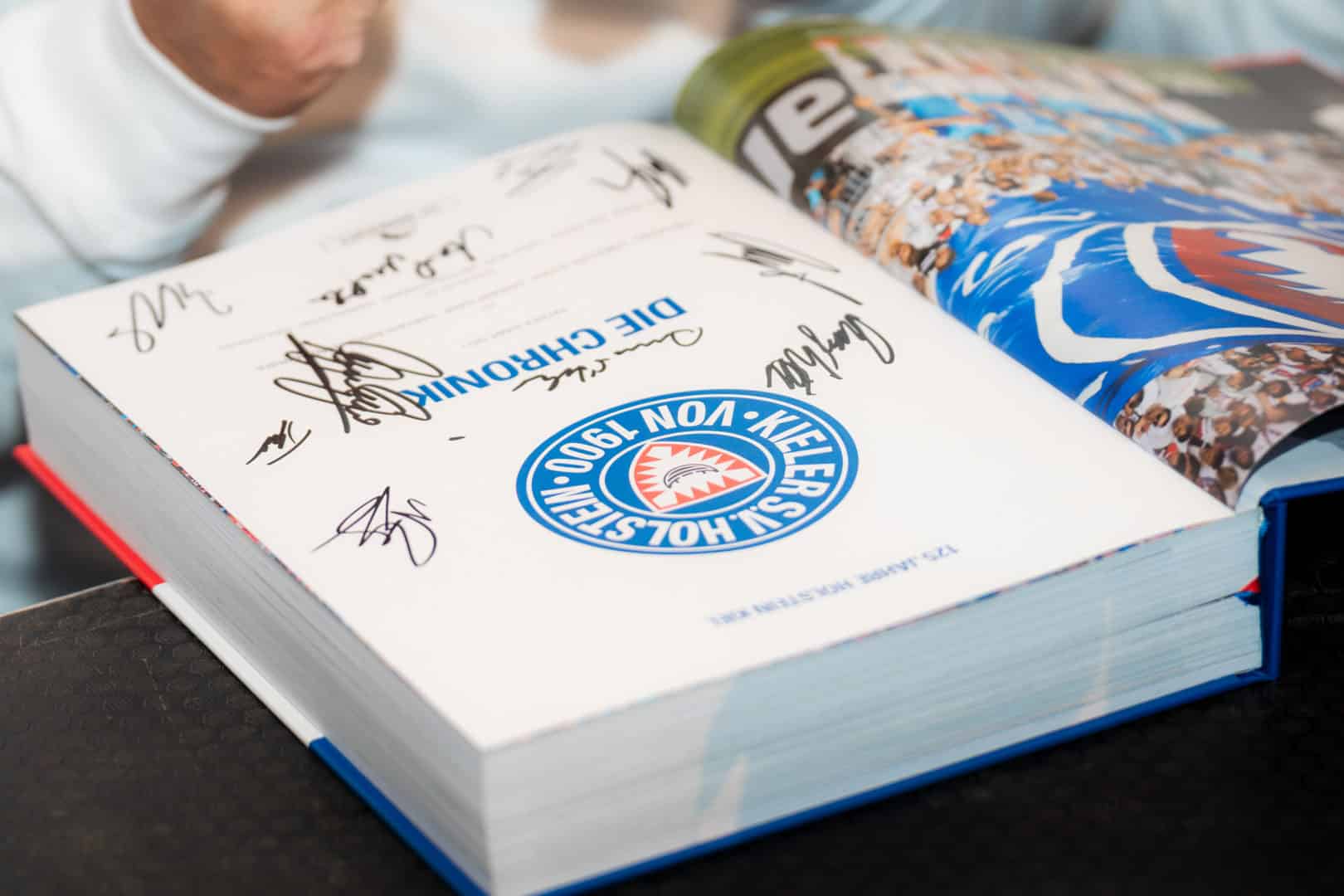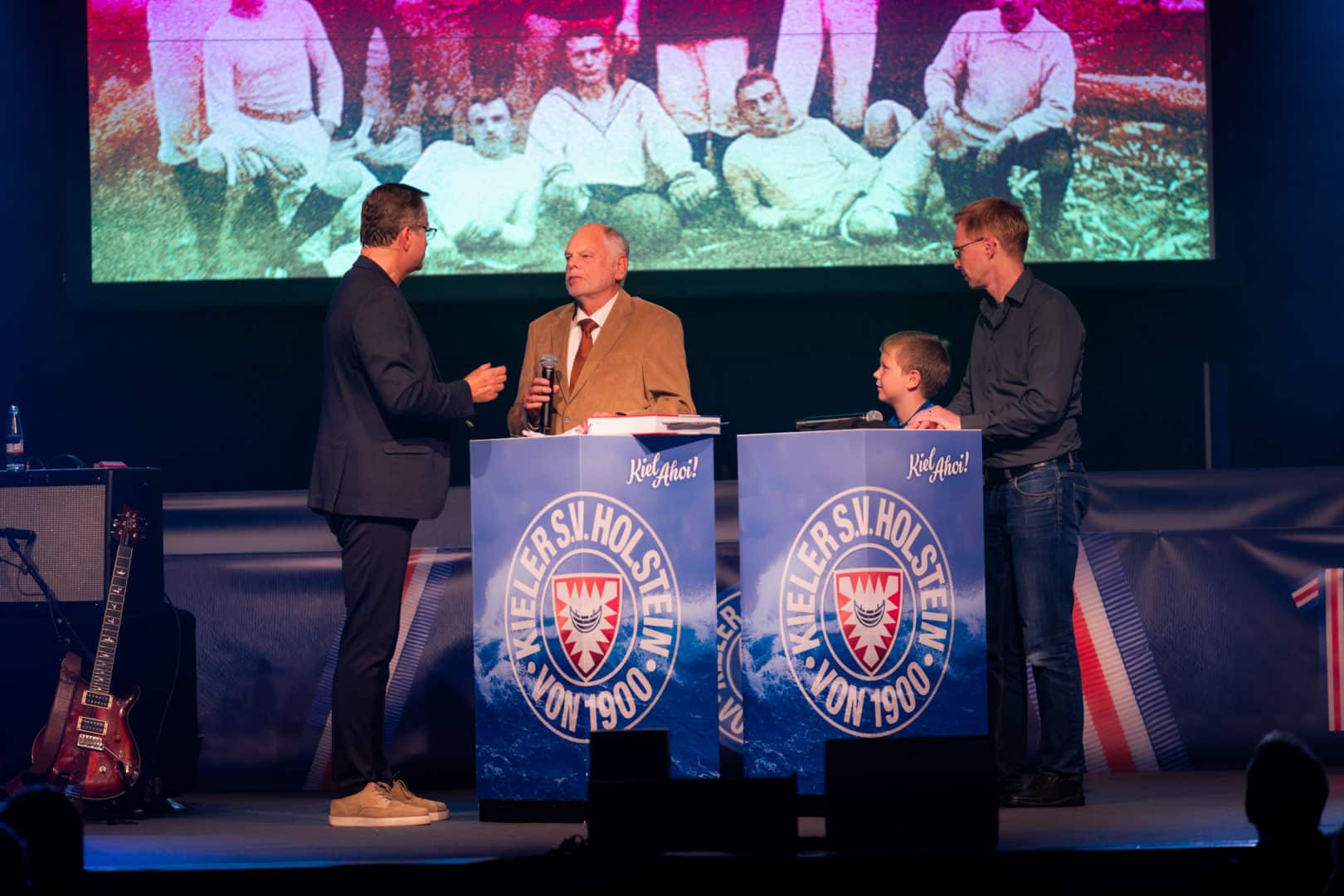 Auch nach der Pause blieb es vielseitig: Mit Gerhard Freudenthal (Enkel von Walter Duden) und Frank und Justus Blaschke (Ur- und Ururenkel des ersten Torschützen der Vereinsgeschichte Georg Blaschke) kamen die Ahnen zweier Vereinsmitgründer zu Wort. Tom Scheffer, Absolvent der Muthesius Kunsthochschule Kiel und freischaffender Künstler, berichtete davon, wie er das entscheidende Elfmetertor von Ernst Möller zum Gewinn der deutschen Meisterschaft im Jahre 1912 basierend auf Quellen rekonstruierte. Mit Peter Rautenberg und Jürgen Horn wurden zwei Gewinner der deutschen Amateurmeisterschaft 1961 von Kiels Oberbürgermeister Ulf Kämpfer geehrt. Eine Ehrung erhielten auch Holsteins Handballerinnen für den Gewinn der deutschen Meisterschaft 1971, die ihnen von Fin Bartels, Enkel des damaligen Trainer Kurt Bartels, und unserem kaufmännischen Geschäftsführer Wolfgang Schwenke, selbst einst erfolgreicher Handballer, überreicht wurde. Nicht fehlen durfte natürlich Andreas Köpke, als Welt- und Europameister erfolgreichster Kieler Fußballer aller Zeiten, der auf der Bühne gemeinsam mit Immo Stelzer in alten Zeiten schwelgte. Garniert wurde das Programm regelmäßig durch kurze Lesungen aus der Chronik, beispielsweise zur Gründung des Vereins, Holsteins Rolle im 3. Reich oder der Historie der Rivalität mit dem VfB Lübeck, die von den Mitautoren Dr. Tim Cassel, Dr. Jürgen Weber und Christian Jessen vorgetragen wurden.