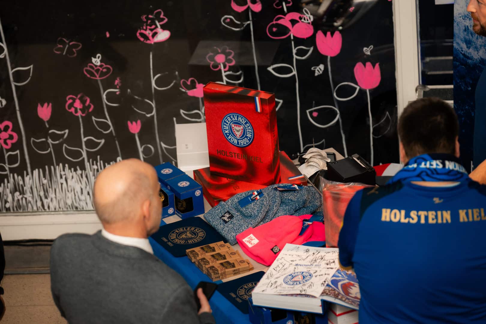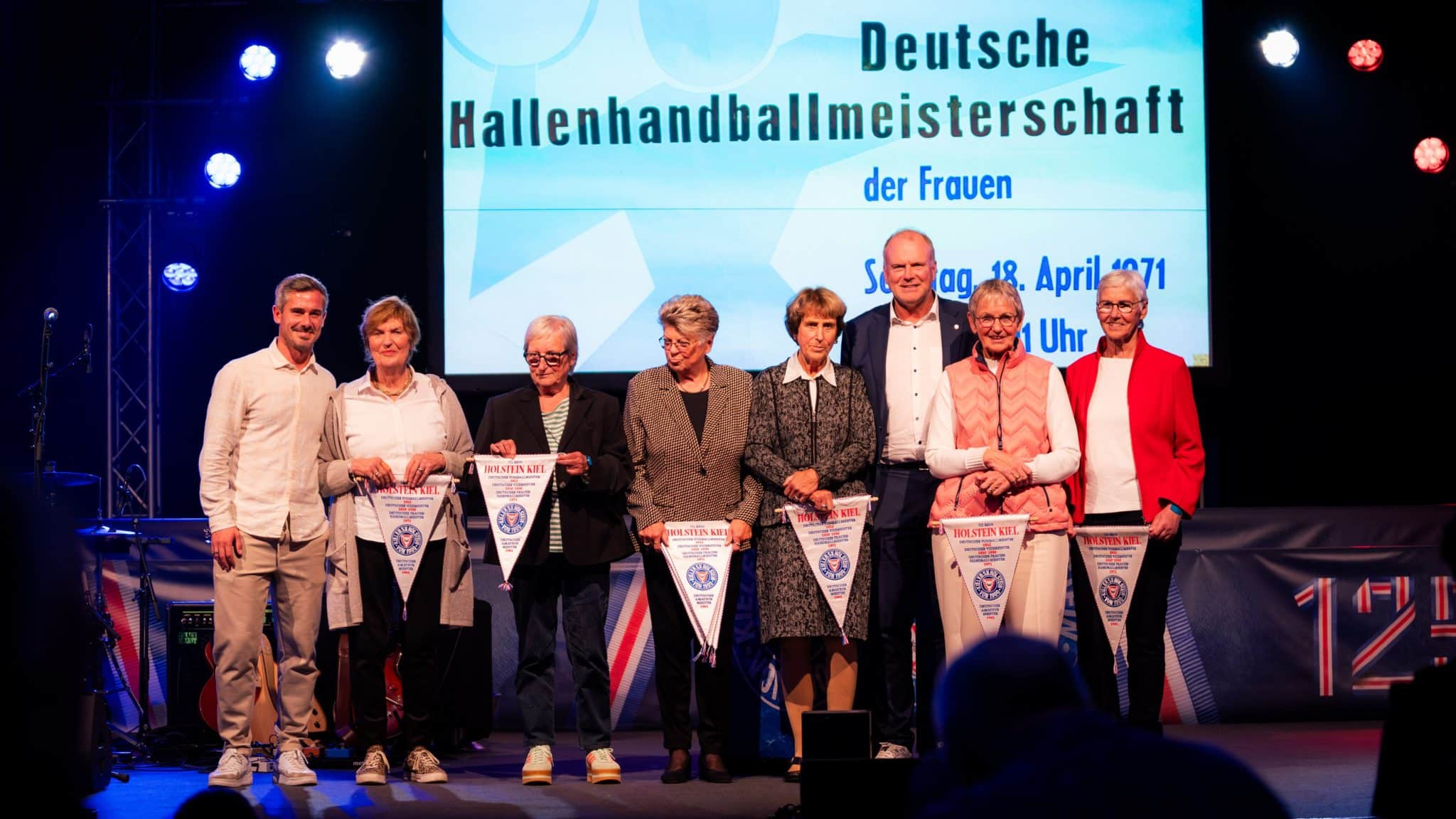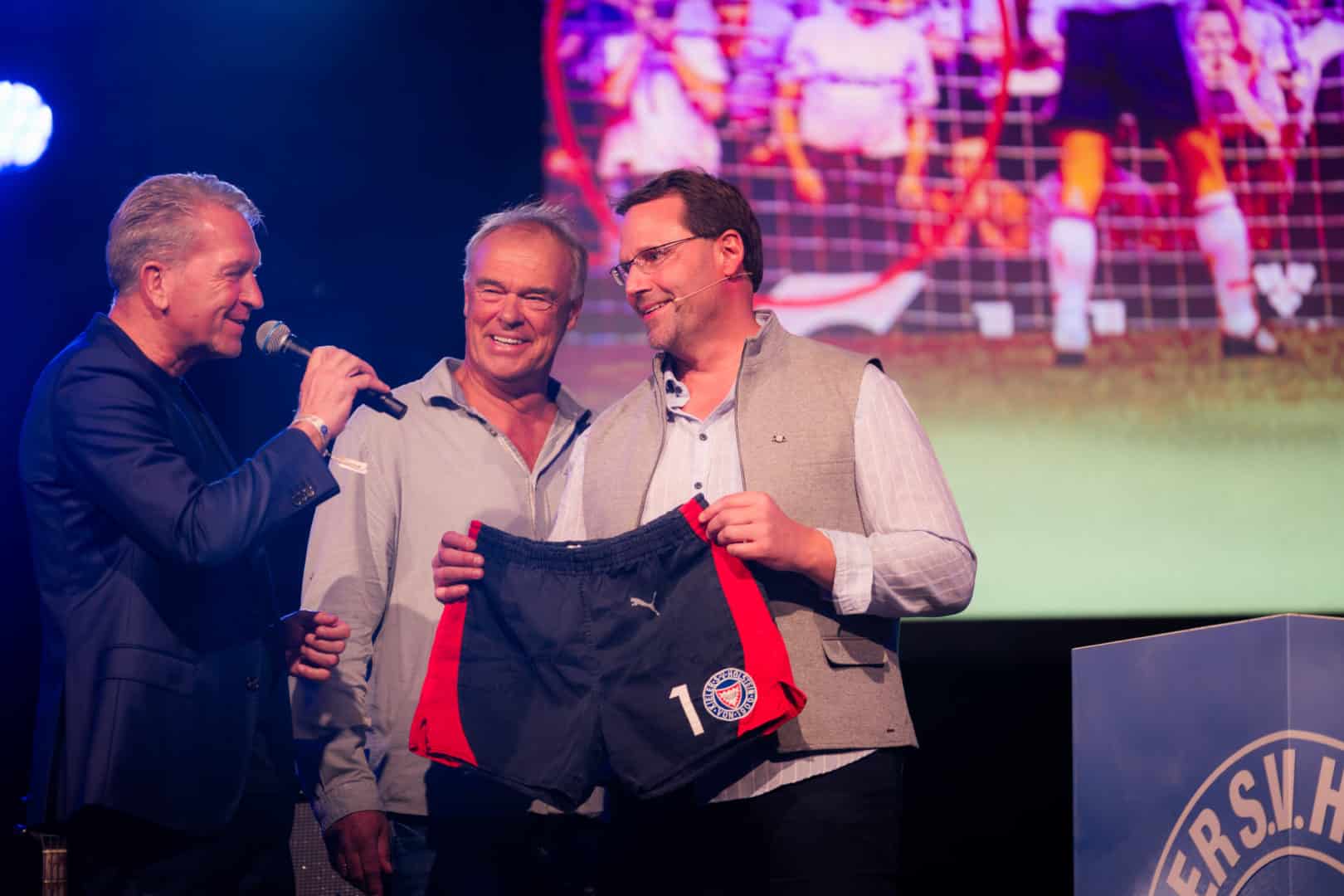 Die Gala hatte auch im weiteren Verlauf ein Potpourri an blau-weiß-roten Highlights zu bieten. So wurden die Gäste in der Aula der Hebbelschule dank kurzweiliger Talkrunden bestens unterhalten. Erst sprachen Ex-Spielerin Rachel Hummel, Ex-Trainer Heinz Siebolds und die aktuelle Kapitänin Sarah Begunk über die Entwicklung der Holstein Women, ehe zahlreiche Holstein-Legenden im Retrotrikot die Bühne enterten und im Gespräch mit Käckell und Nawe den einen oder anderen Schwank aus mehreren Jahrzehnten Holstein Kiel zum Besten gab.