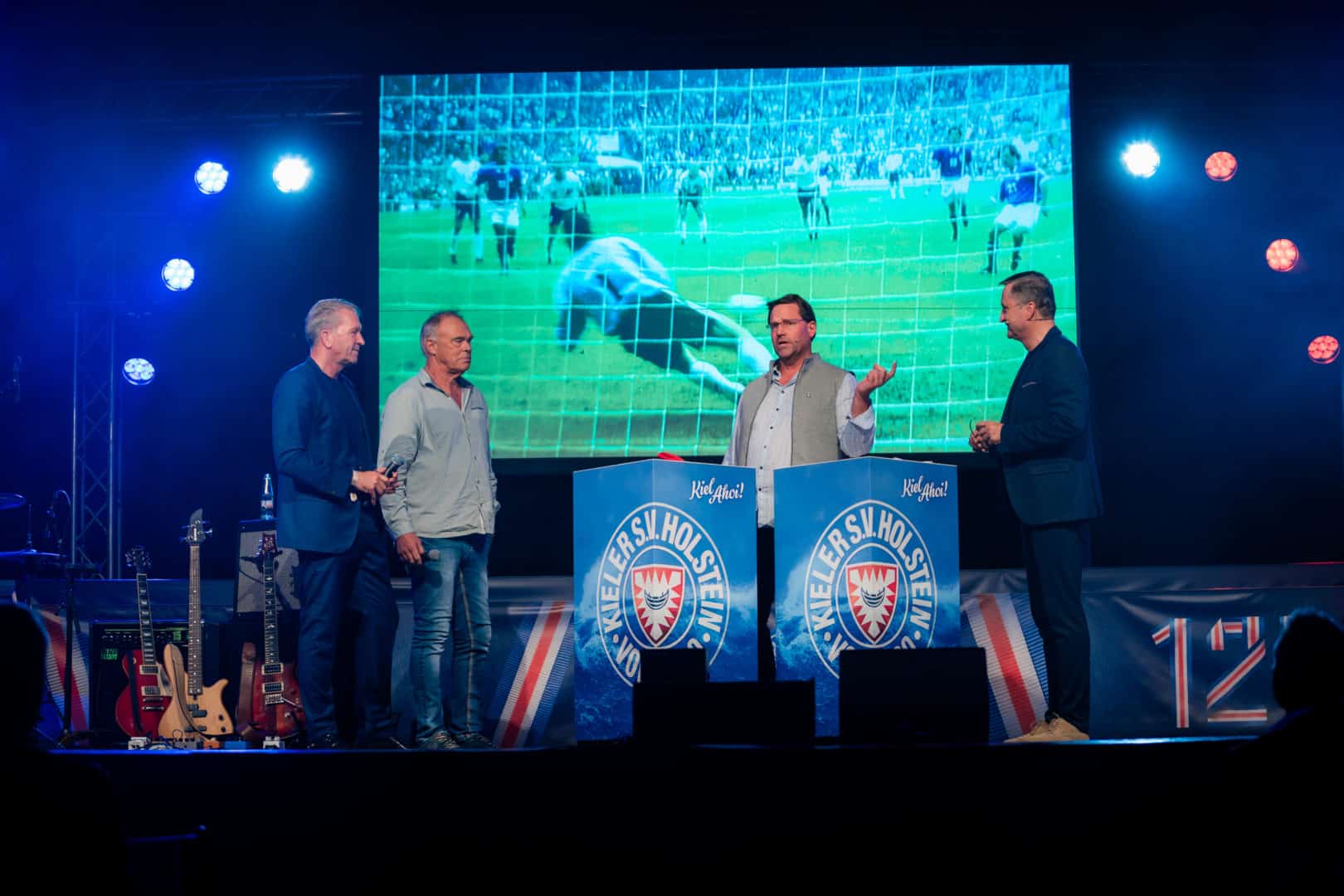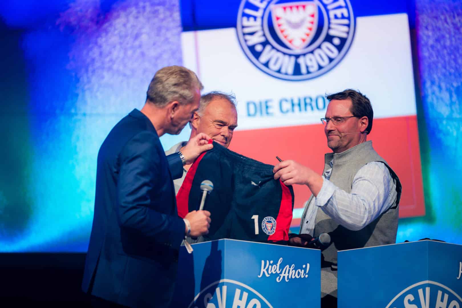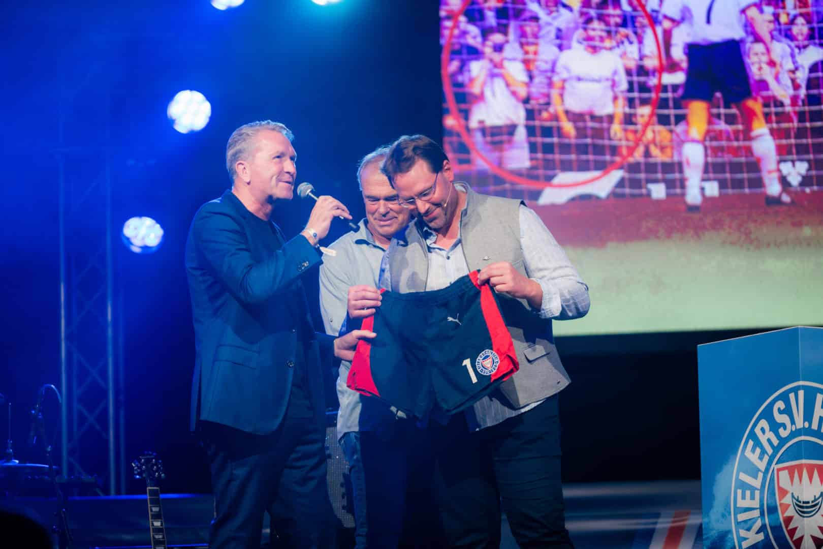 „Olympique Marseille, der 1. FC Nürnberg und jetzt Holstein Kiel: Drei meiner Ex-Klubs haben nun in der jüngeren Vergangenheit ihren 125. Geburtstag gefeiert. Das sind alles echte Traditionsvereine, die Höhen und Tiefen erlebt haben und deren Fangemeinde stetig gewachsen ist. Diese Tradition bekommt man nicht geschenkt“, würdigte der ehemalige Weltklassetorhüter neben seinen früheren Vereinen auch unsere KSV im Rahmen der Jubiläumsfeier, bei der er zum Ende des Abends noch eine echte Überraschung erlebte. Denn unser Clubhistoriker Patrick Nawe präsentierte, als Köpke gerade mit Ex-Teamkollege Immo Stelzer auf der Bühne stand, die Hose des früheren Holstein-Keepers, die er in seinem letzten Spiel für unsere Farben getragen hatte. „Du kannst mir doch nicht ernsthaft erzählen, dass ich das Ding anhatte. Das gibt’s nicht“, entgegnete Köpke lachend. Ein echtes Highlight der großen Geburtstagsfeier – aber seht selbst: Die Szene gibt’s hier noch einmal im Video ⬇️