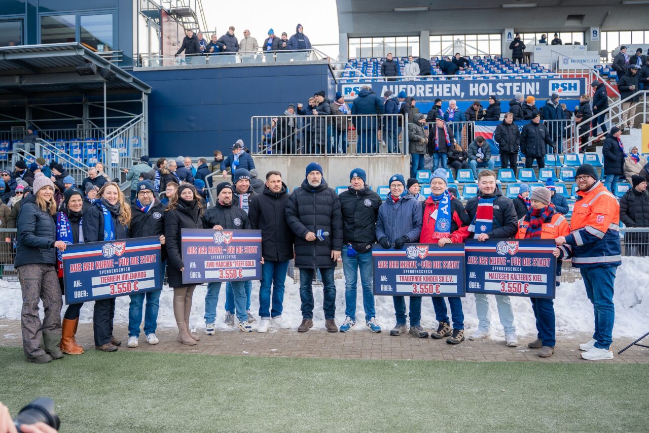 Im Vorfeld unseres Heimspiels gegen den FC Schalke 04 erfolgte dann die Scheckübergabe an die Kieler Organisationen. Die Einnahmen von über 14.000 Euro wurden an das Tierheim Uhlenkrog, den Malteser Kältebus Kiel, den AWO Mädchen*Treff Gold und Trauernde Kinder SH gespendet.