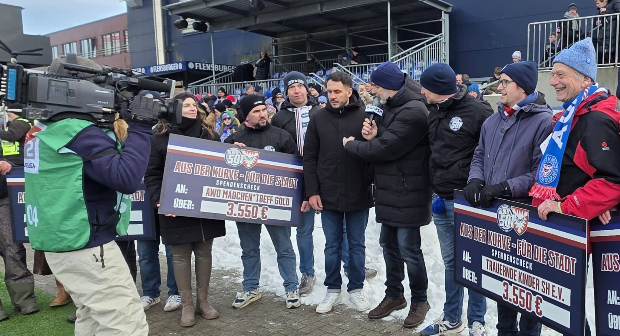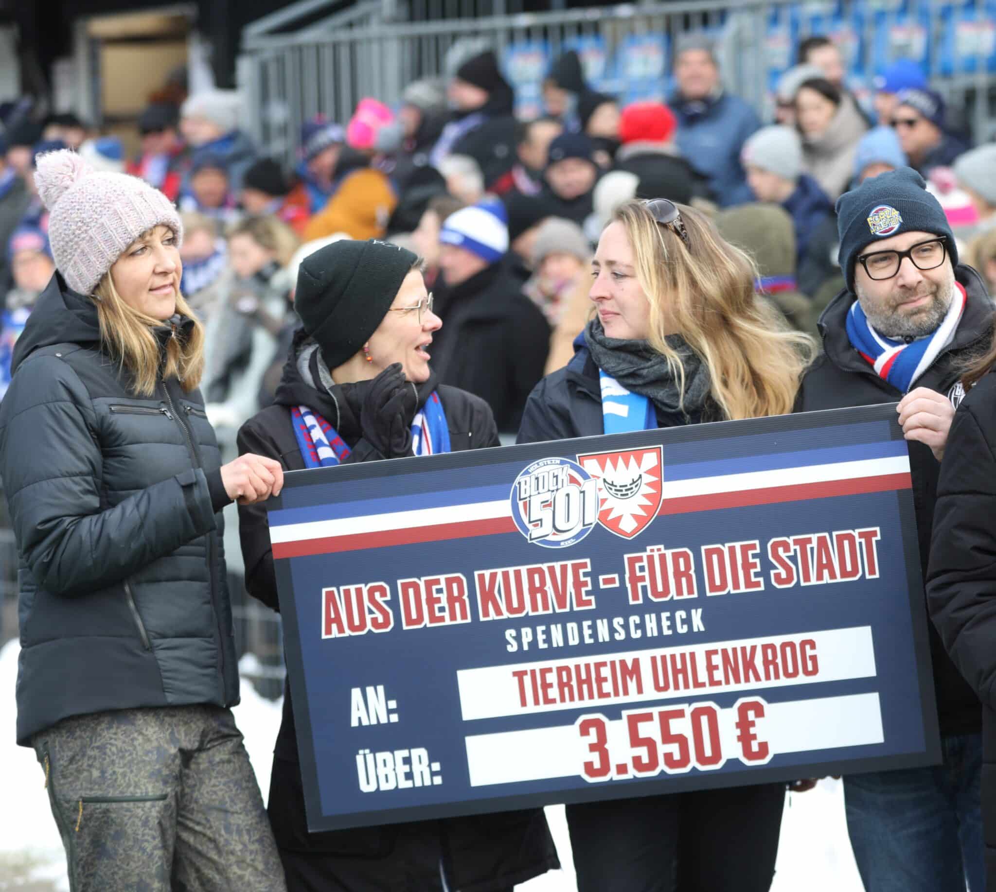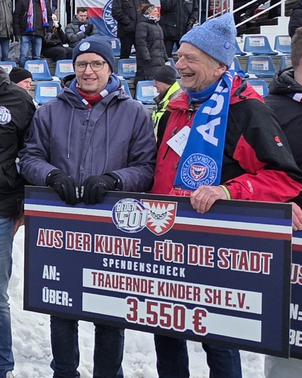 Im Dezember hatte der Fandachverband der KSV auf einem stimmungsvollen Weihnachtsmarkt vor dem Holstein-Stadion gemeinsam mit zahlreichen Fan-Gruppen der Störche mit vielfältigen Marktständen Spenden gesammelt – stolze 14.200 Euro kamen dabei zusammen. Diese Summe wurde nun an vier Kieler Einrichtungen übergeben, die in der Region wertvolle Arbeit leisten: den Kältebus der Malteser, das Tierheim Uhlenkrog, den Verein „Trauernde Kinder SH e.V.“ sowie der „AWO-Mädchentreff Gold Kiel“.