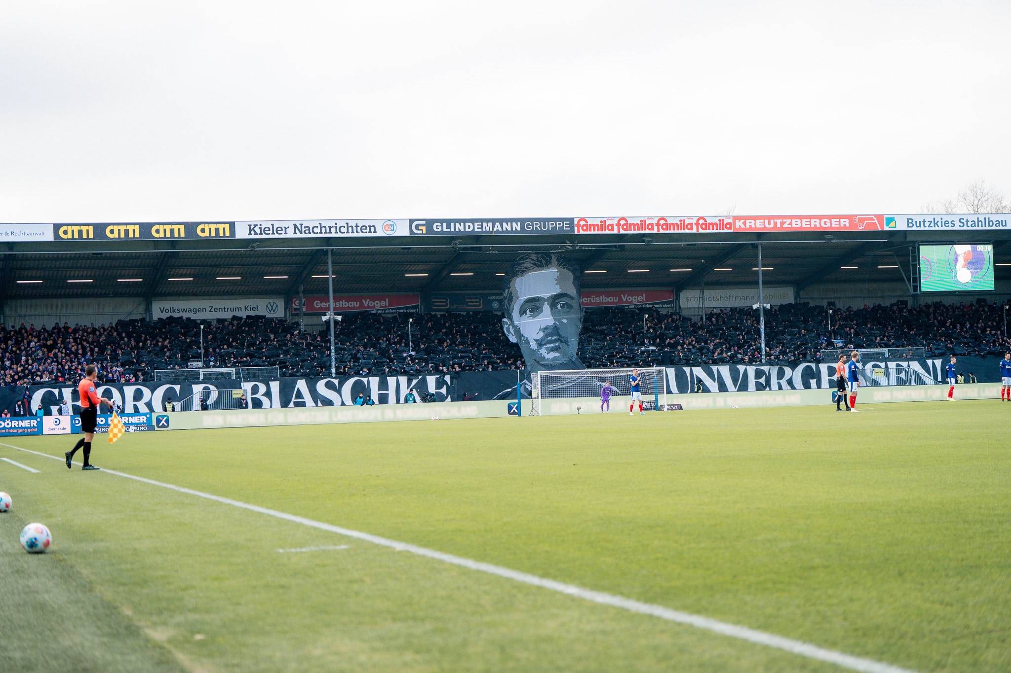 „Georg P. Blaschke – unvergessen“, prangte es auf großen weißen Lettern vor dem Anpfiff auf einem 80 Meter langen schwarzen Banner, das in der Mitte das Konterfei des Geburtstagskindes präsentierte: Holsteins Vereinsikone als knapp 20-Jähriger in der schmucken Ausgehuniform der „Einjährig-Freiwilligen“ des kaiserlichen Heeres um 1895. Für die junge Generation war es damals eine Möglichkeit, unmittelbar nach der Schulzeit und vor Beginn des Studiums oder einer Berufskarriere einen Dienst beim Militär abzuleisten. Die „Einjährig-Freiwilligen“ waren eine soziale und militärische Institution, die gut gebildete junge Männer in das Offizierskorps integrierte und gleichzeitig die Armee mit qualifizierten Führungskräften versorgte, wenn auch mit beträchtlichen Eigenkosten für die Freiwilligen. So wie auch für Georg P. Blaschke.