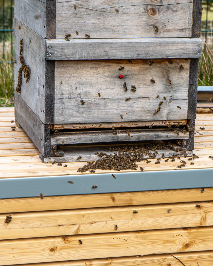 „Nach dem Umzug aus dem Winterlager haben die Bienen ein bis zwei Tage gebraucht, um die neue Umgebung auszukundschaften und sich zu akklimatisieren. Aber seitdem fühlen sie sich hier heimisch“, blickt Utha Bonowsky von der Stadtimkerei Kieler Honig auf die Ankunft der Bienen auf dem Trainingsgelände der KSV zurück.