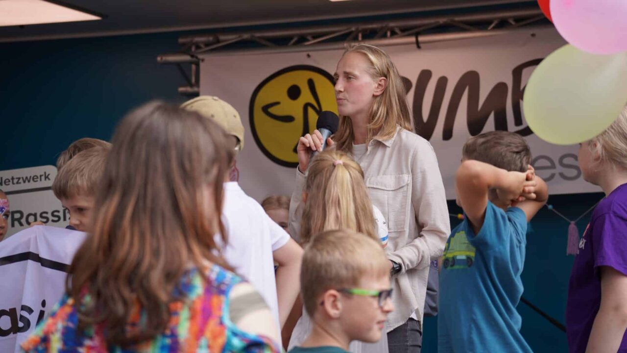Jasmin Grosnick von unseren Holstein Women übernahm dabei die Patenschaft: „Ich freue mich riesig, heute hier sein zu dürfen. Ich bin überwältigt von der großen Anzahl an Menschen – damit hatte ich gar nicht gerechnet. Es ist wirklich beeindruckend, was ihr hier auf die Beine gestellt habt. Vielen Dank, dass ich Teil davon sein darf. Ich finde es großartig, dass ihr dieses Projekt umsetzt und ein Zeichen für Vielfalt setzt – an eurer Schule, in euren Klassenräumen und in unserer Gesellschaft. Damit sich hier jeder willkommen und wohlfühlen kann.“