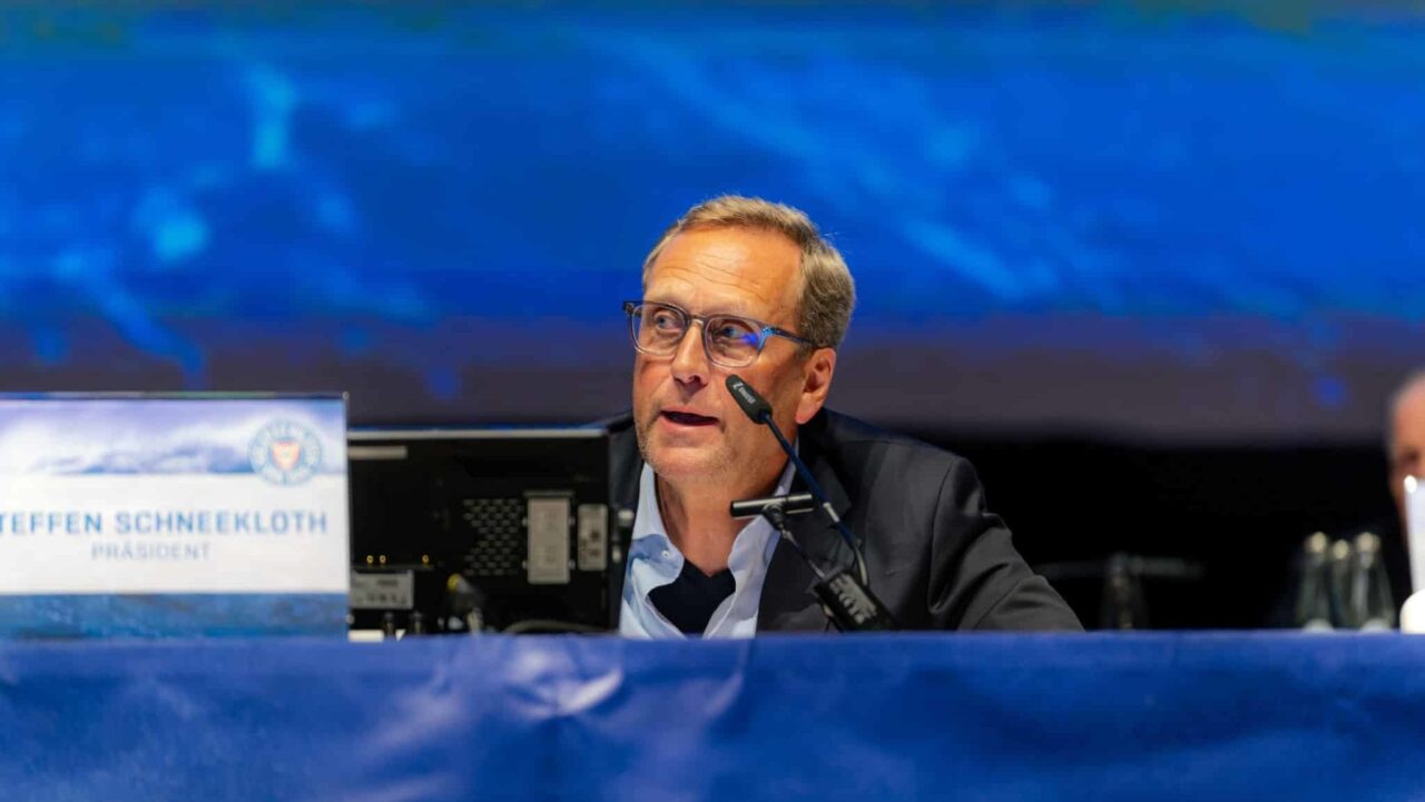 KSV-Präsident Steffen Schneekloth bei der Mitgliederversammlung von Holstein Kiel.